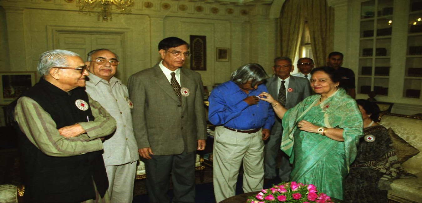 The President of India, Dr A P J Abdul Kalam with the Members of the Managing Body of Indian Red Cross Society, National Capital Territory Branch to pining a Flag on the occasion of their Flag Week at the Committee Room of Rashtrapati Bhavan in New Delhi on Nov 01, 2002