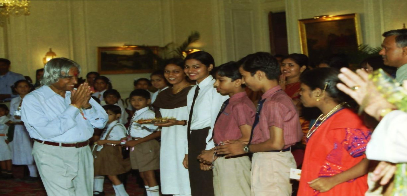 The President of India, Dr A P J Abdul Kalam receiving the Raksha Bandhan Greetings from Children and others at the Rashtrapati Bhavan in New Delhi on Aug 12, 2003