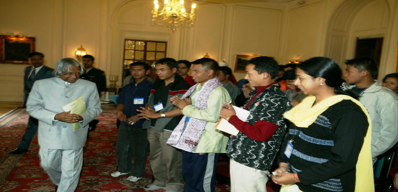 The Students from North-Eastern States participating in the India Tour Experience organised by the Akhil Bharatiya Vidyarthi Parishad calling on the President of India, Dr A P J Abdul Kalam at the Yellow Drawing Room of Rashtrapati Bhavan in New Delhi on Jan 15, 2004