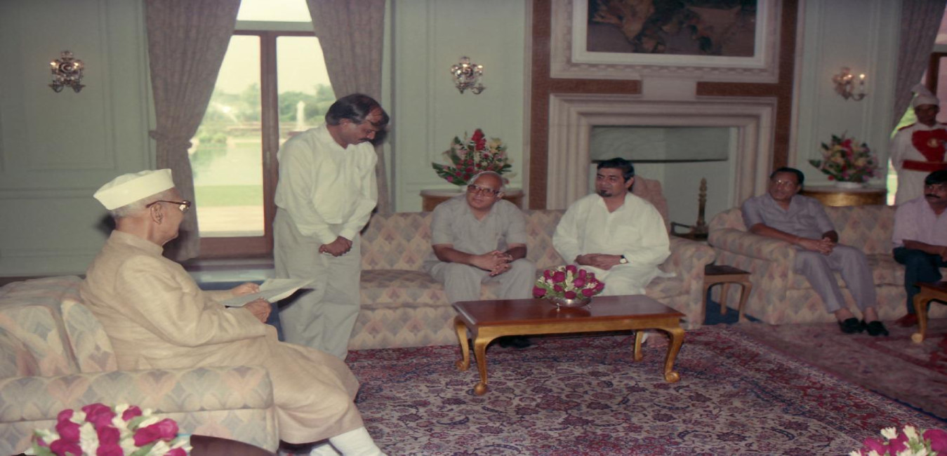 The President of India, Dr. Shankar Dayal Sharma meeting with Chief Minister of Assam, Shri Hiteswar Saikia at Rashtrapati Bhavan in New Delhi on August 22, 1994.