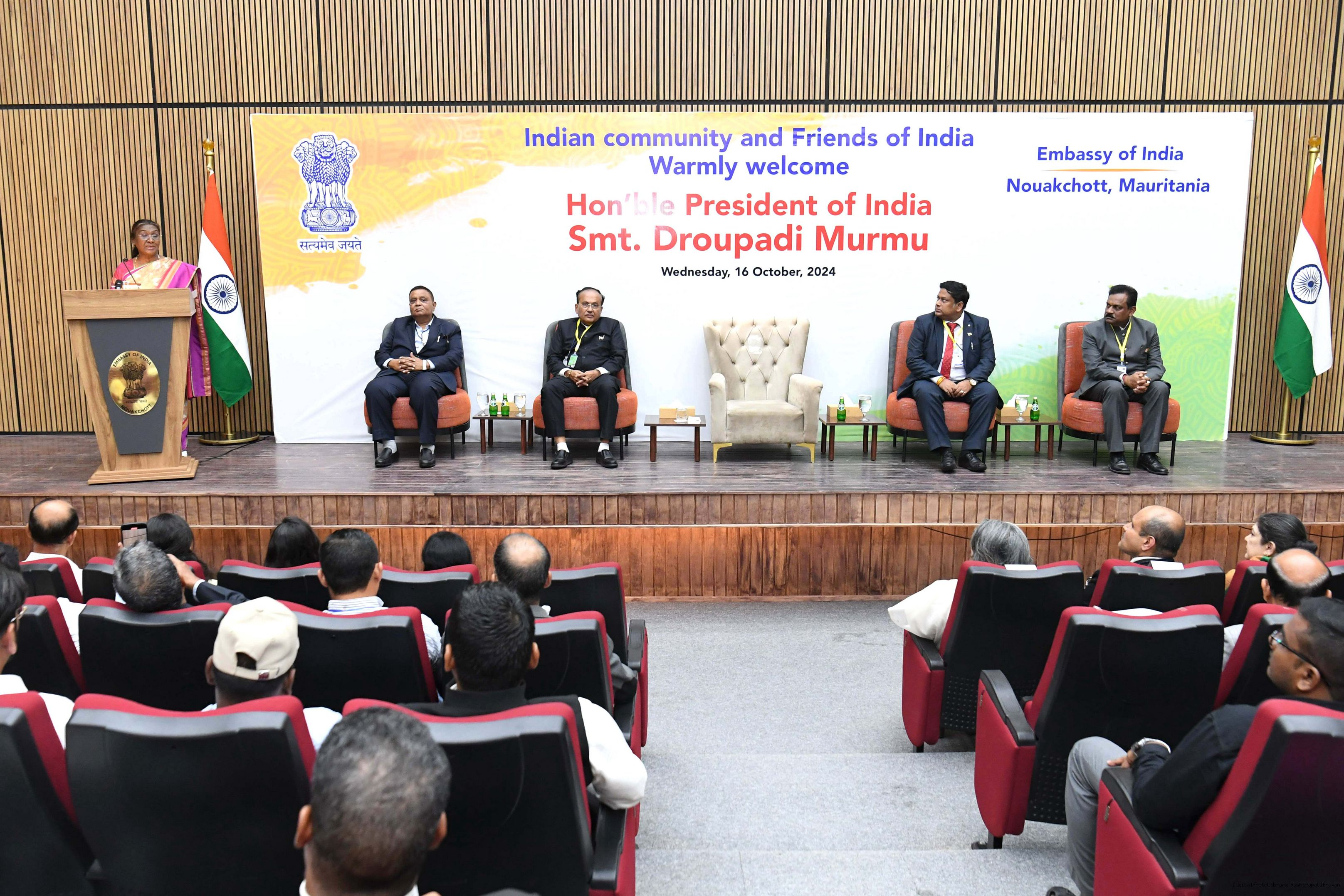 The President of India Smt. Droupadi Murmu was warmly received Indian community at a reception organized at Nouakchott Mauritania on October 16, 2024.