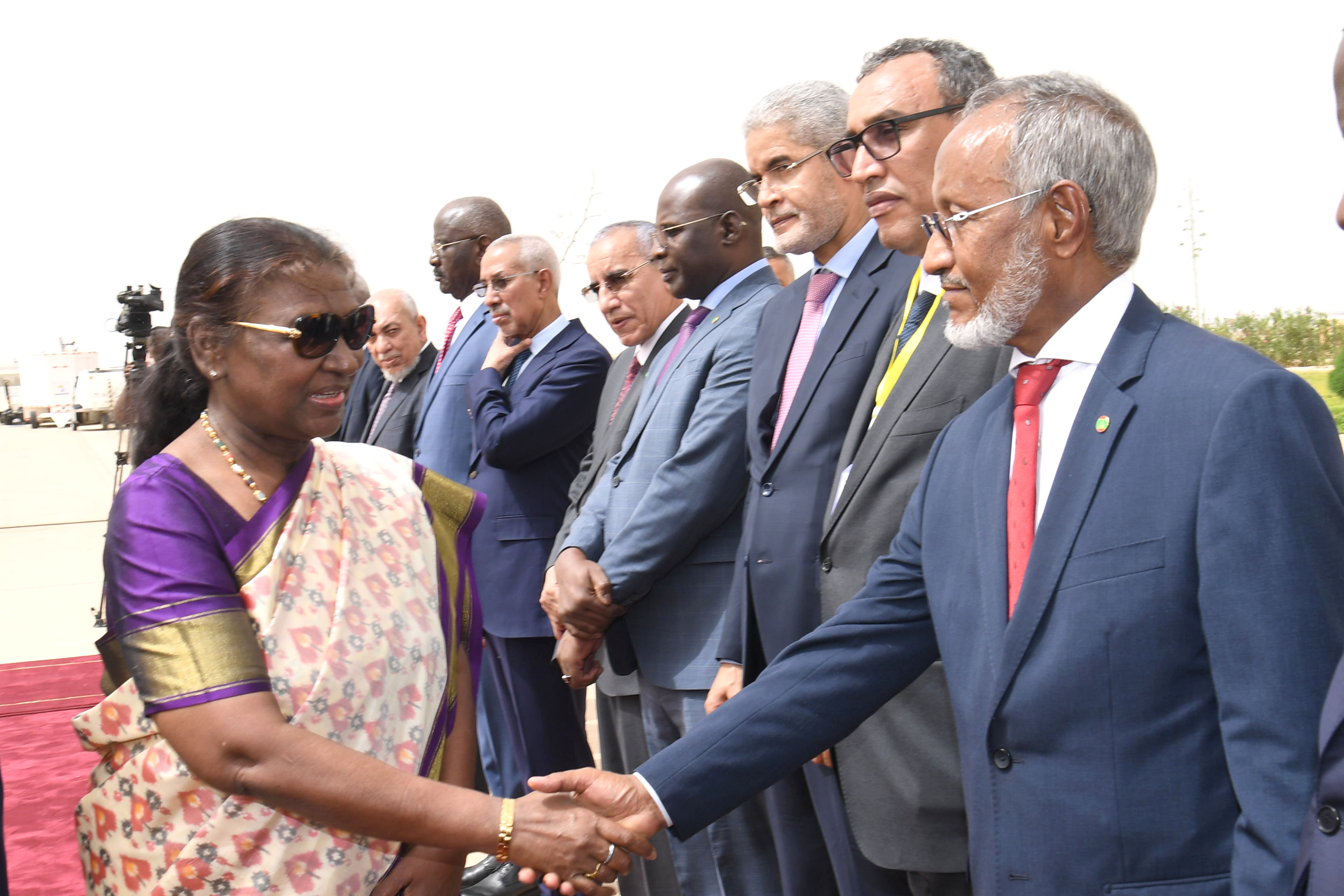 The President of Mauritania, H.E. Mr. Mohamed Ould Ghazouani received the President of India Smt. Droupadi Murmu on her arrival at Nouakchott-Oumtounsy International Airport on October 16, 2024.