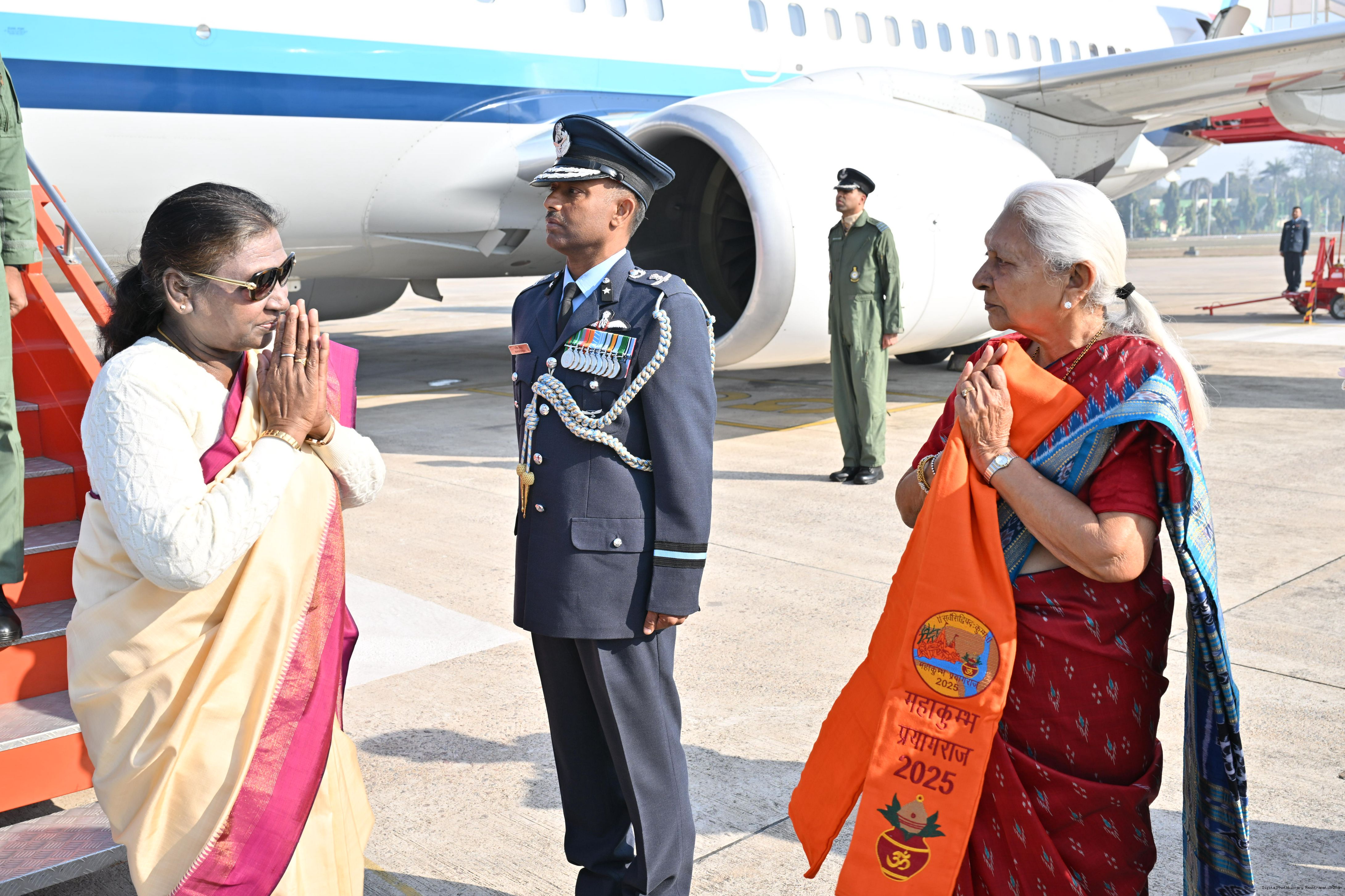The Governor of Uttar Pradesh, Smt. Anandiben Patel and Chief Minister Yogi Adityanath received the President of India Smt. Droupadi Murmu on her arrival at Prayagraj on February 10, 2025.