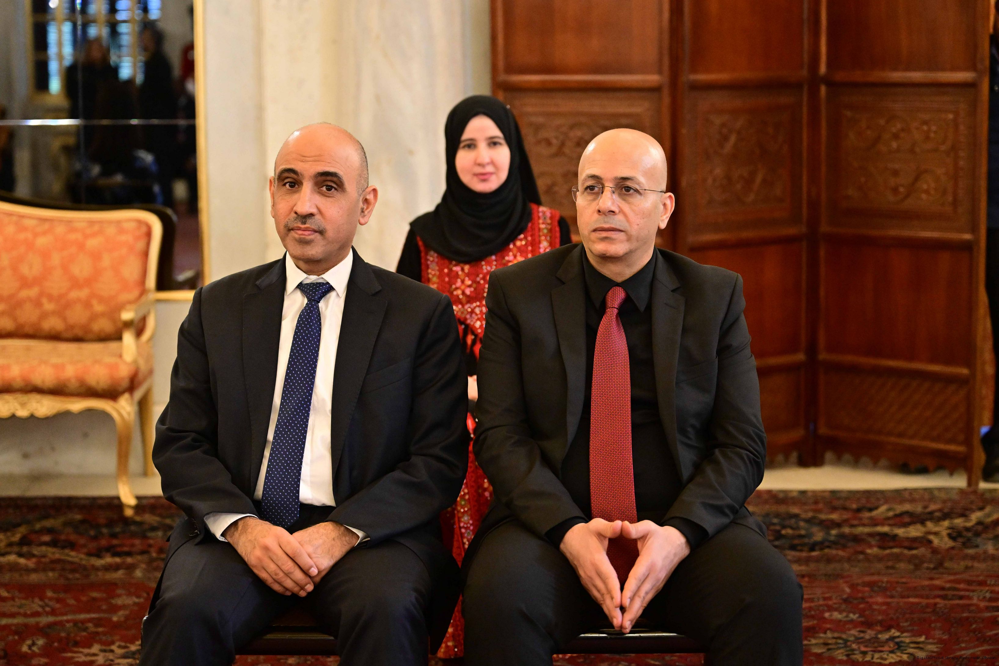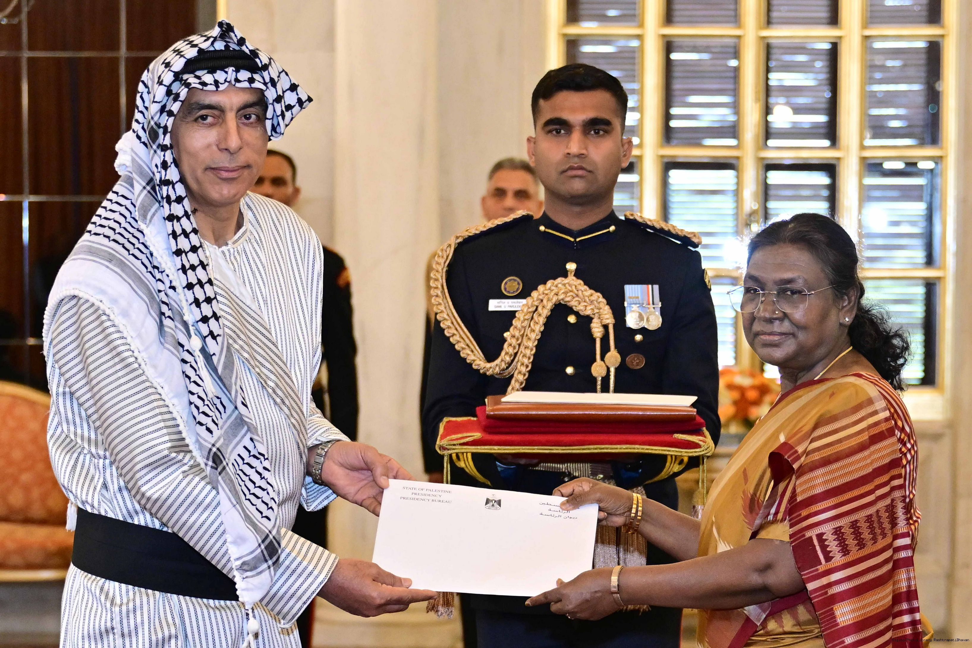 The High Commissioner-designate to the State of Palestine, H.E. Mr. Abdullah Mohammad A. Abushawesh presenting his credentials to the President of India, Smt Droupadi Murmu at Ashok Hall of Rashtrapati Bhavan in New Delhi on February 20, 2025.