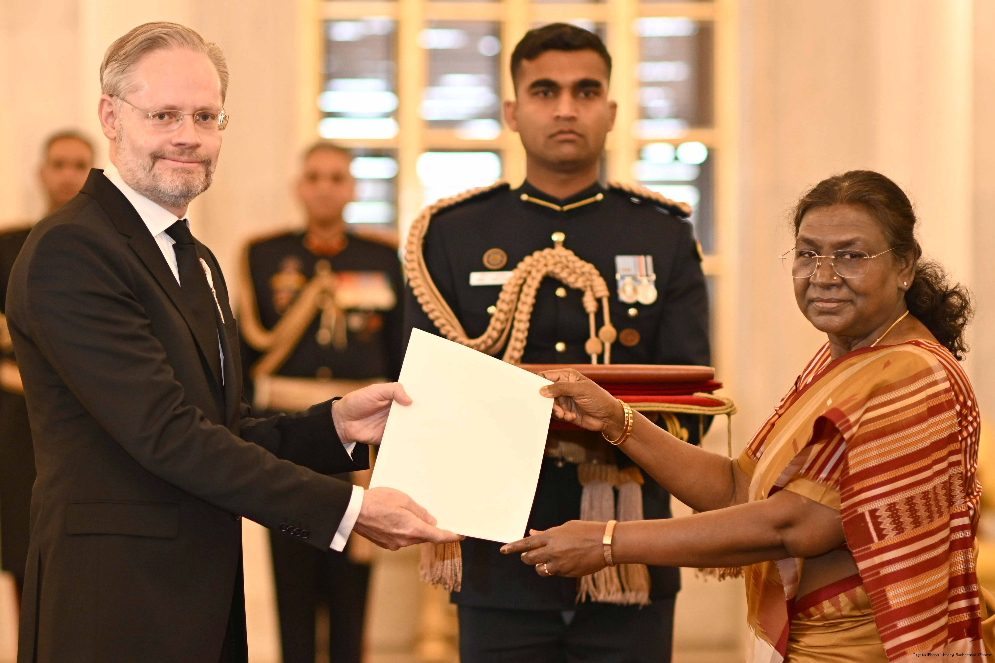 The Ambassador-designate of Denmark, H.E. Mr. Rasmus Abildgaard Kristensen presenting his credentials to the President of India, Smt Droupadi Murmu at Ashok Hall of Rashtrapati Bhavan in New Delhi on February 20, 2025.