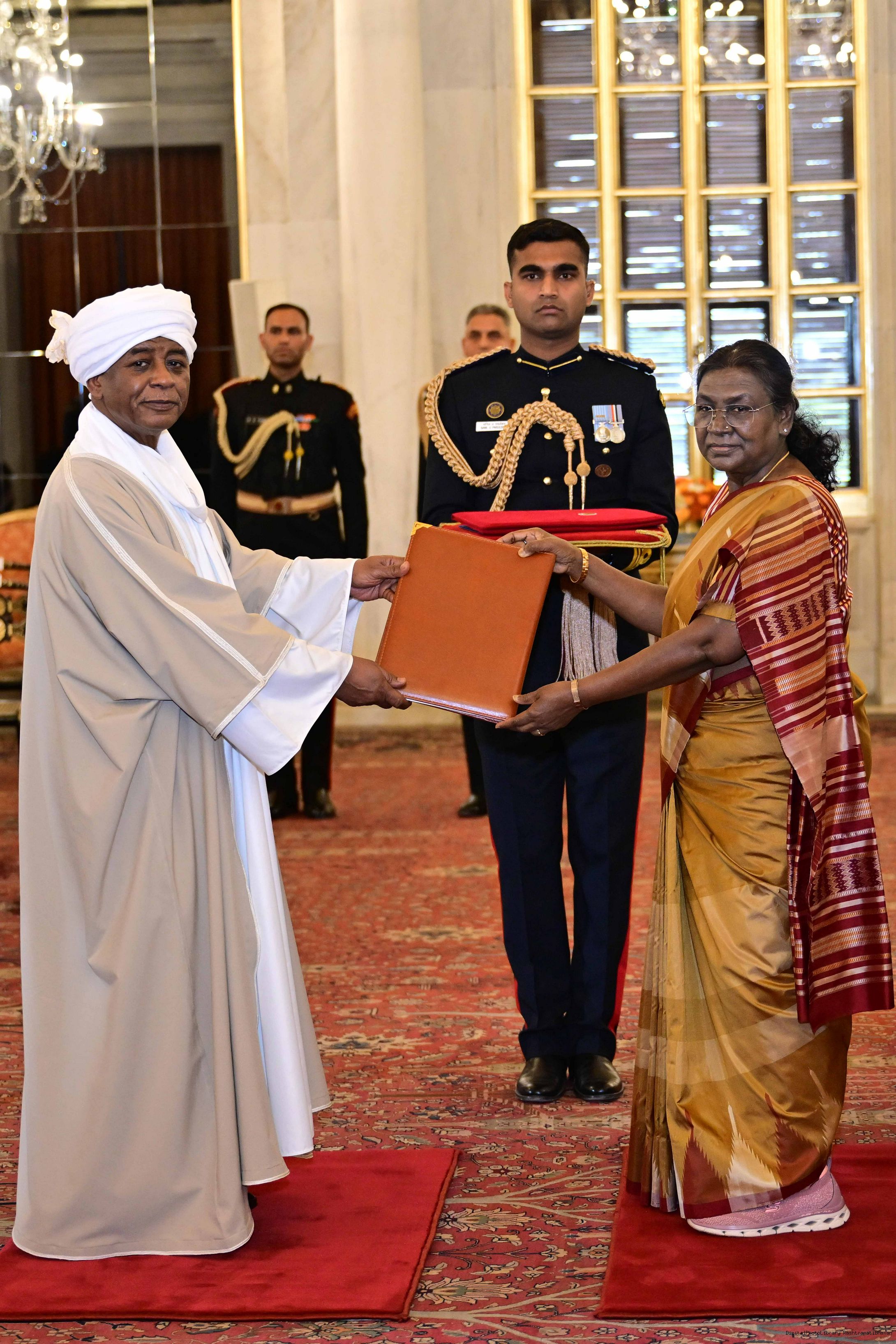 The Ambassador-designate of the Republice of Sudan, H.E. Mr. Mohammed Abdallahi Ali Eltom presenting his credentials to the President of India, Smt Droupadi Murmu at Ashok Hall of Rashtrapati Bhavan in New Delhi on February 20, 2025.