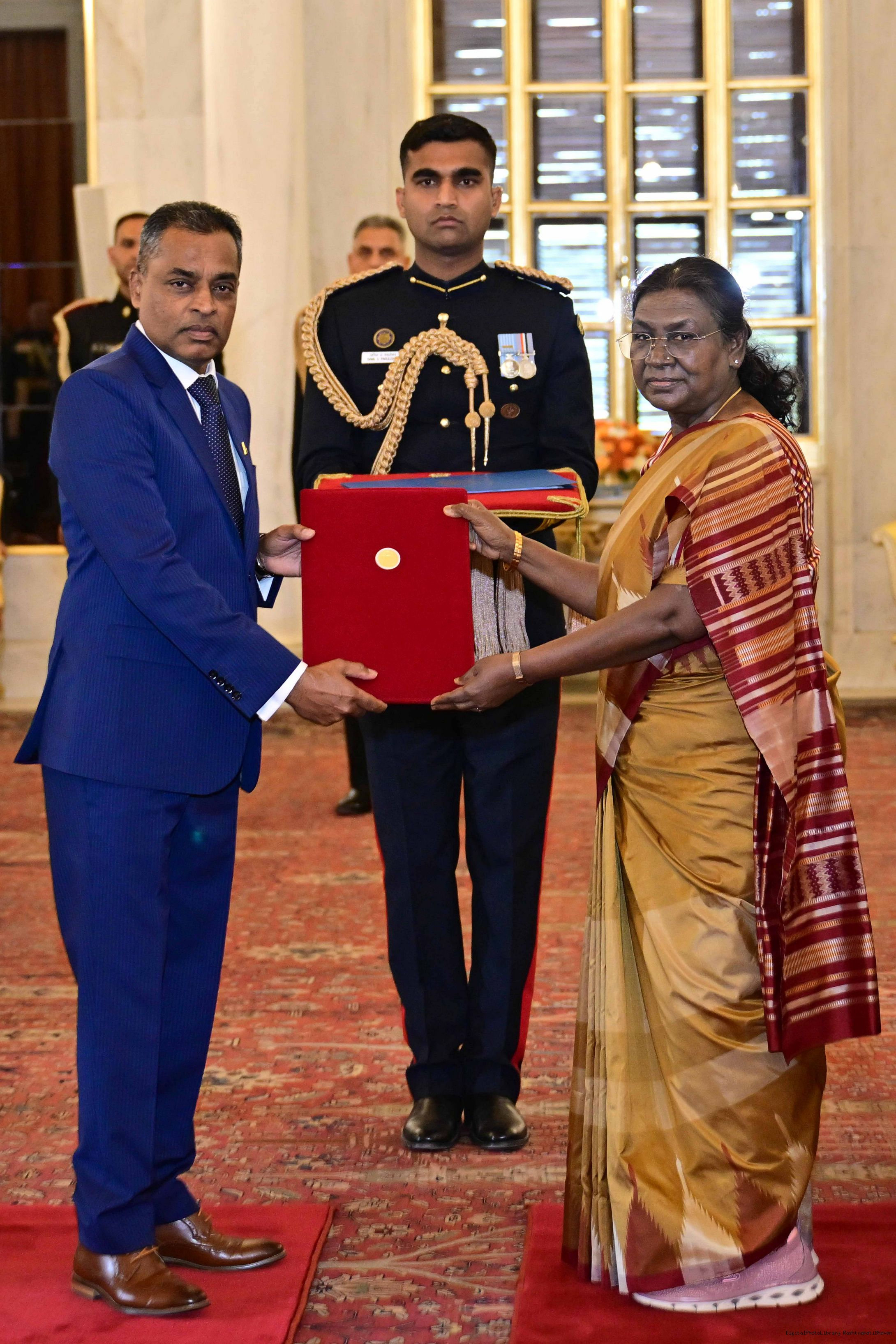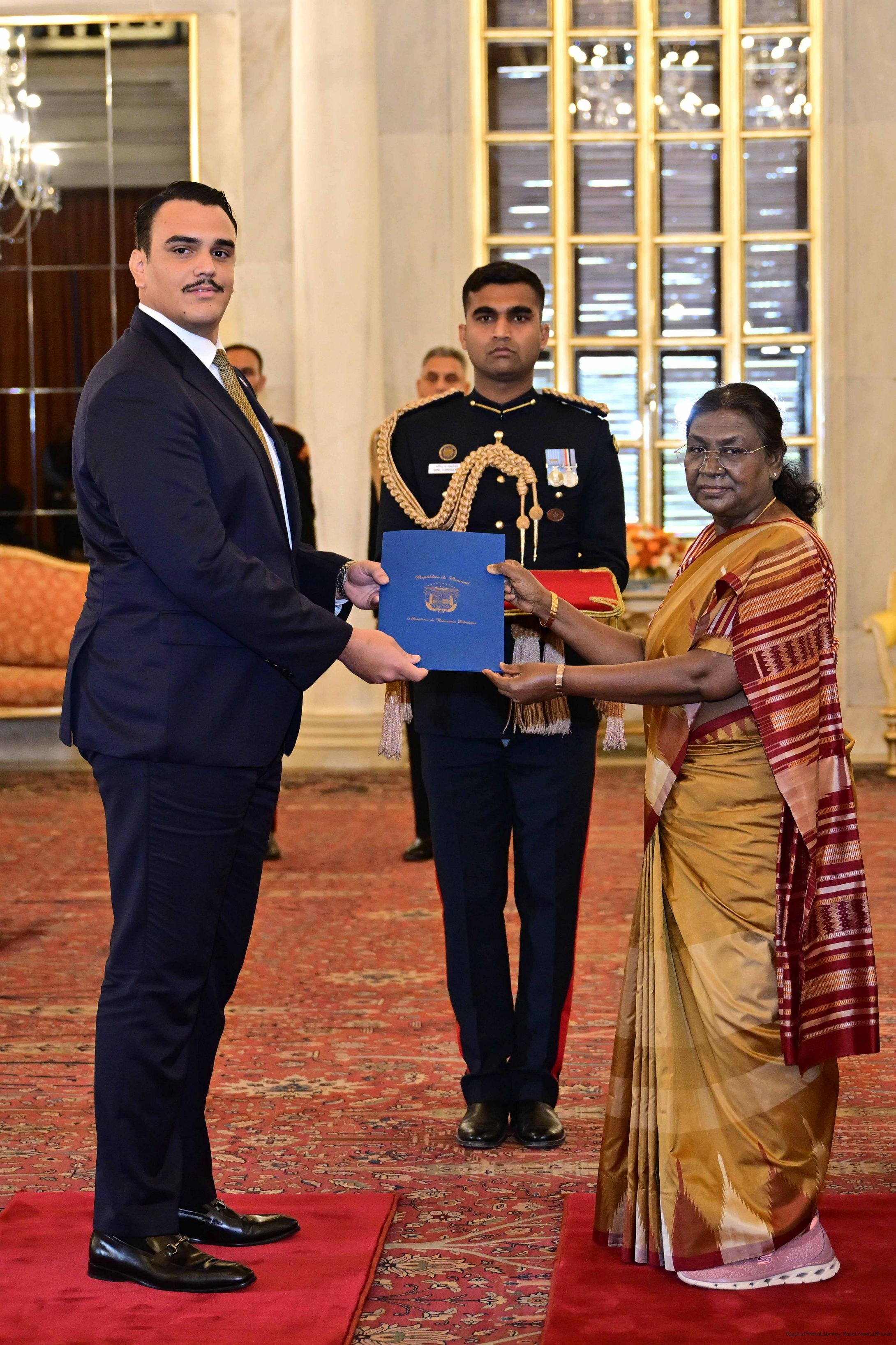 The High Commissioner-designate of the Cooperative Republic of Guyana, H.E. Mr. Dharamkumar Seeraj presenting his credentials to the President of India, Smt Droupadi Murmu at Ashok Hall of Rashtrapati Bhavan in New Delhi on February 20, 2025.