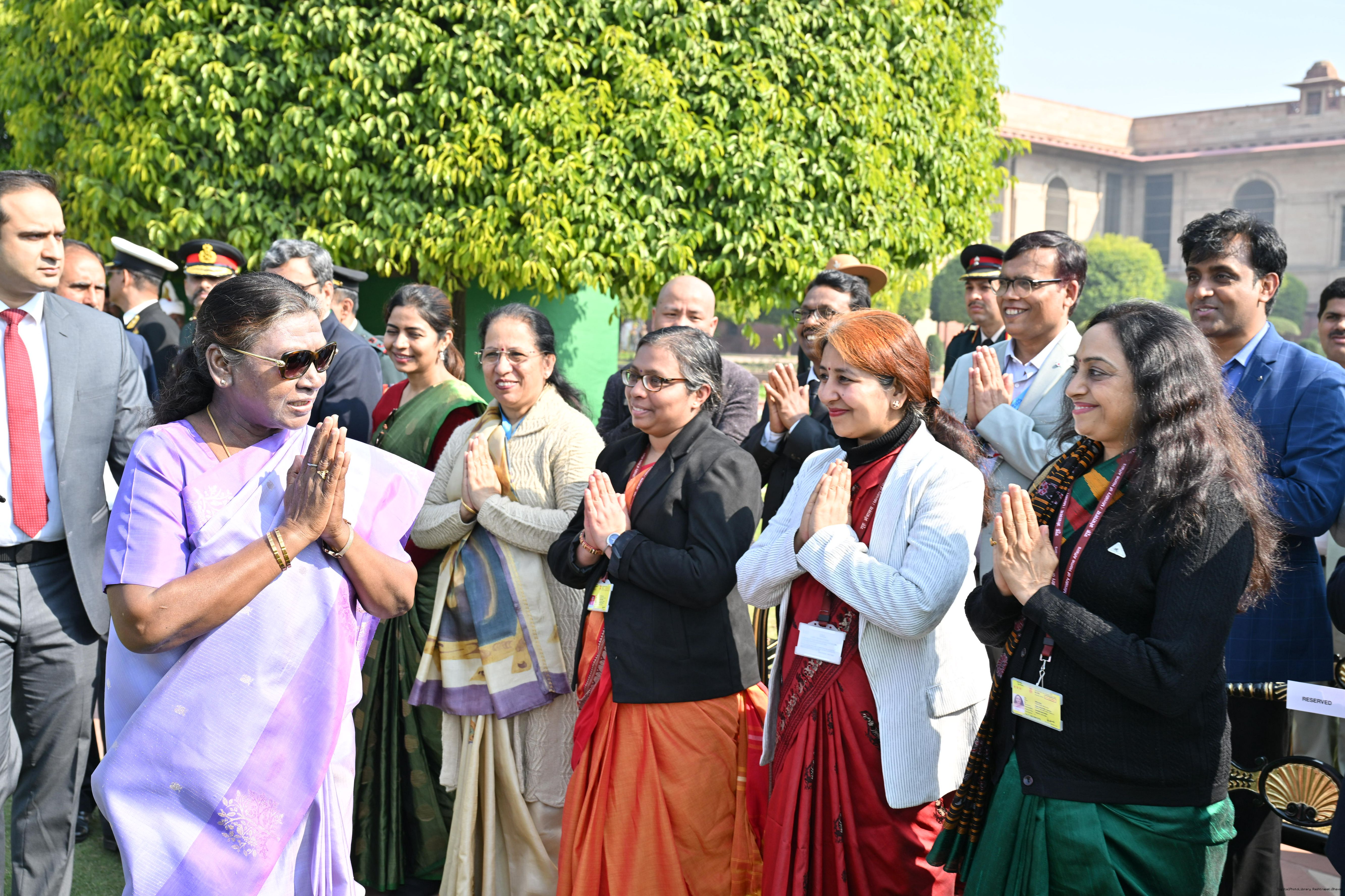 The President of India, Smt. Droupadi Murmu met and posing a group photographs tribal guests, tableaux artistes and tractor drivers, NSS volunteers and NCC cadets, officials and other participants of the Republic Day Parade 2025, at Rashtrapati Bhavan on January 28, 2025.