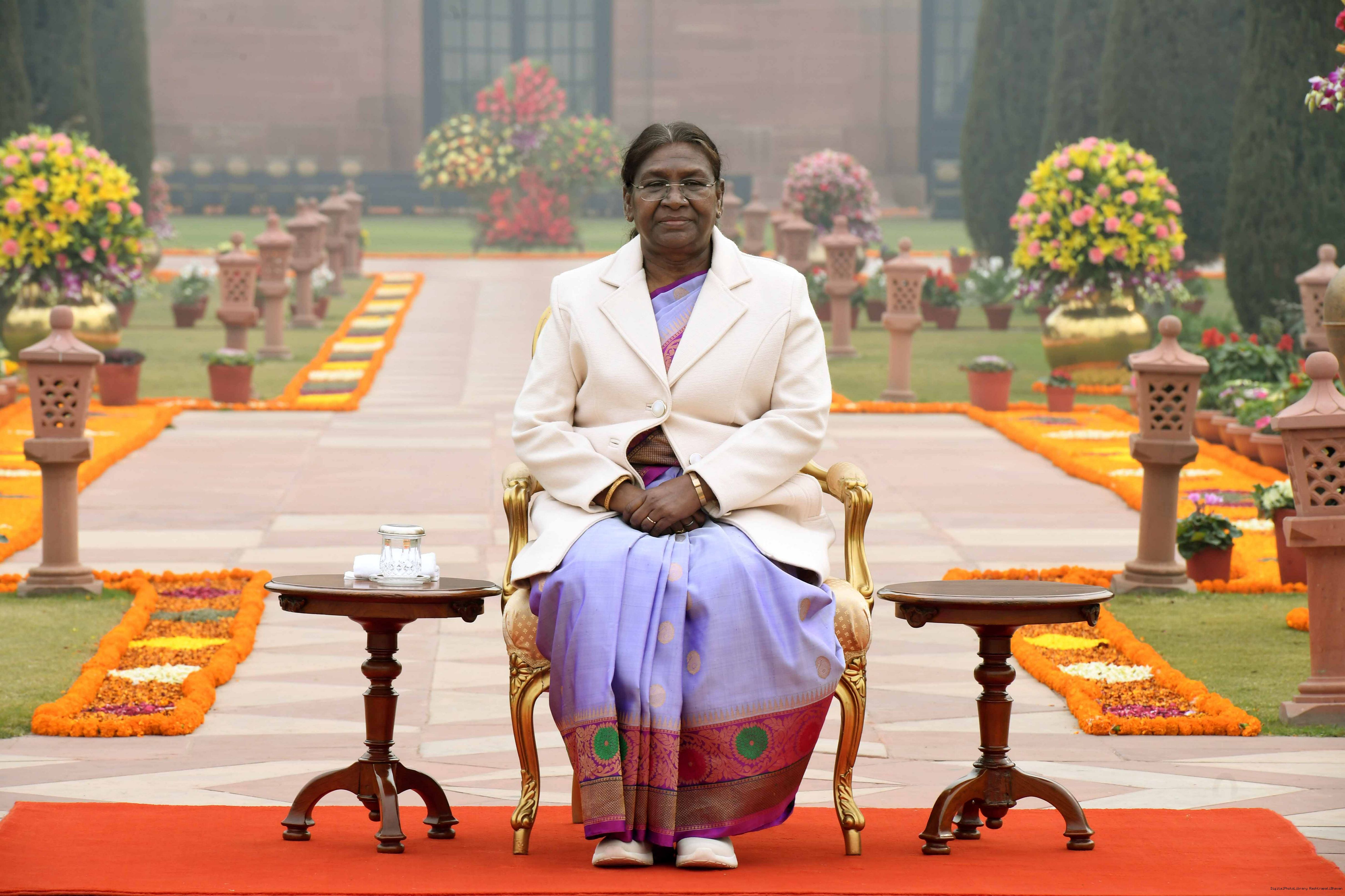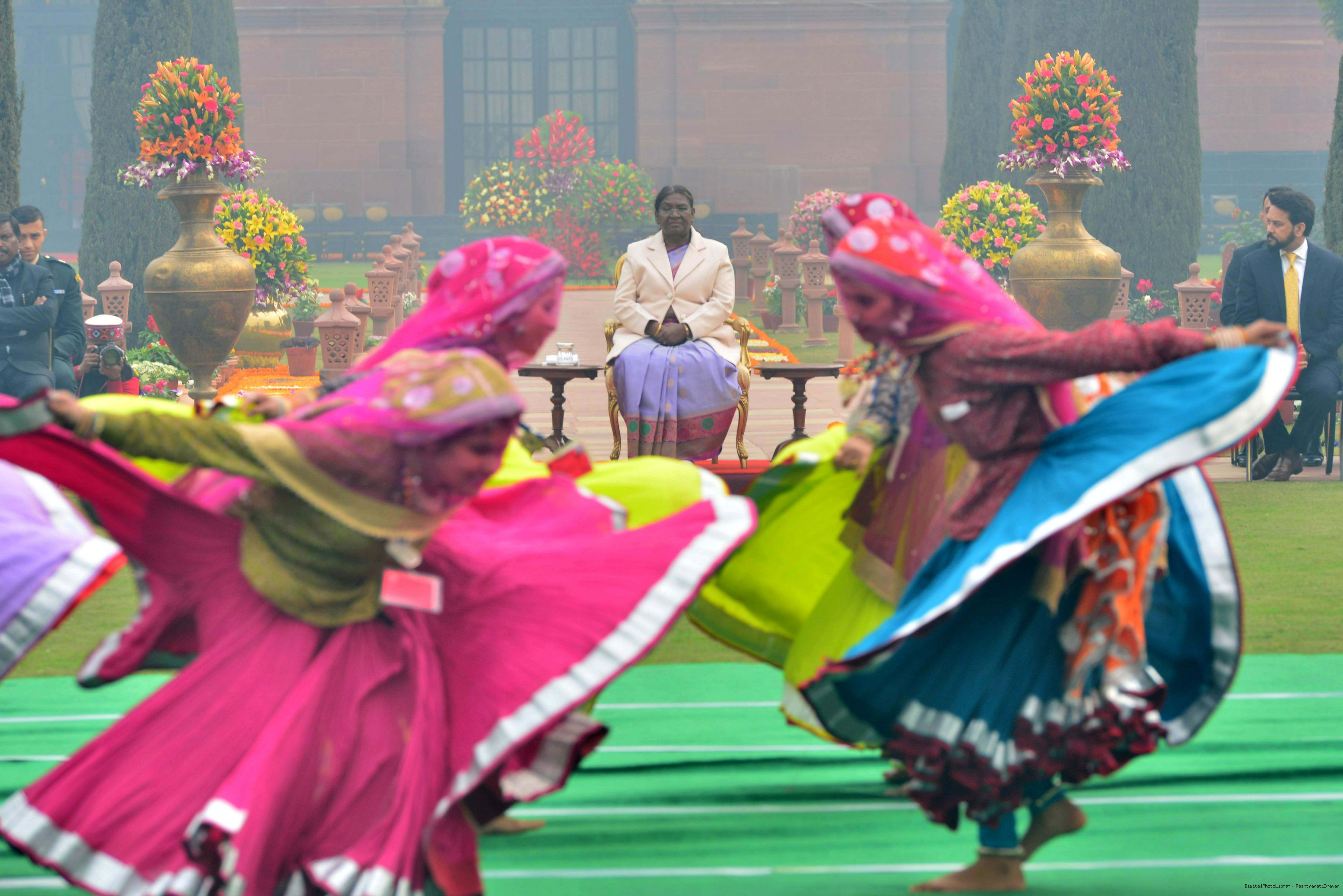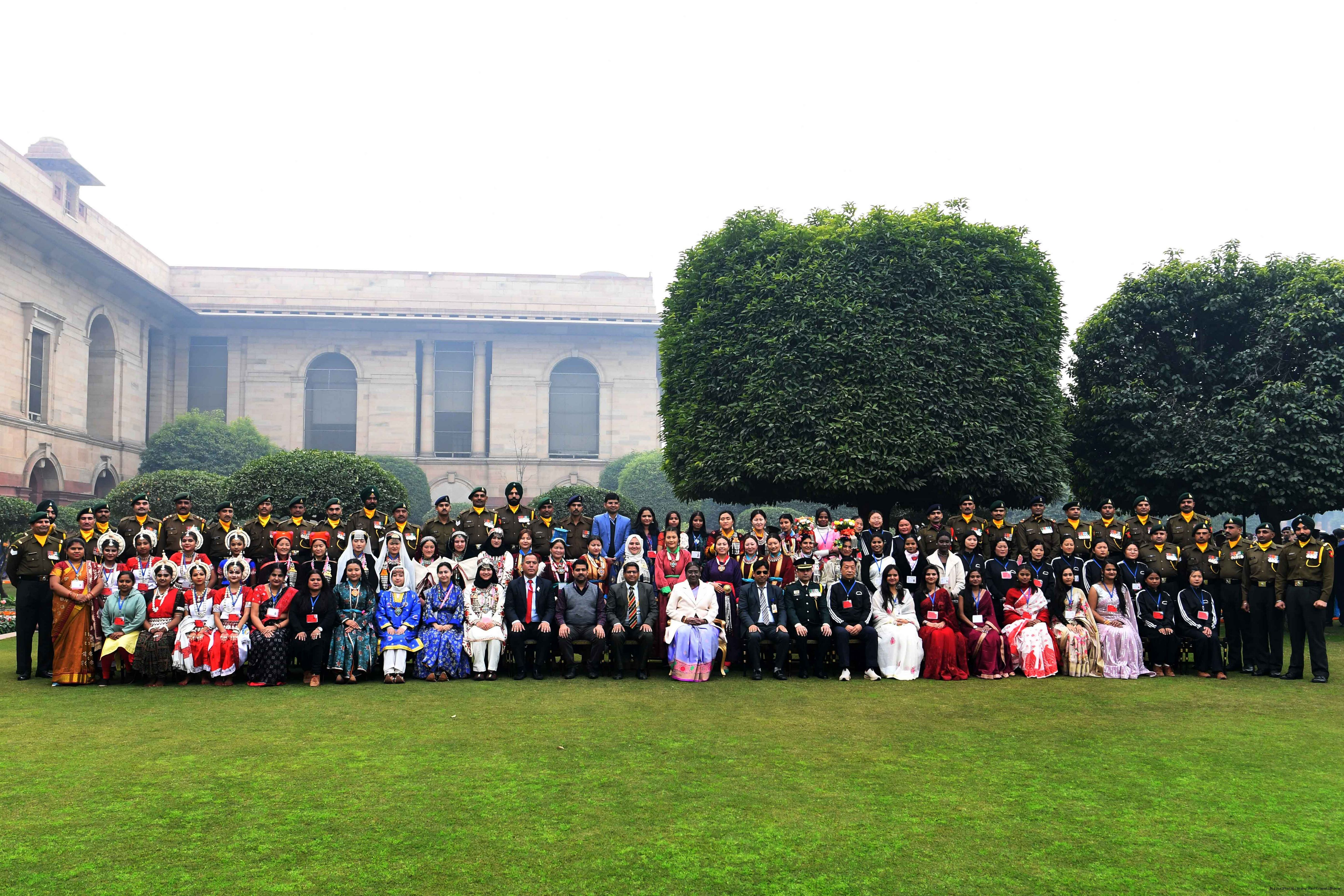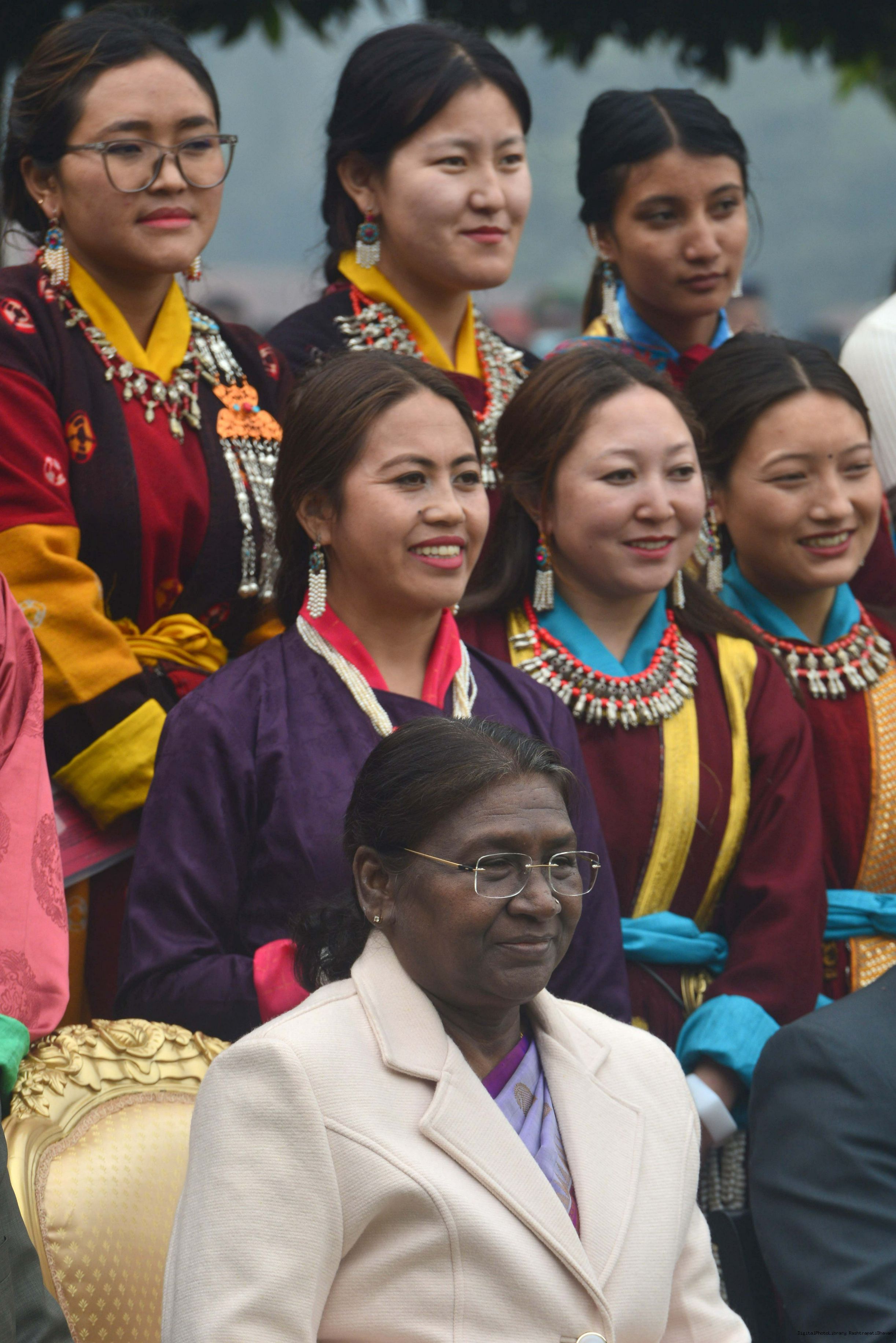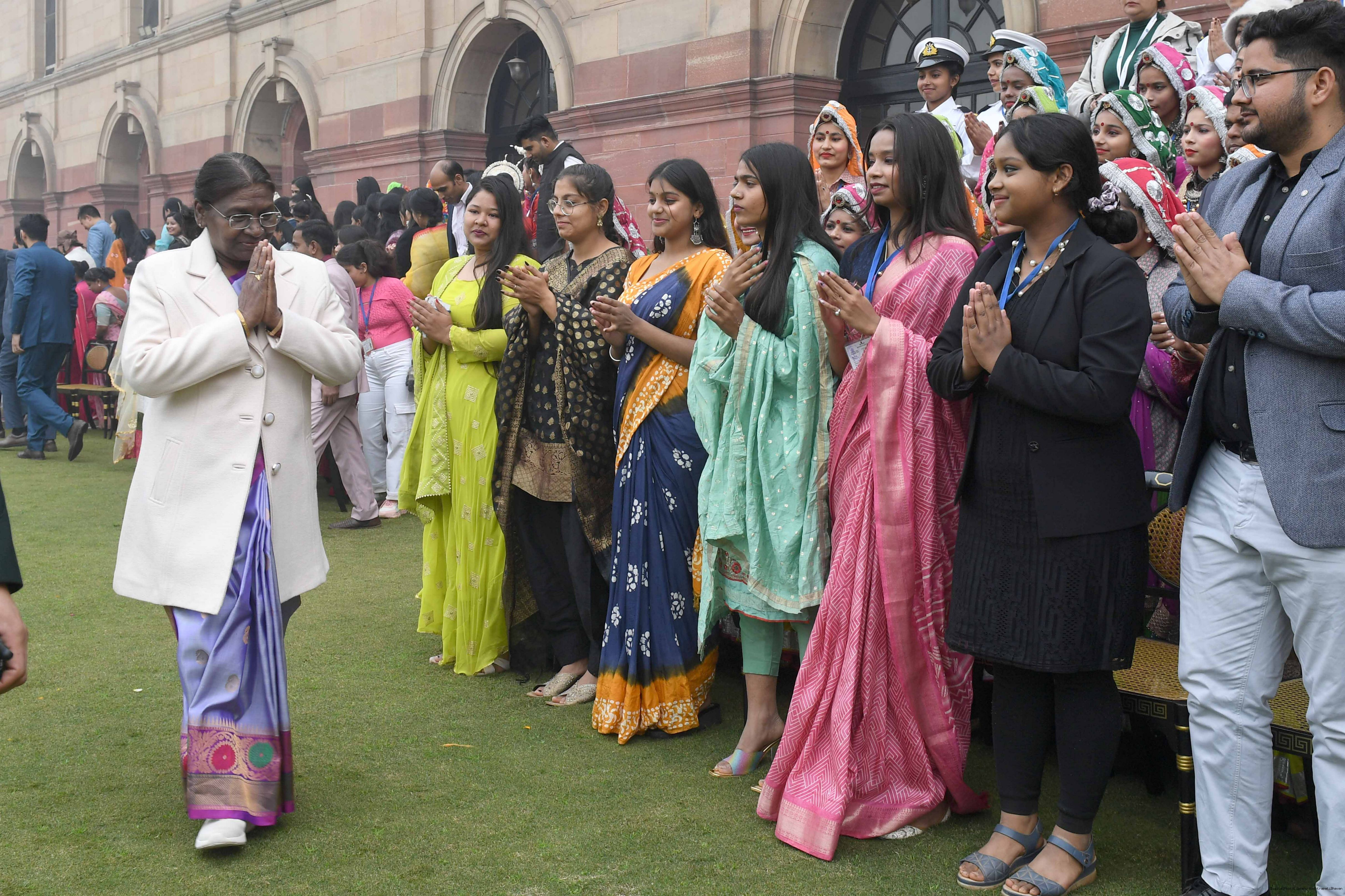 The President of India, Smt. Droupadi Murmu met tribal guests, tableaux artistes and tractor drivers, NSS volunteers and NCC cadets, officials and other participants of the Republic Day Parade 2024, at Rashtrapati Bhavan on January 28, 2024.