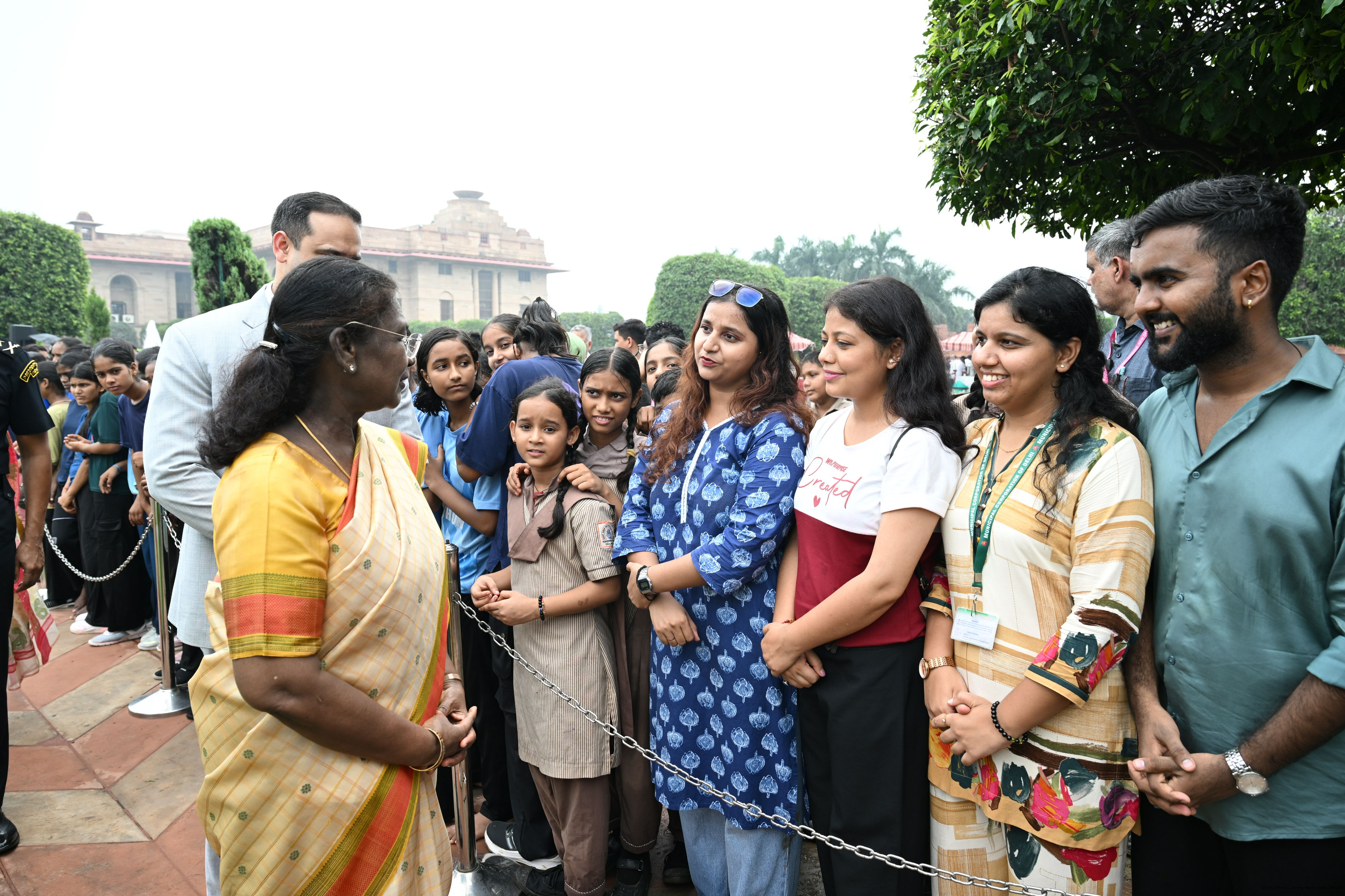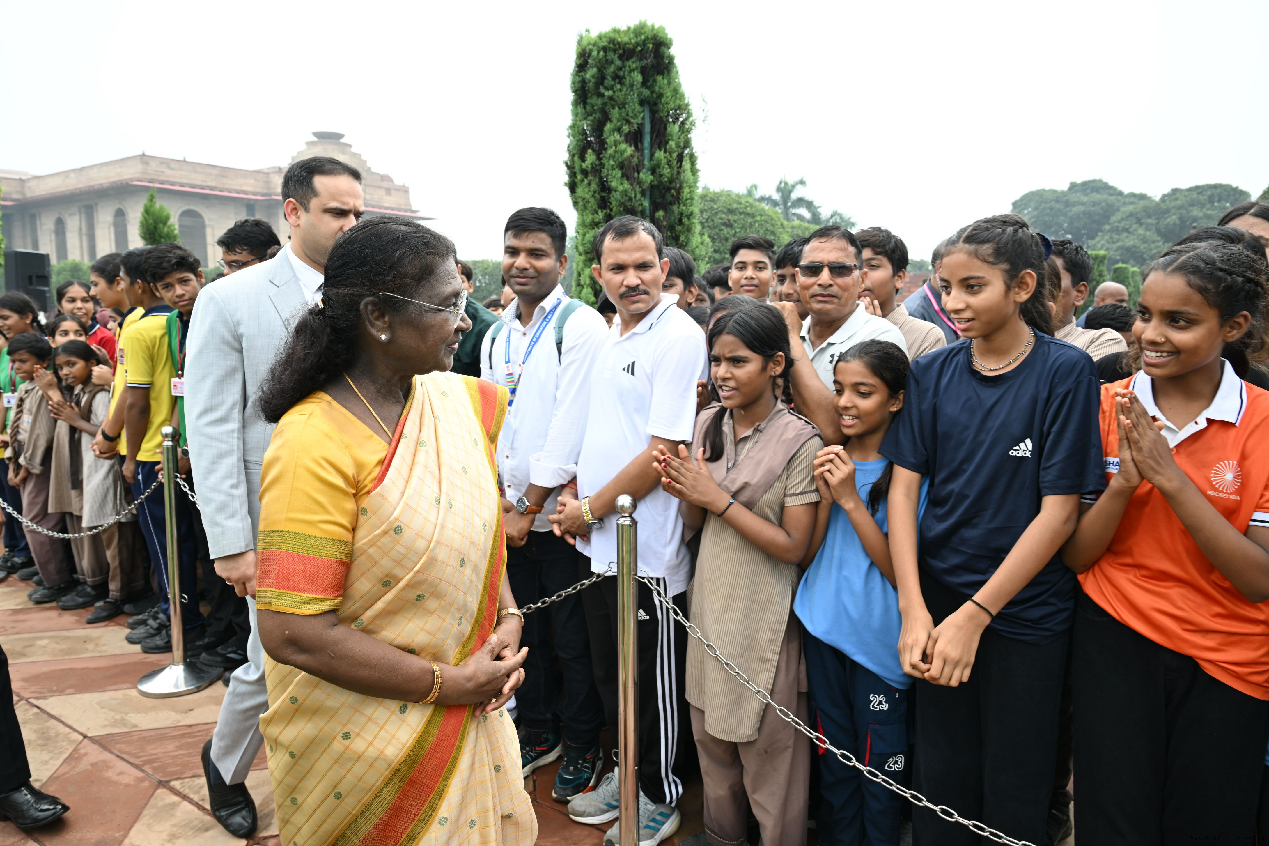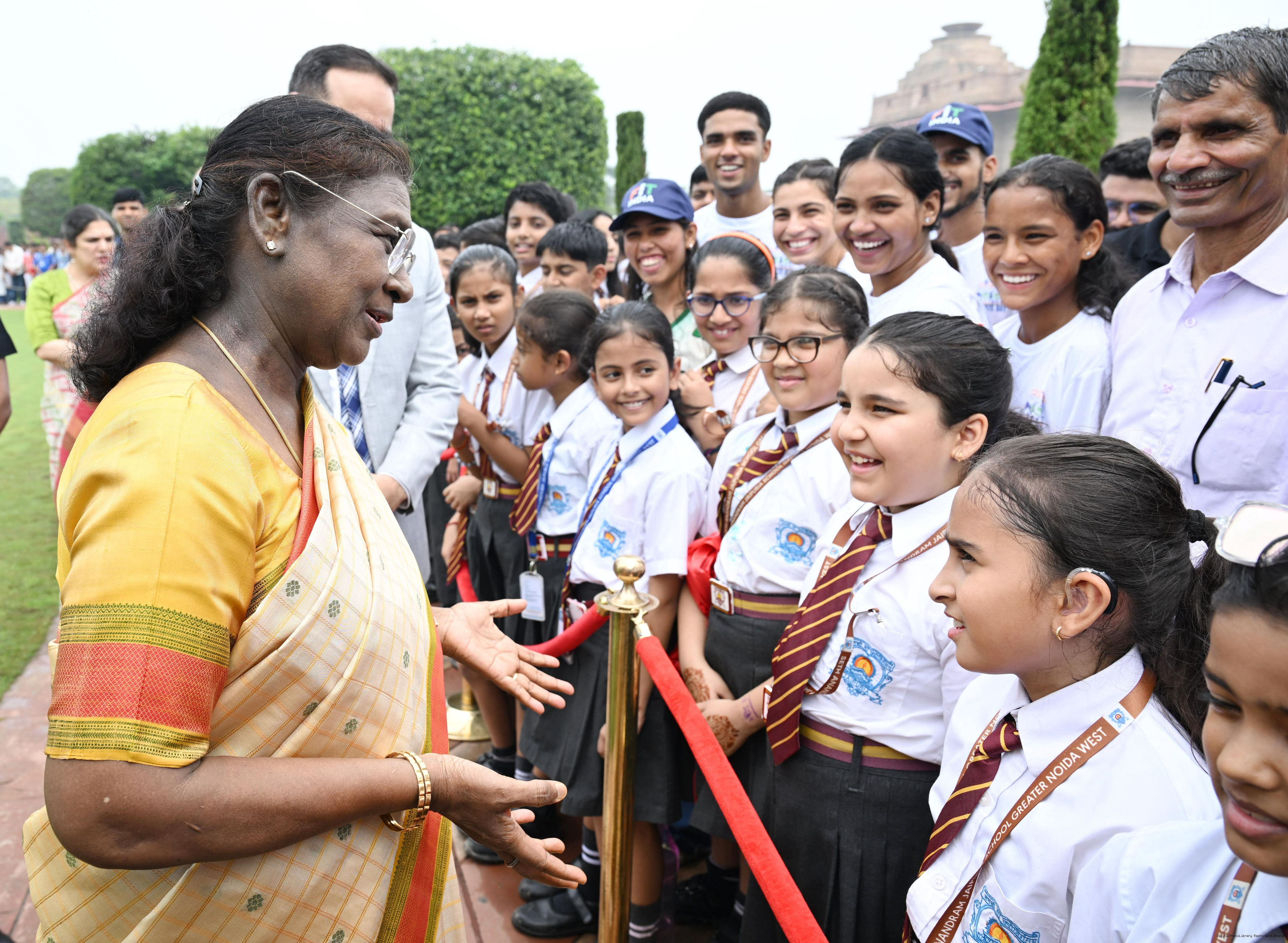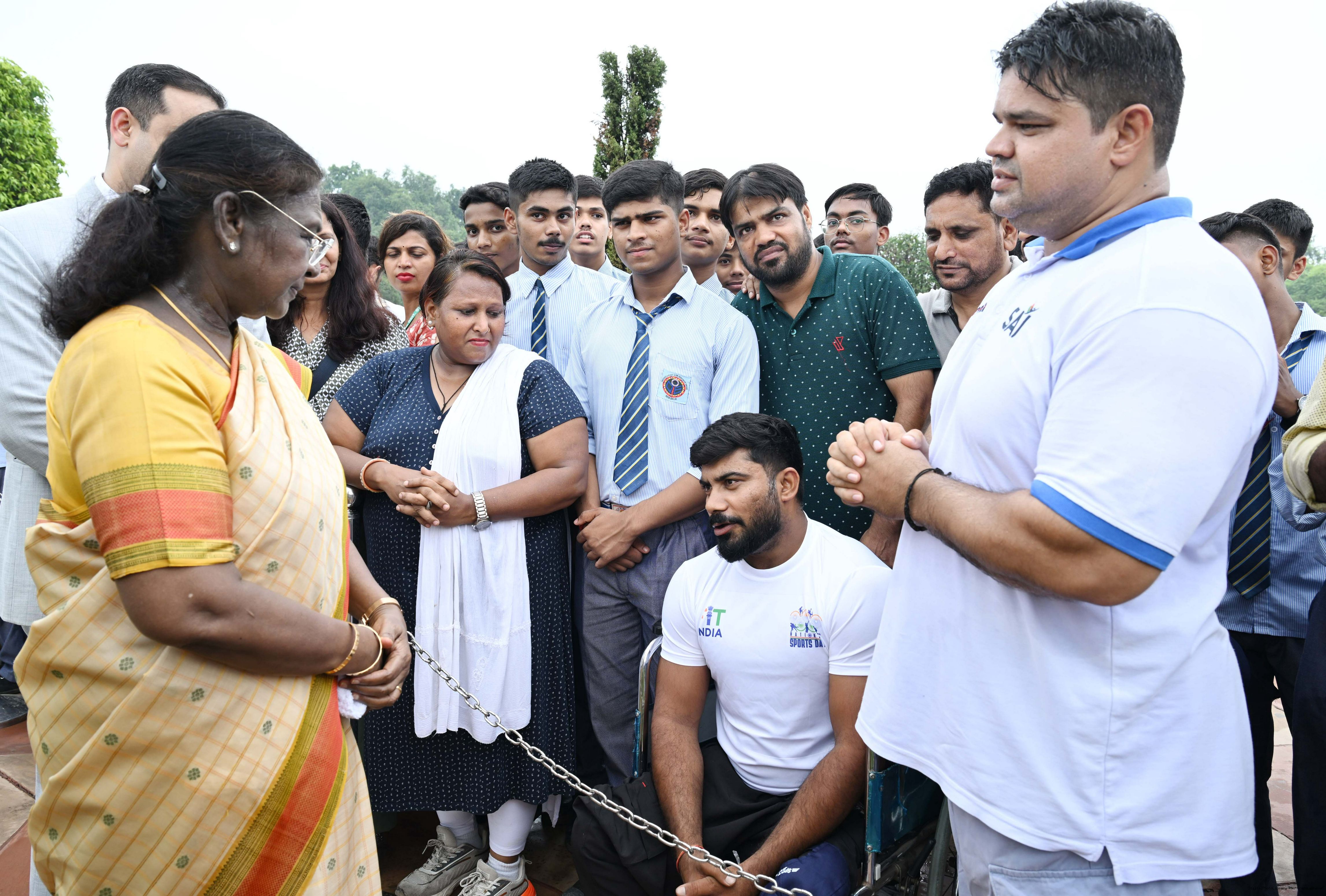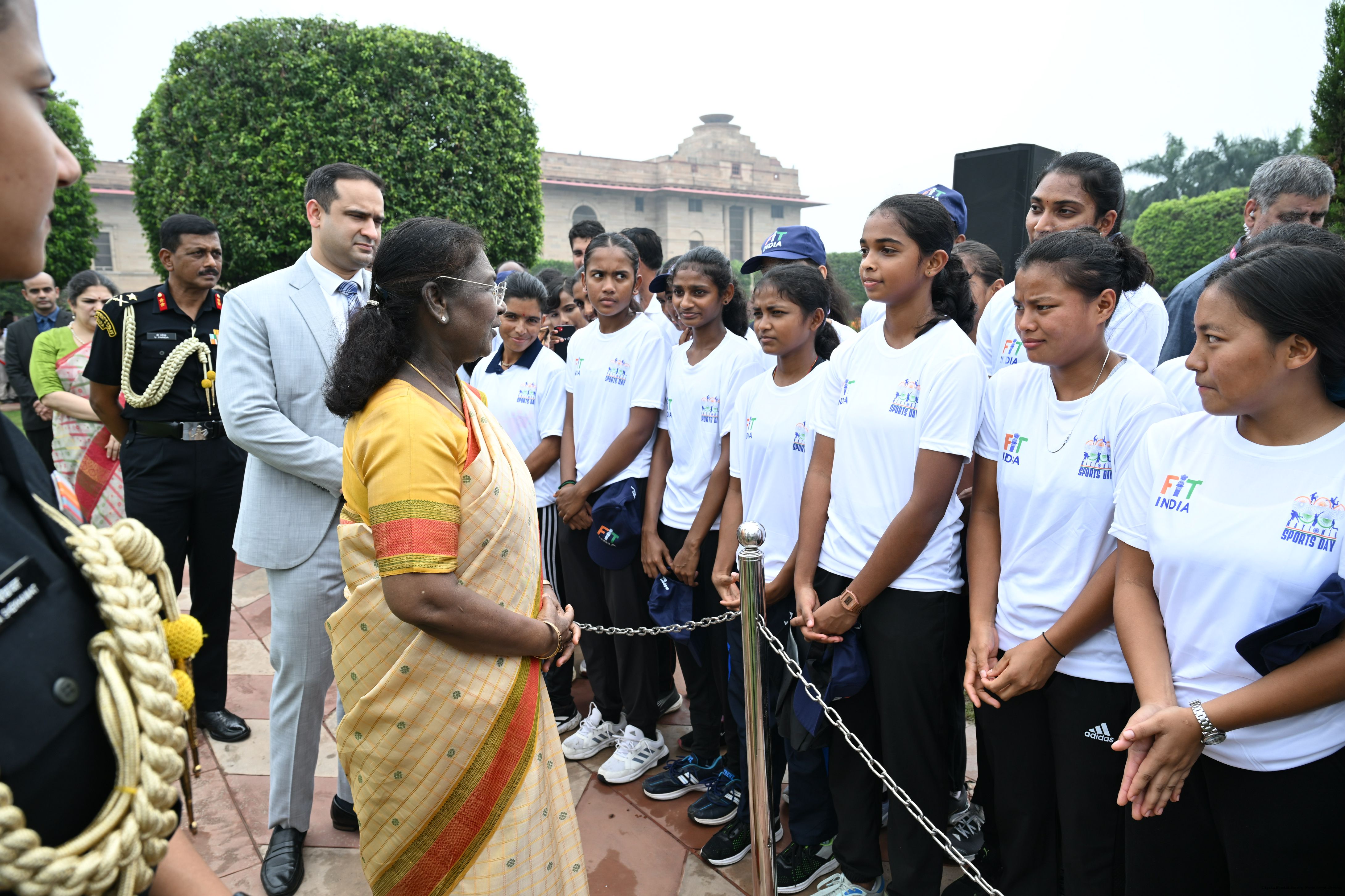 The President of India, Smt Droupadi Murmu interacted with sportspersons who visited Amrit Udyan on National Sports Day at Rashtrapati Bhavan on August 29, 2025.