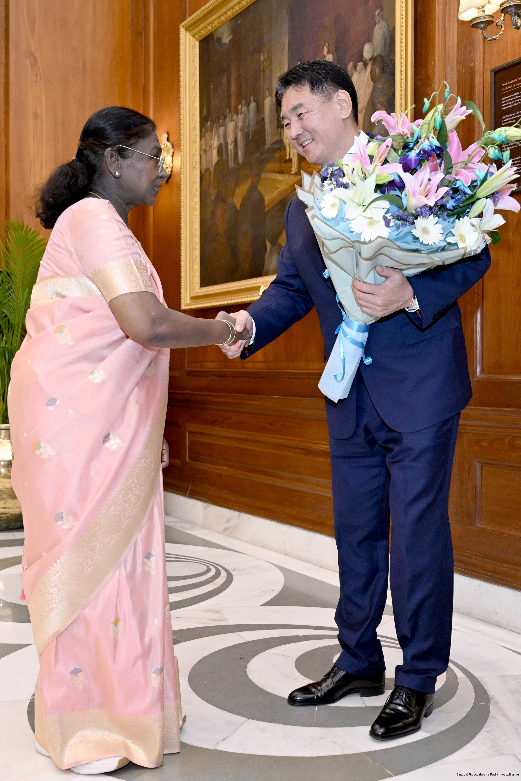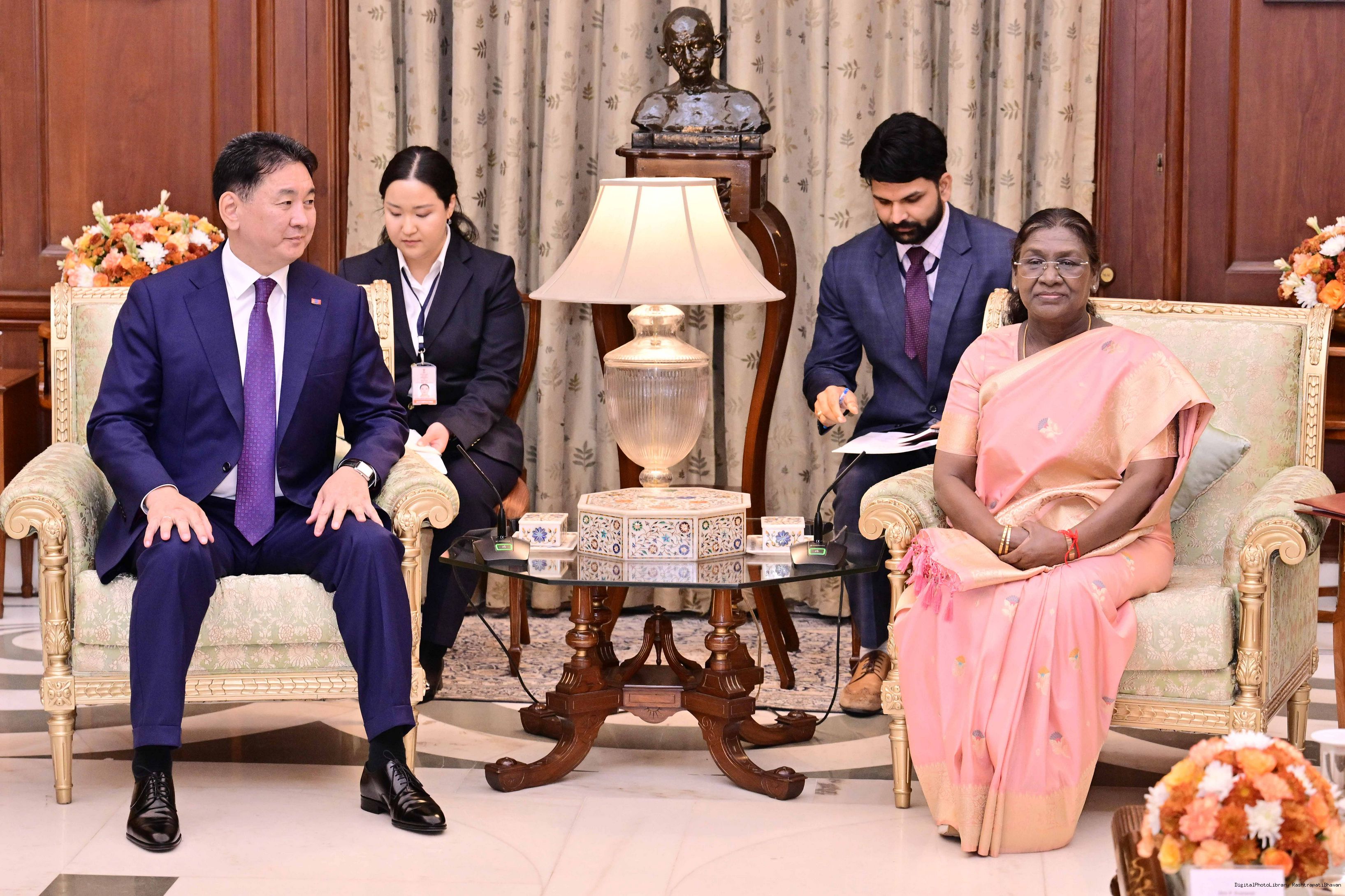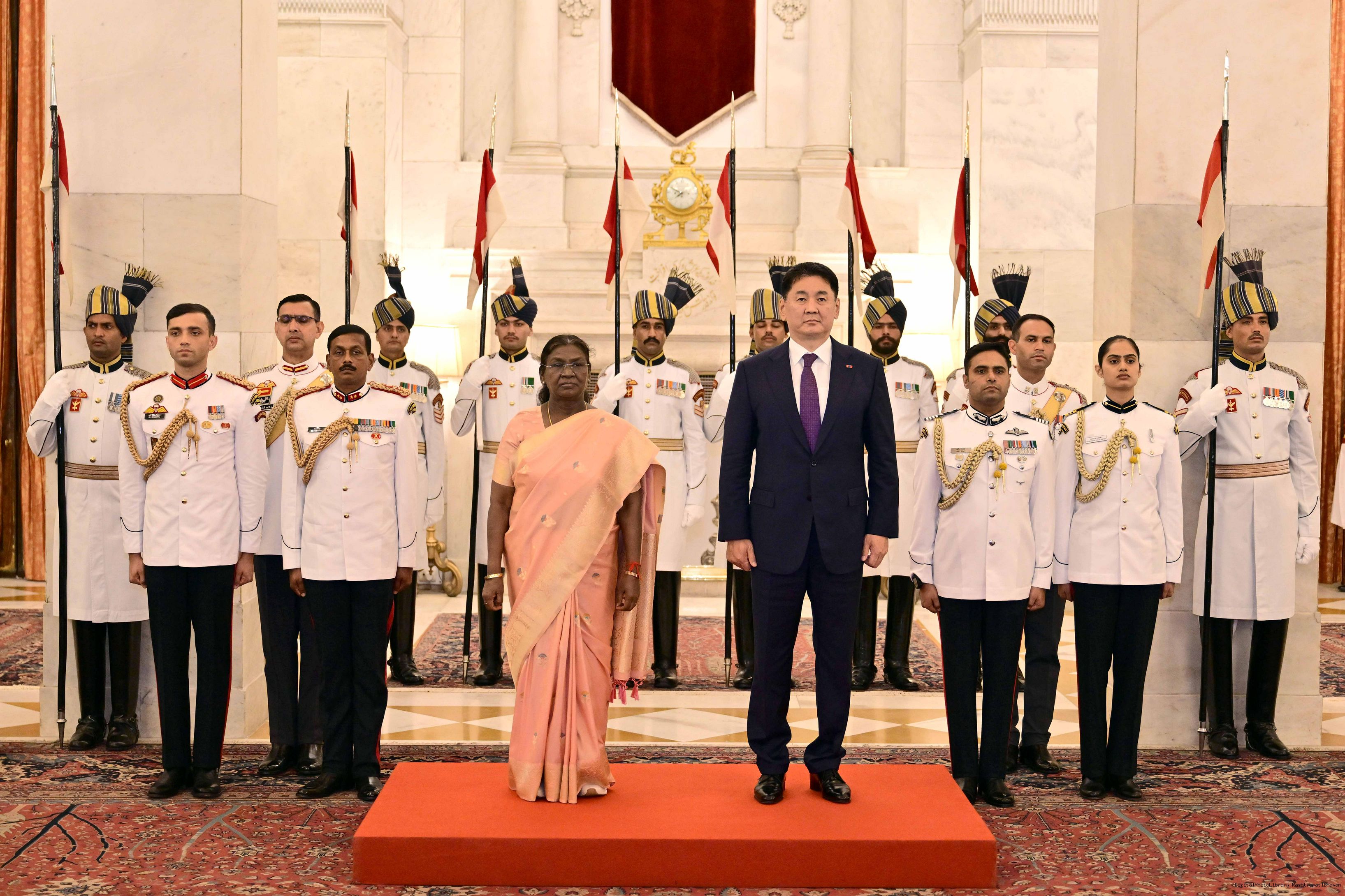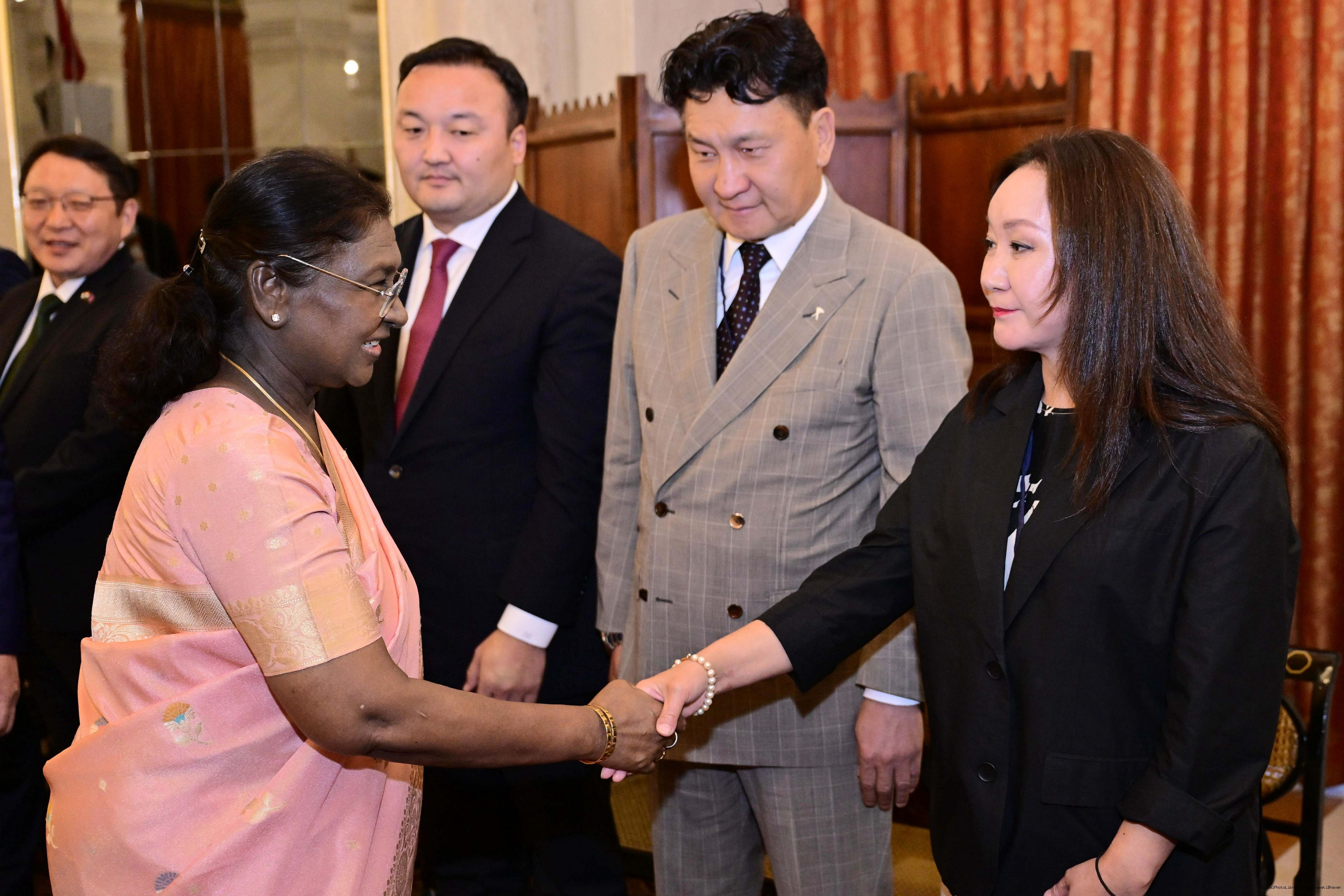 The President of India, Smt. Droupadi Murmu received H.E. Mr Khurelsukh Ukhnaa, President of Mongolia at Rashtrapati Bhavan on October 14, 2025.