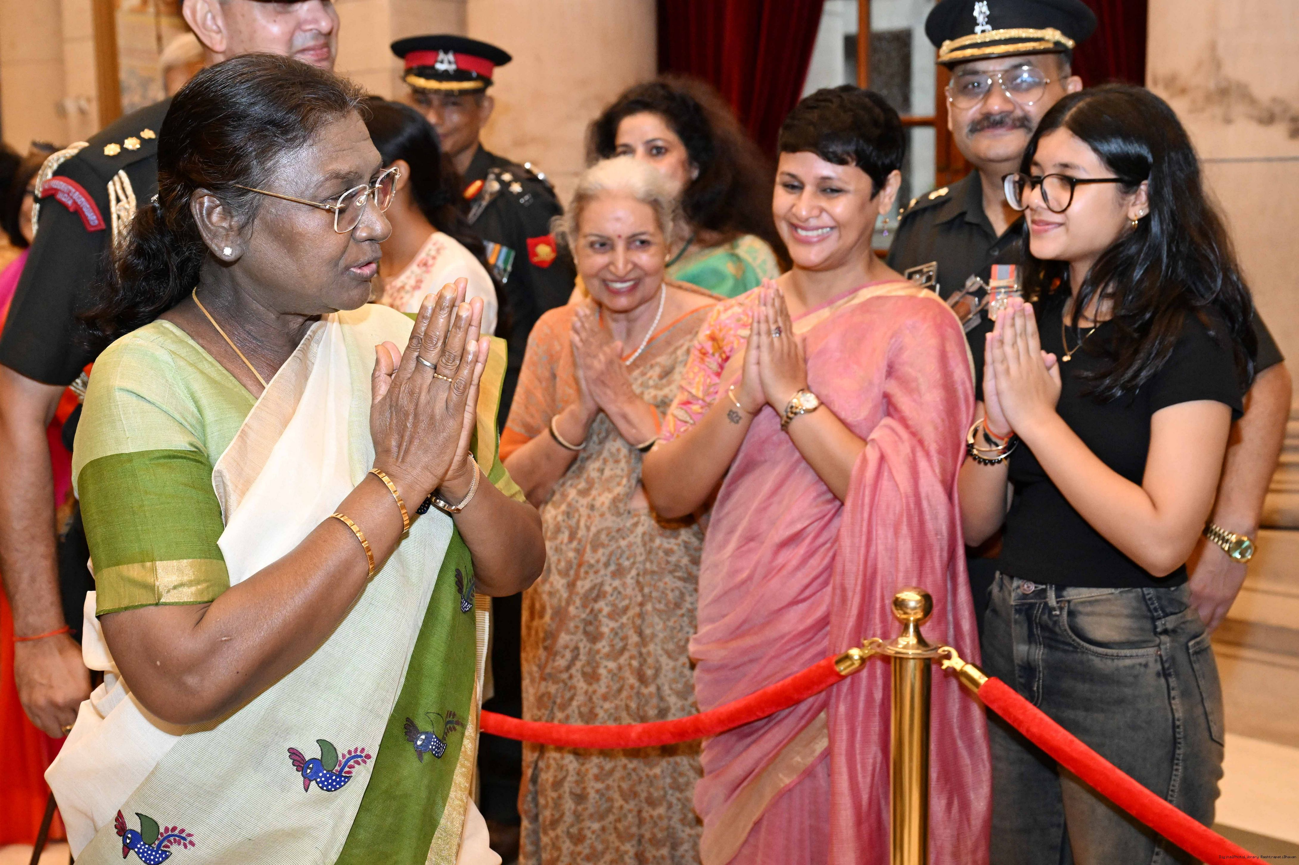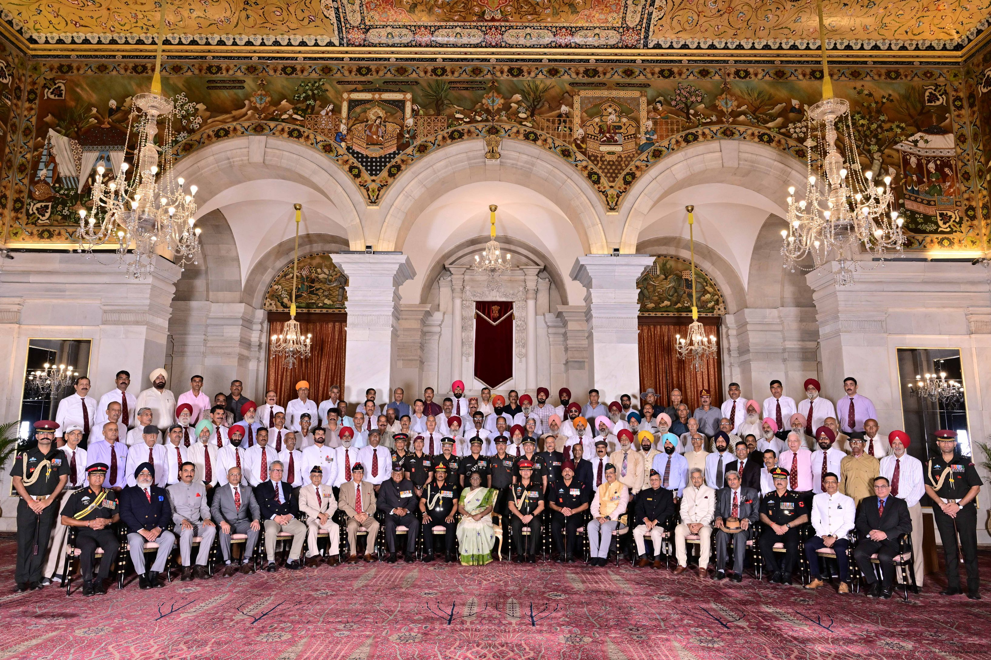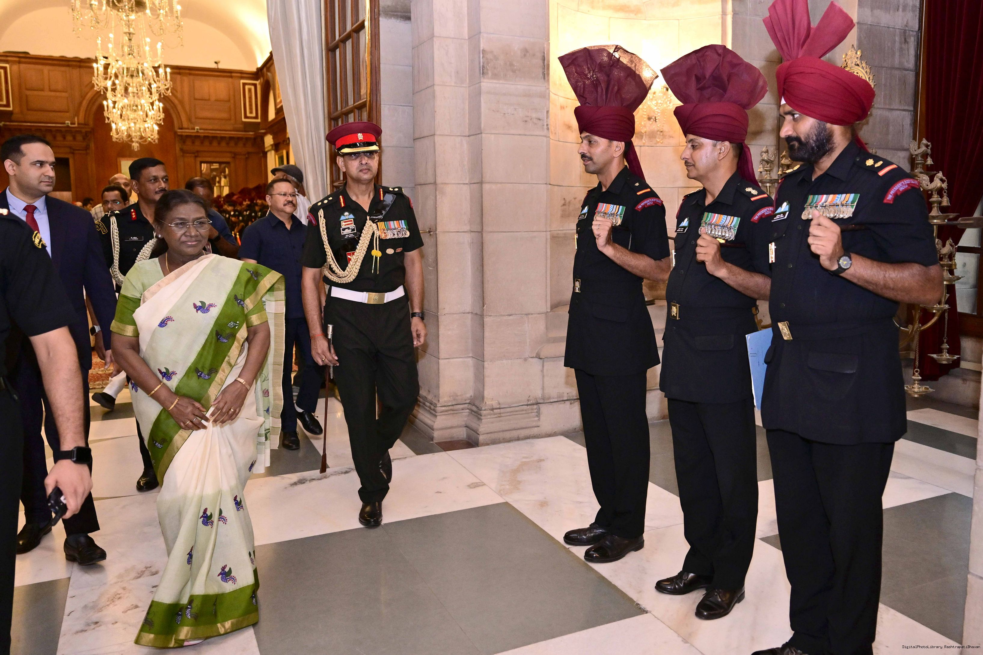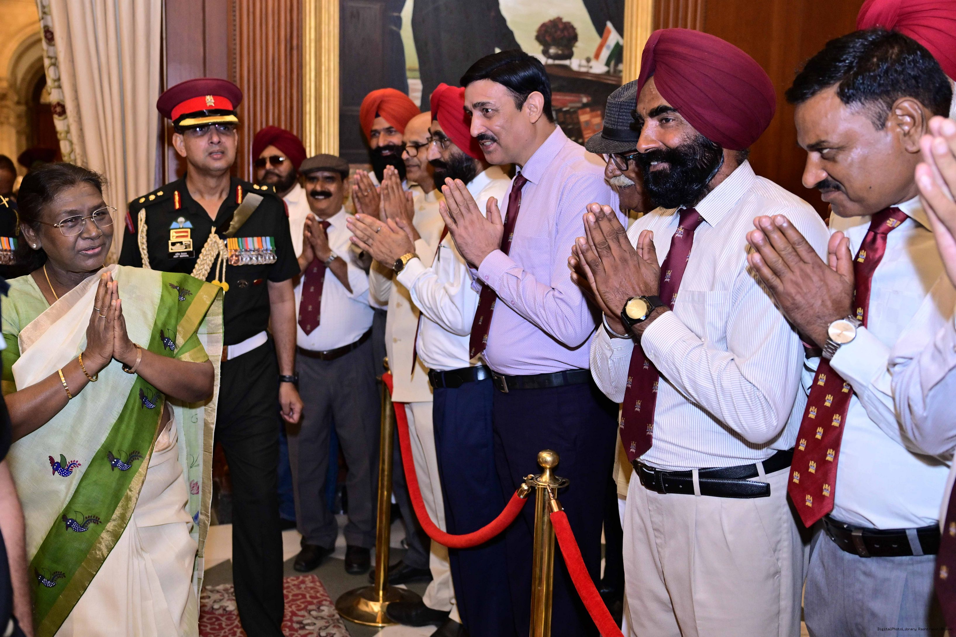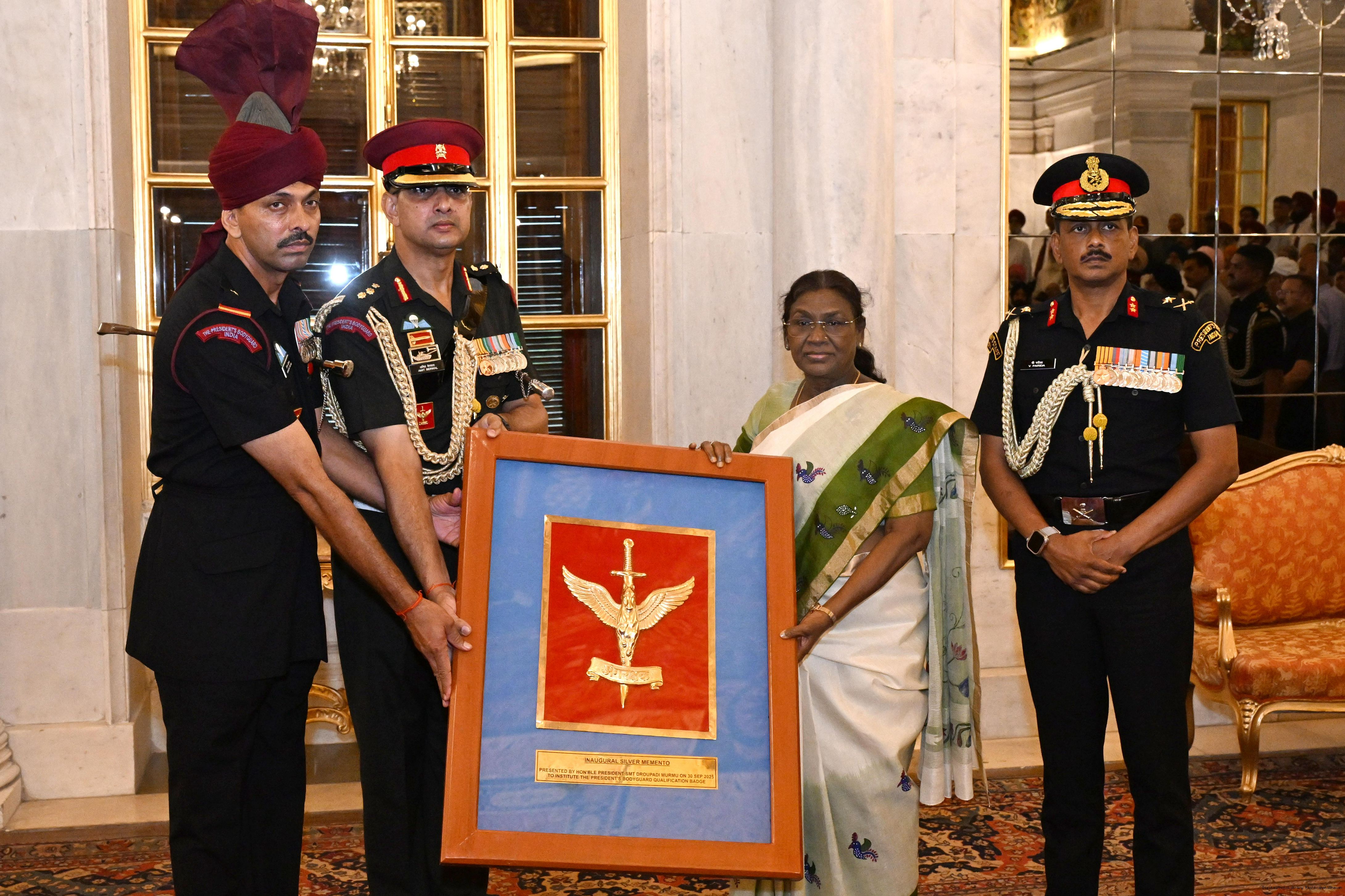The President of India, Smt. Droupadi Murmu met and posing a group photograph with PBG personnel on the occasion of 75 years of being designated 'The President's Bodyguards' at Rashtrapati Bhavan on September 30, 2025.