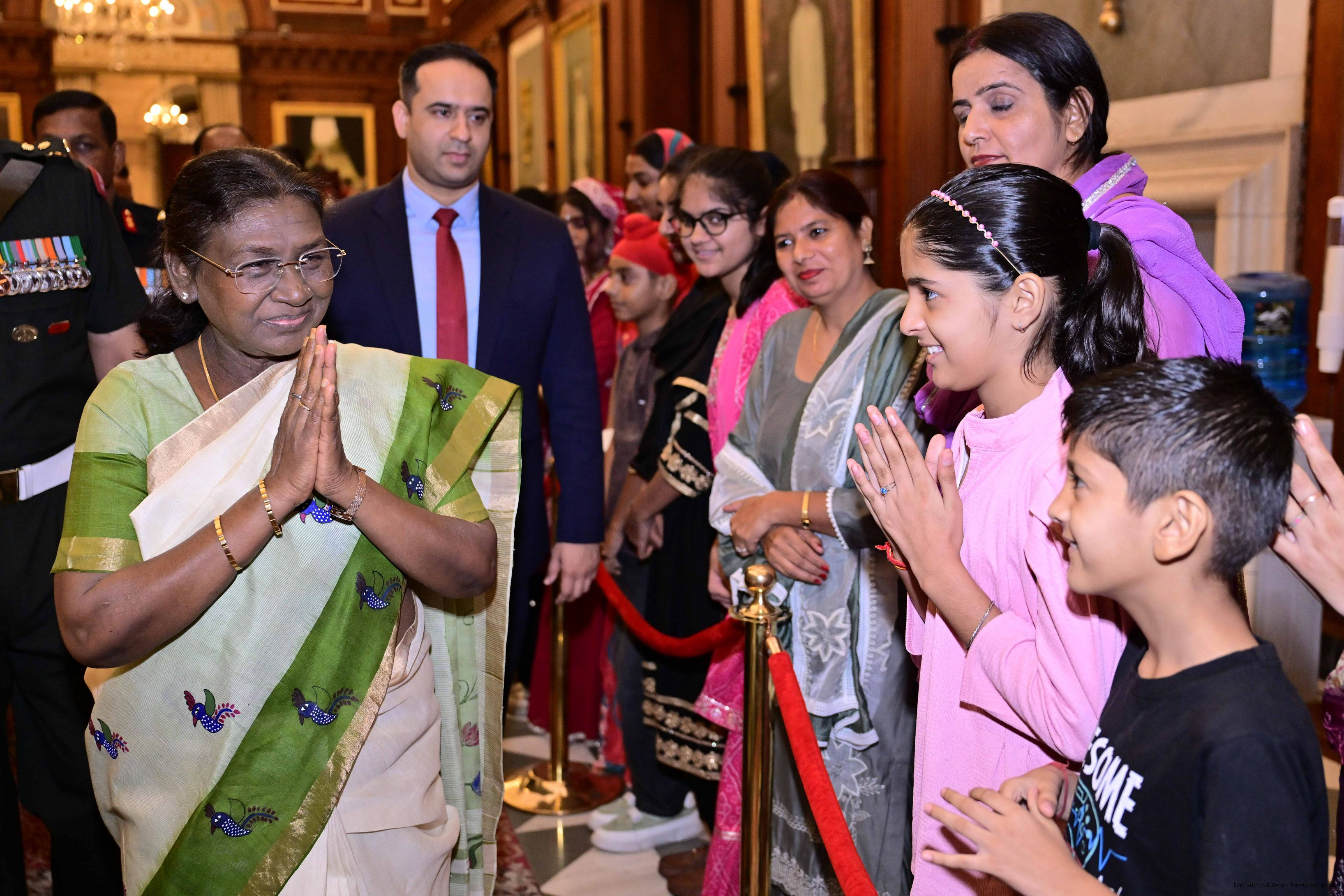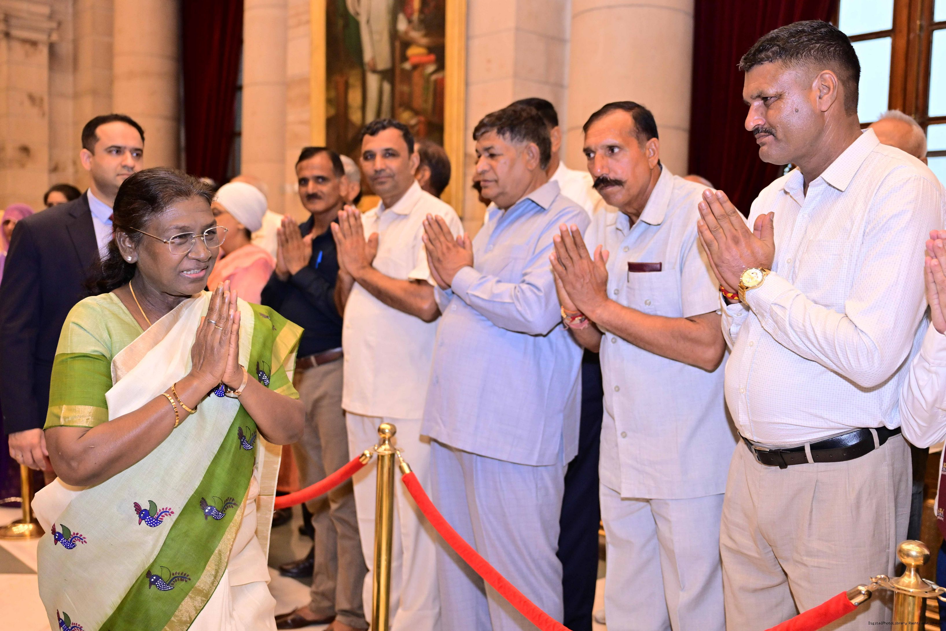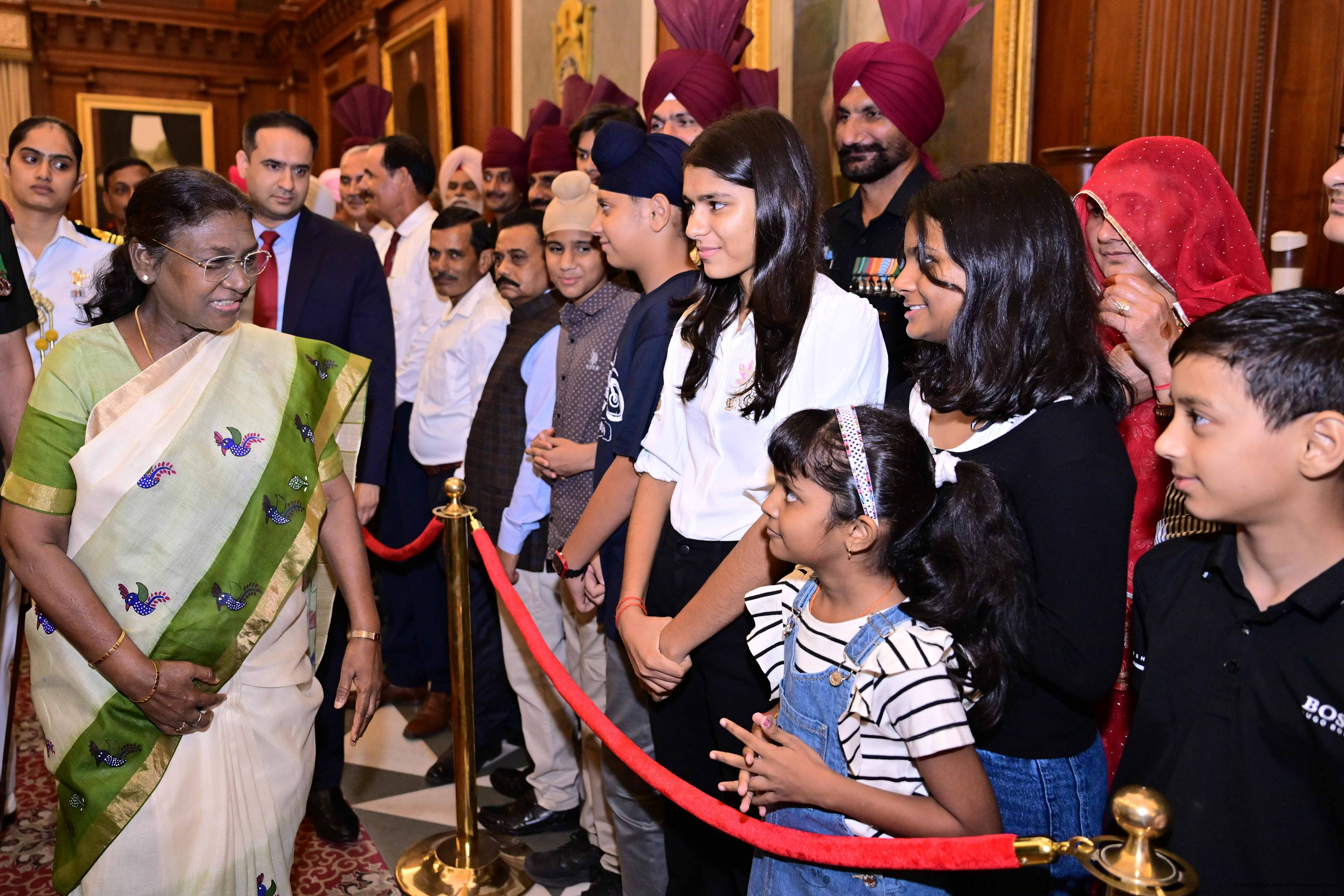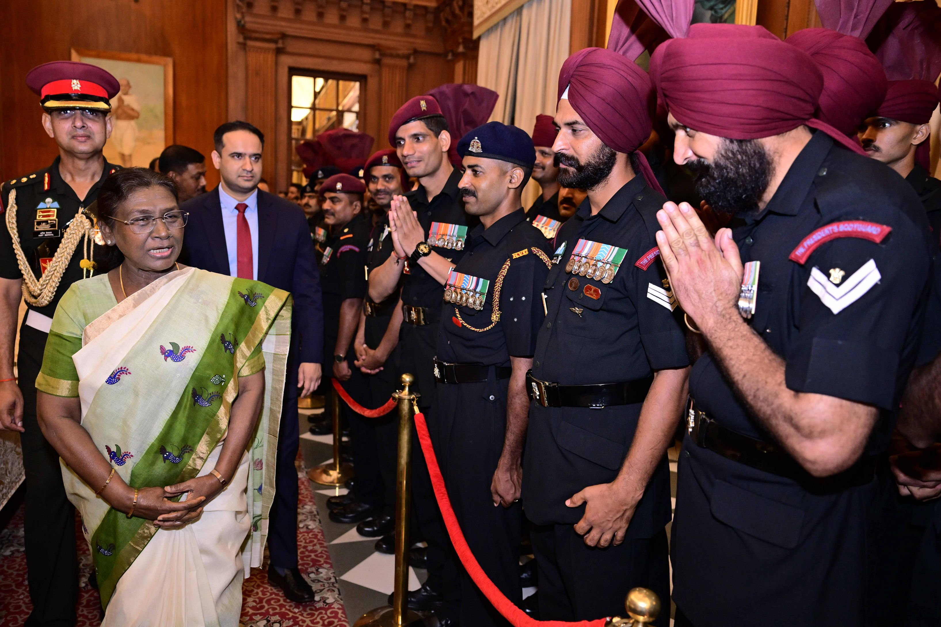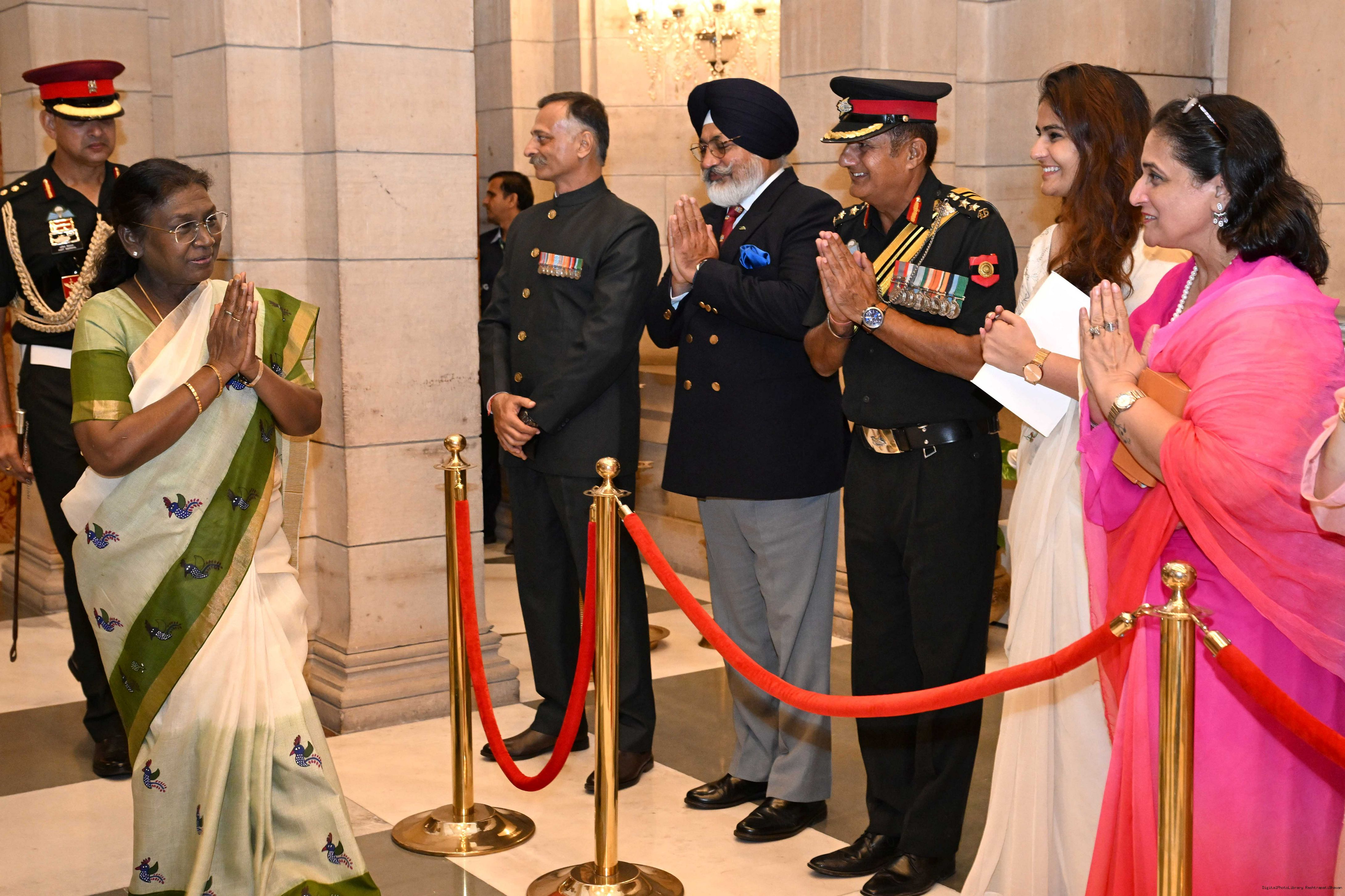 The President of India, Smt. Droupadi Murmu met and posing a group photograph with PBG personnel on the occasion of 75 years of being designated 'The President's Bodyguards' at Rashtrapati Bhavan on September 30, 2025.