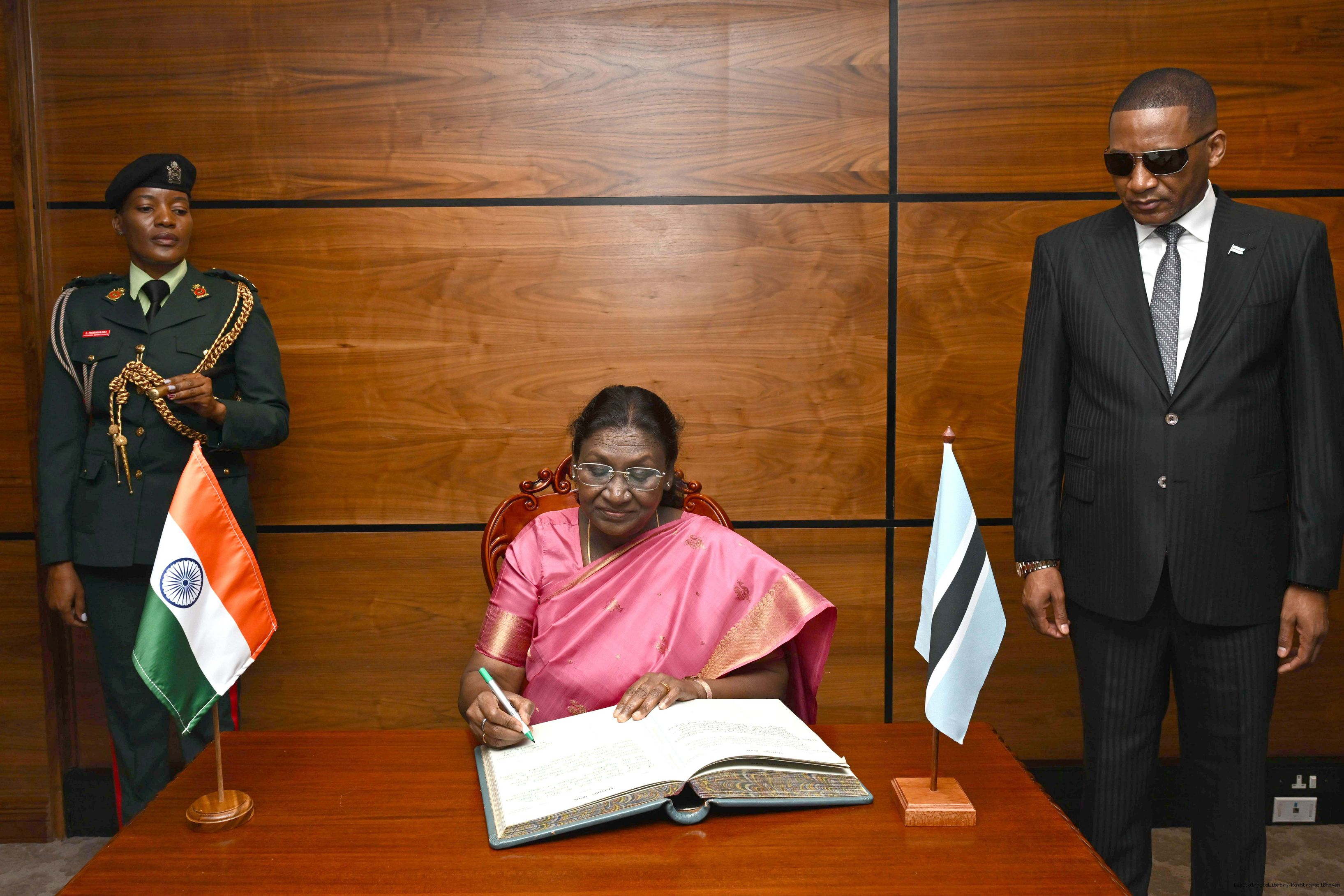 The President of India, Smt Droupadi Murmu received by H.E. Advocate Duma Gideon Boko, the President of the Republic of Botswana at the President’s Office, Gaborone Botswana on November 12, 2025.