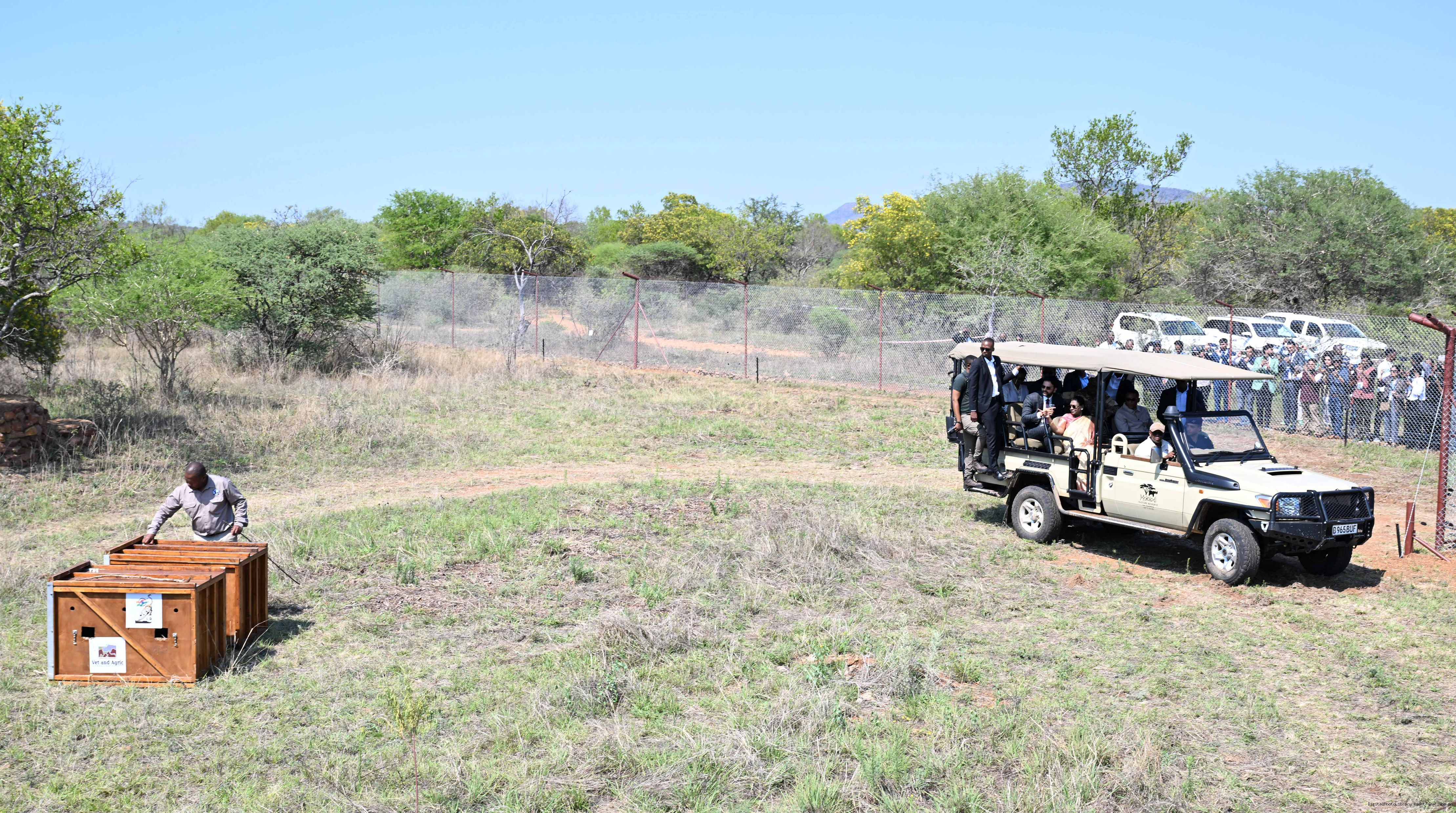 The President of India, Smt Droupadi Murmu and President Duma Gideon Boko witnessed the release of captured cheetahs originating from Botswana's Ghanzi region into the quarantine facility by experts from India and Botswana on November 12, 2025.