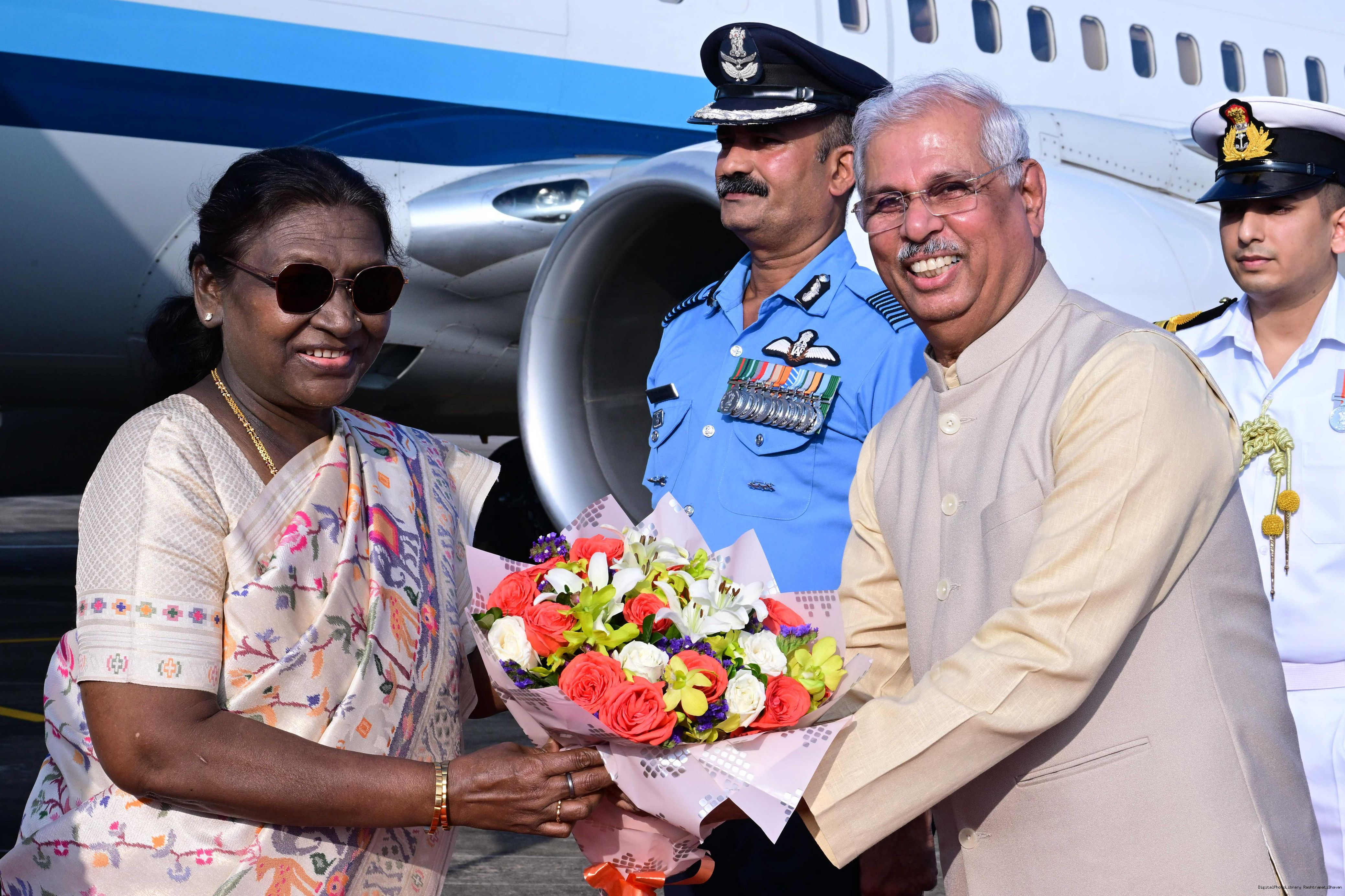 The Governor of Kerala, Shri Rajendra Vishwanath Arlekar and Chief Minister Shri Pinarayi Vijayan received the President of India, Smt. Droupadi Murmu on her arrival at Thiruvananthapuram, Kerala on December 3, 2025.