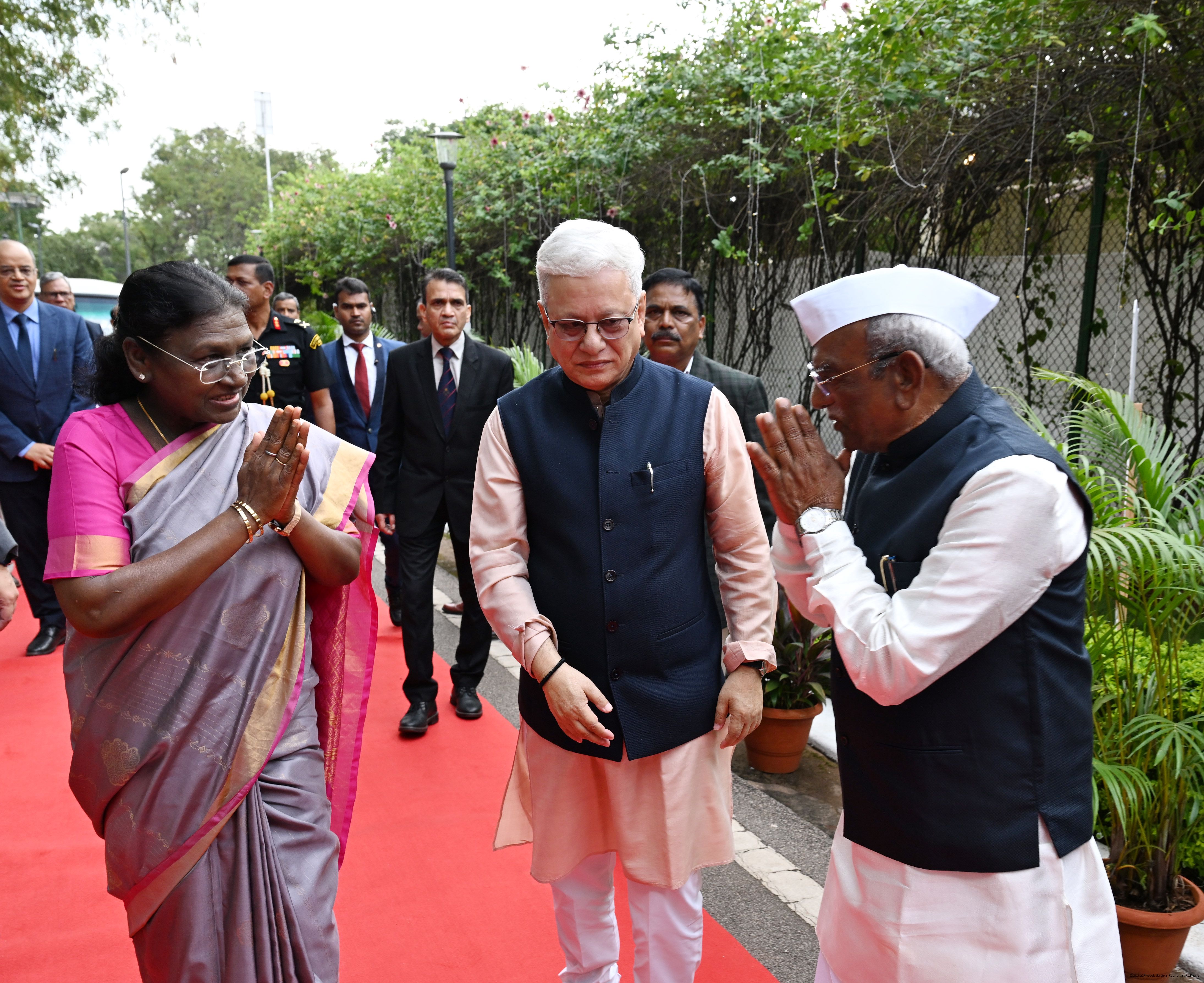 The Governor of Telangana, Shri Jishnu Dev Varma, Chief Minister Shri A. Revanth Reddy and Union Minister for Coal and Mines Shri G. Kishan Reddy received the President of India, Smt. Droupadi Murmu on her arrival at Hyderabad on November 21, 2025.