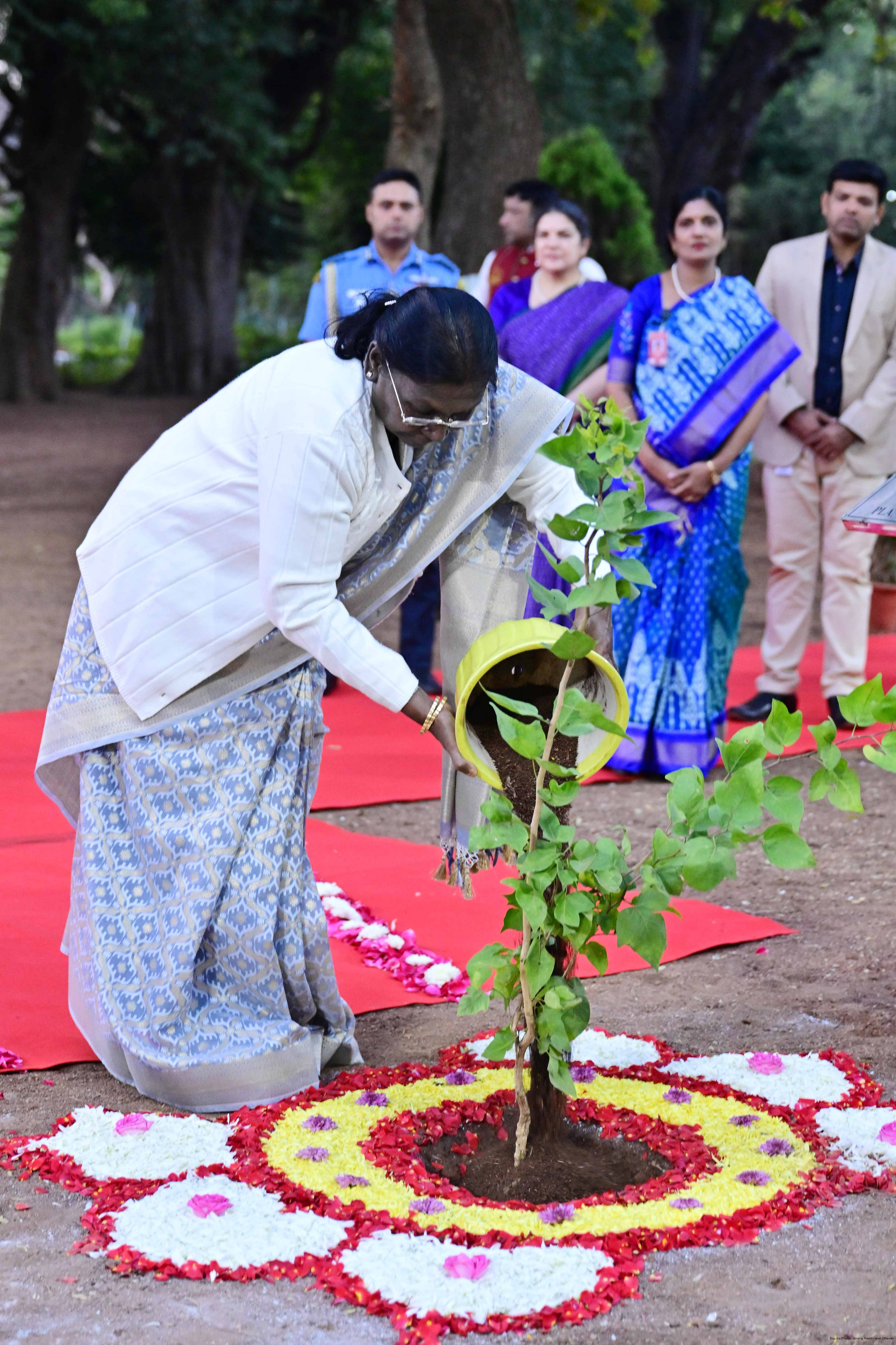 The President of India Smt Droupadi Murmu planting a Tree at Rashtrapati Nilayam, visited to Nikunj Rashtrapati Nilayam and inaugurated of Multi Purpose Hall, Rashtrapati Nilayam at Hyderabad December 20, 2025.
