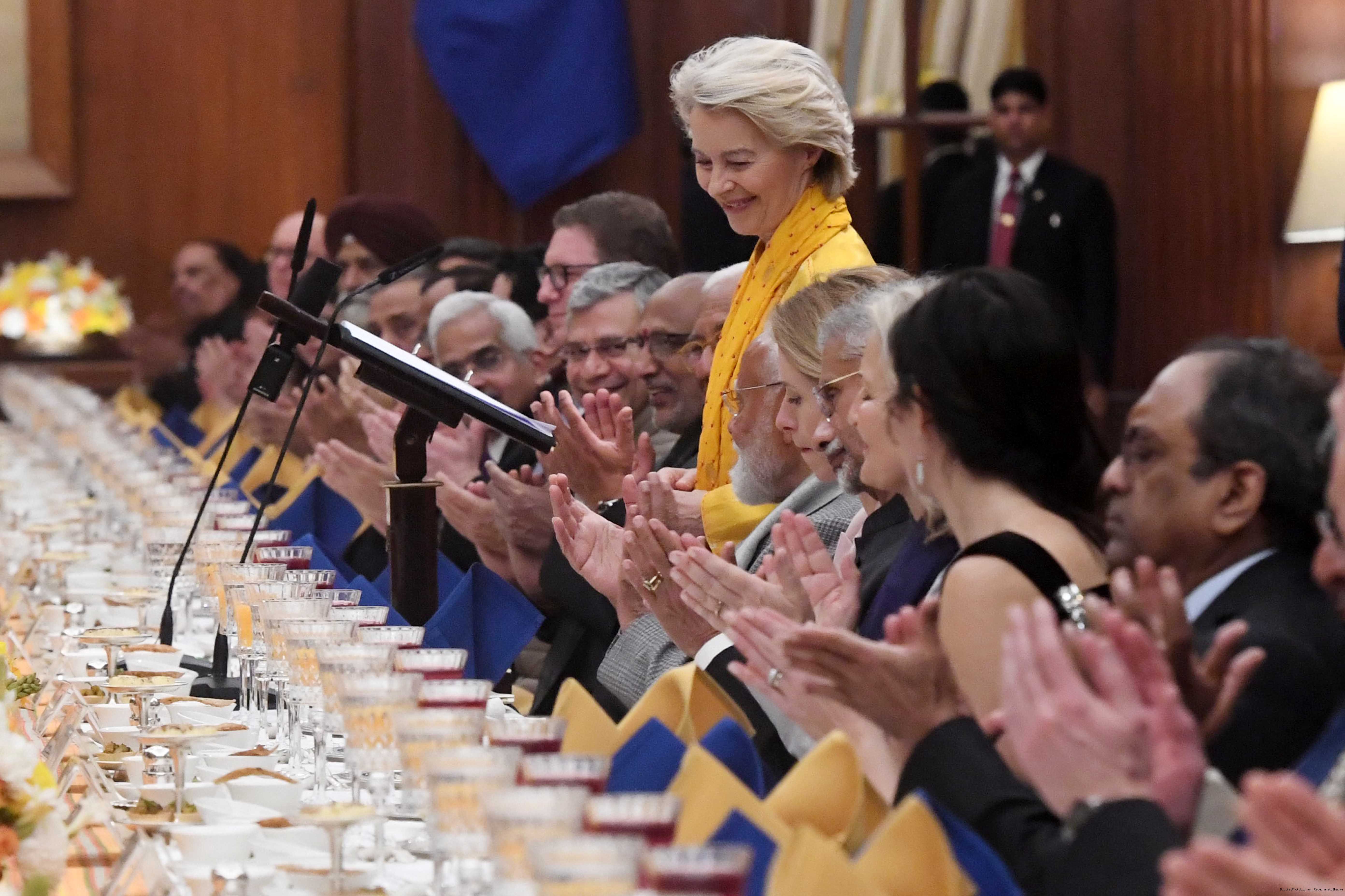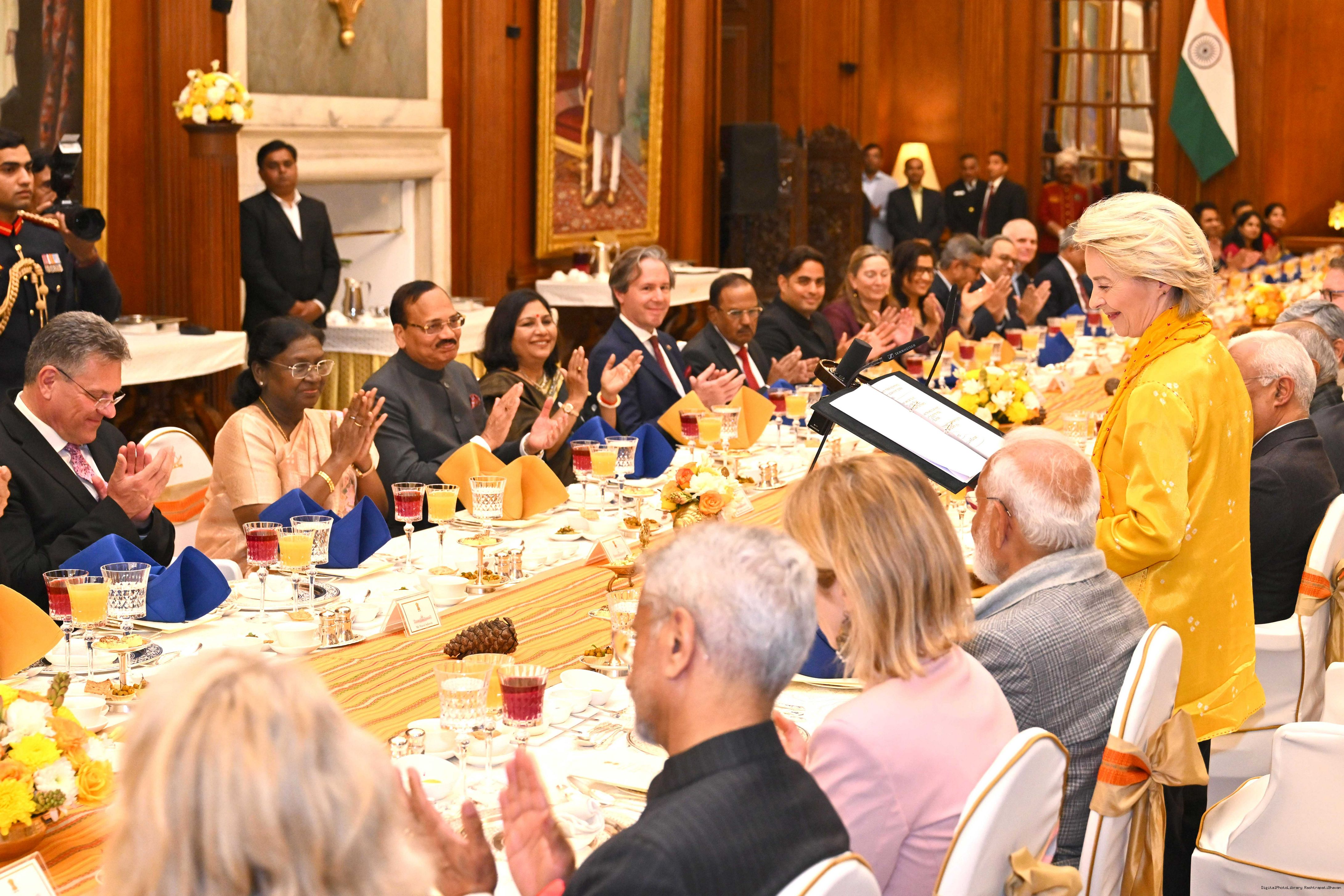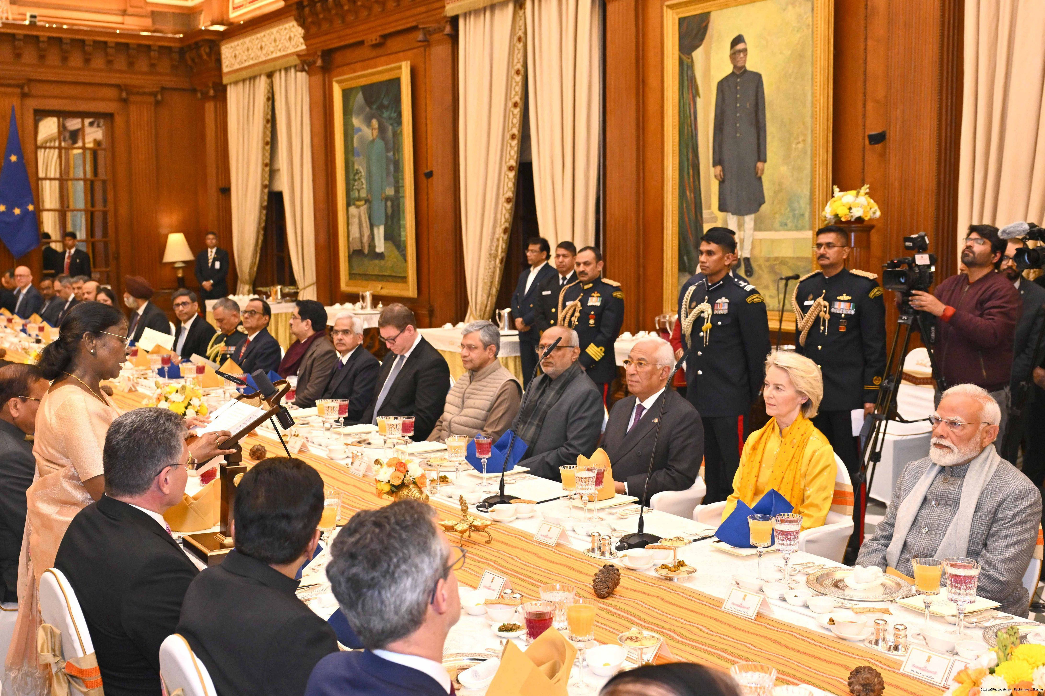 The President of India, Smt Droupadi Murmu hosted a banquet in the honour of the Chief Guests of the 77th Republic Day Celebrations, H. E. António Costa, President of the European Council and H. E. Ms Ursula von der Leyen, President of the European Commission at Rashtrapati Bhavan on January 27, 2026.