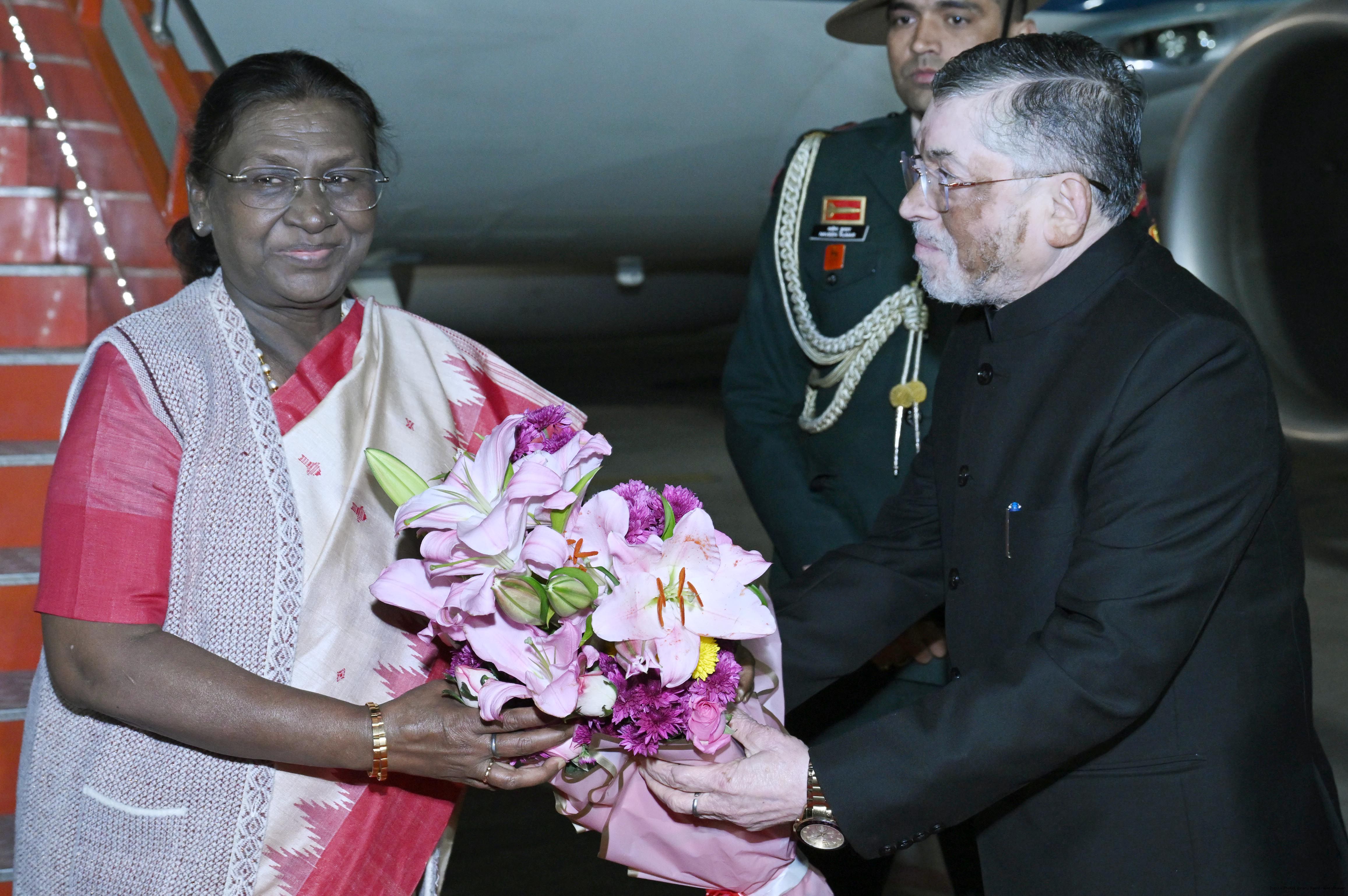 The Governor of Jharkhand, Shri Santosh Kumar Gangwar, Chief Minister Shri Hemant Soren and Minister of State for Defence Shri Sanjay Seth received the President of India, Smt. Droupadi Murmu on her arrival in Ranchi on December 28, 2025.
