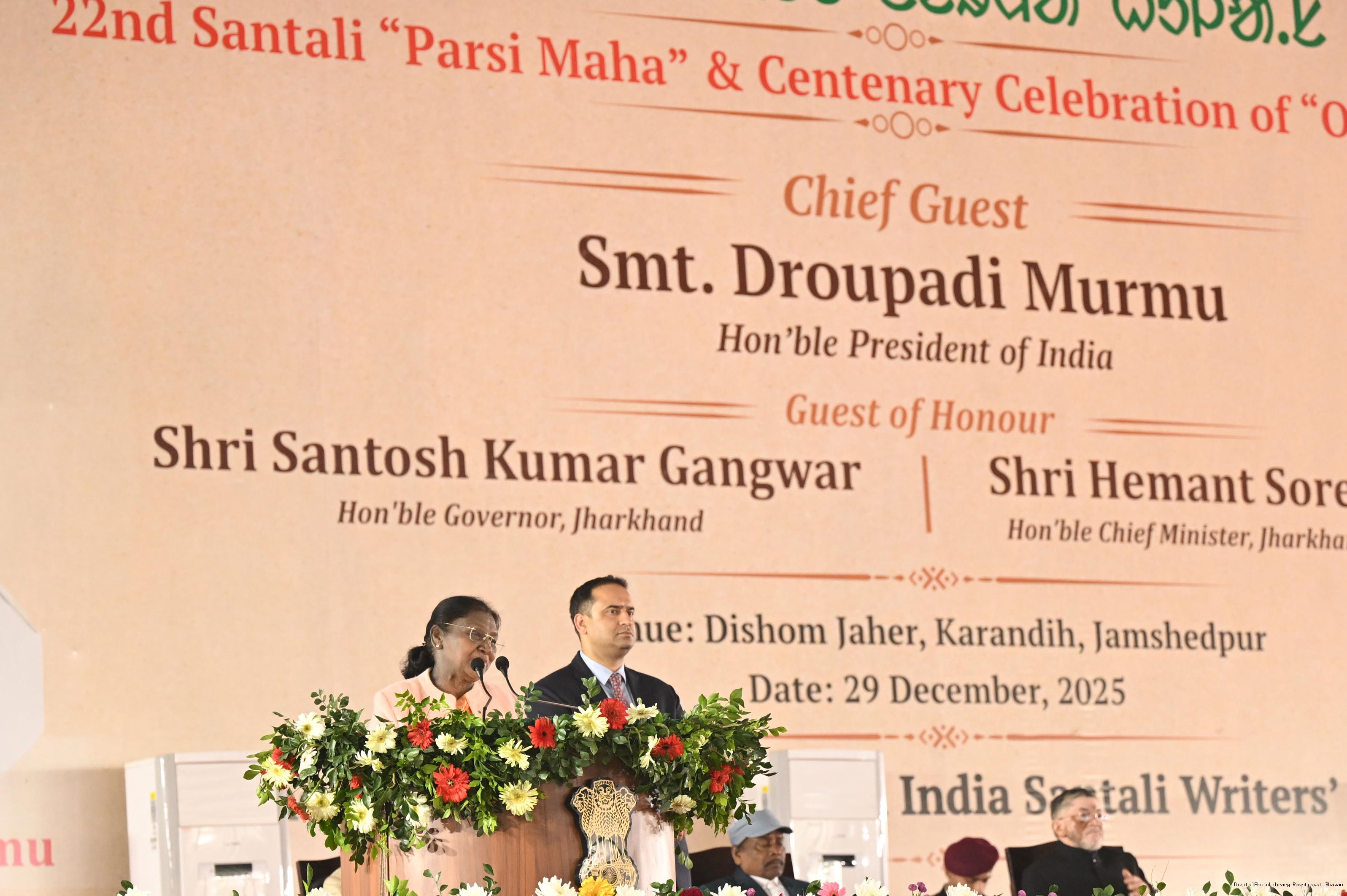 The President of India, Smt Droupadi Murmu addressed the closing ceremony of the 22nd Parsi Maha and the centenary celebrations of Ol Chiki at Jamshedpur, Jharkhand on December 29, 2025.