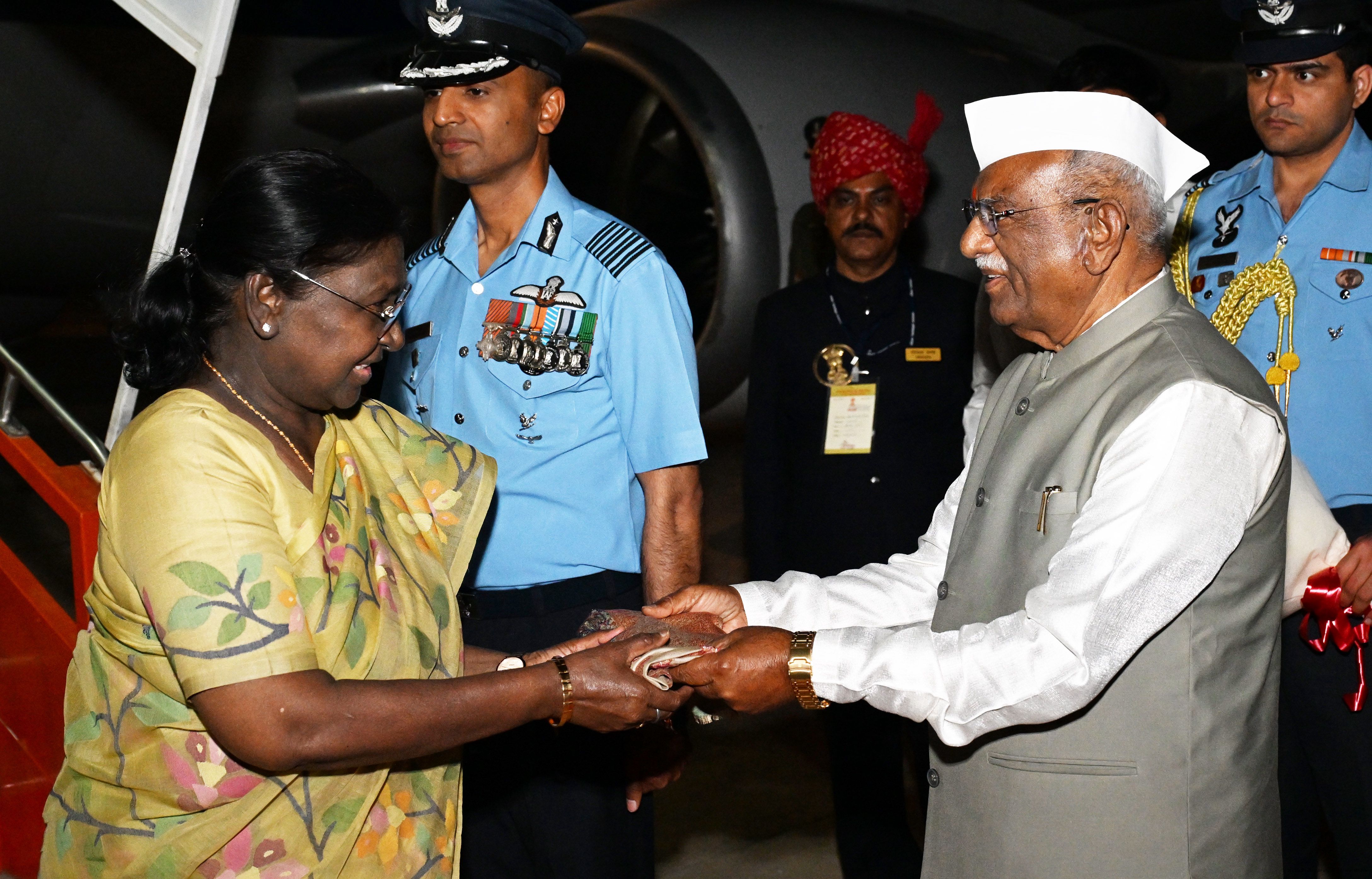 The Governor of Rajasthan, Shri Haribhau Kisanrao Bagde and Chief Minister Shri Bhajanlal Sharma received the President of India, Smt Droupadi Murmu on her arrival at Jaisalmer, Rajasthan on February 26, 2026.