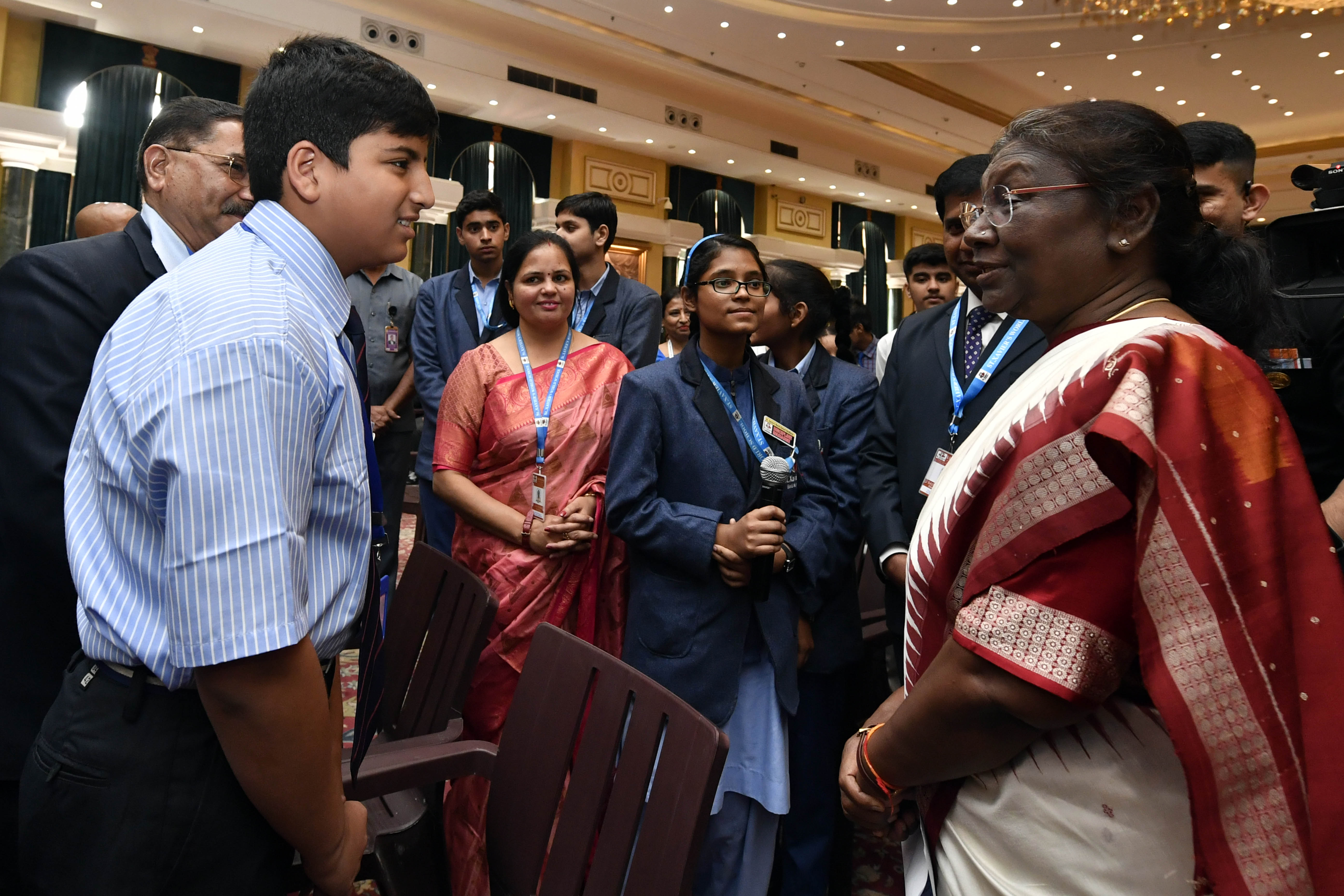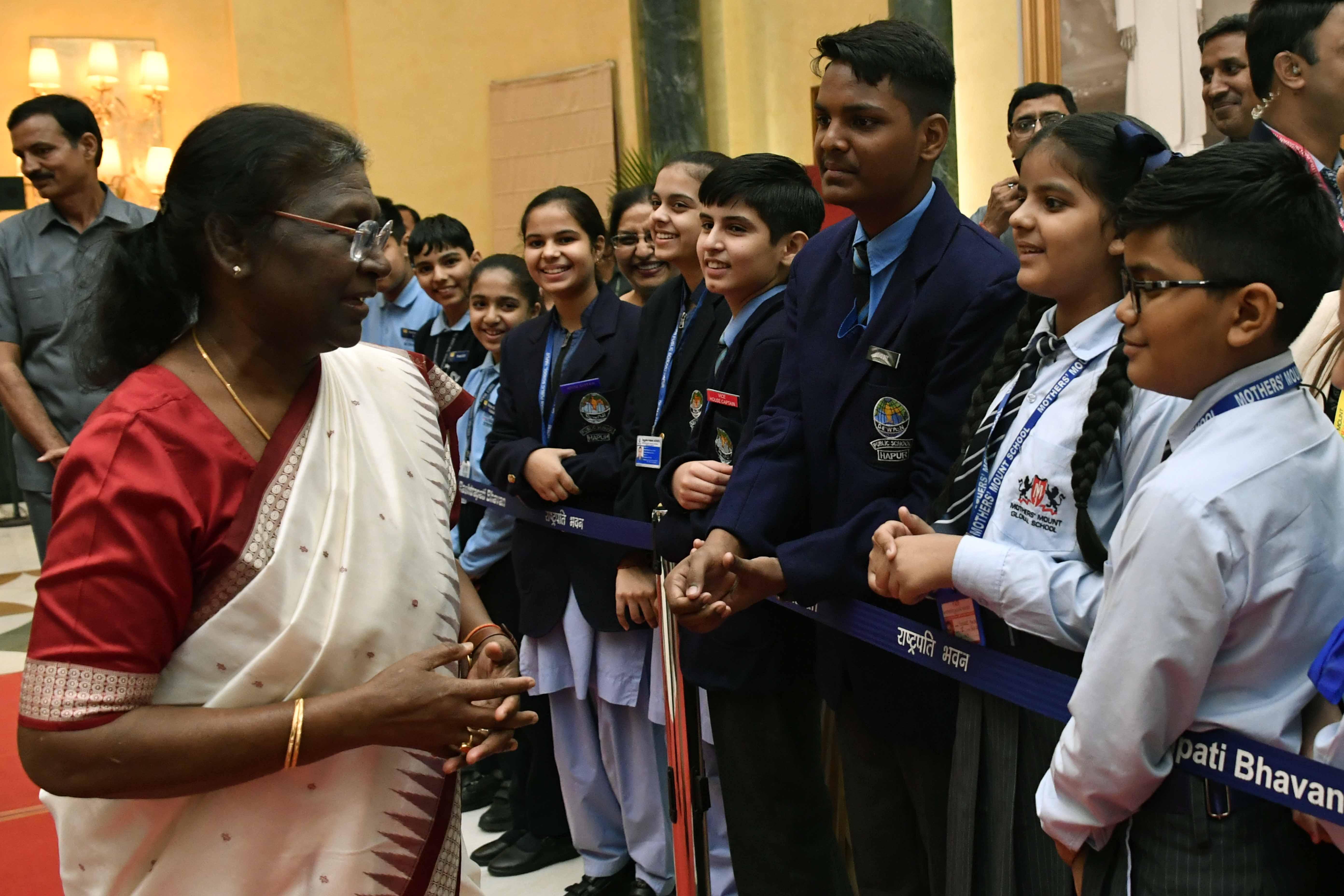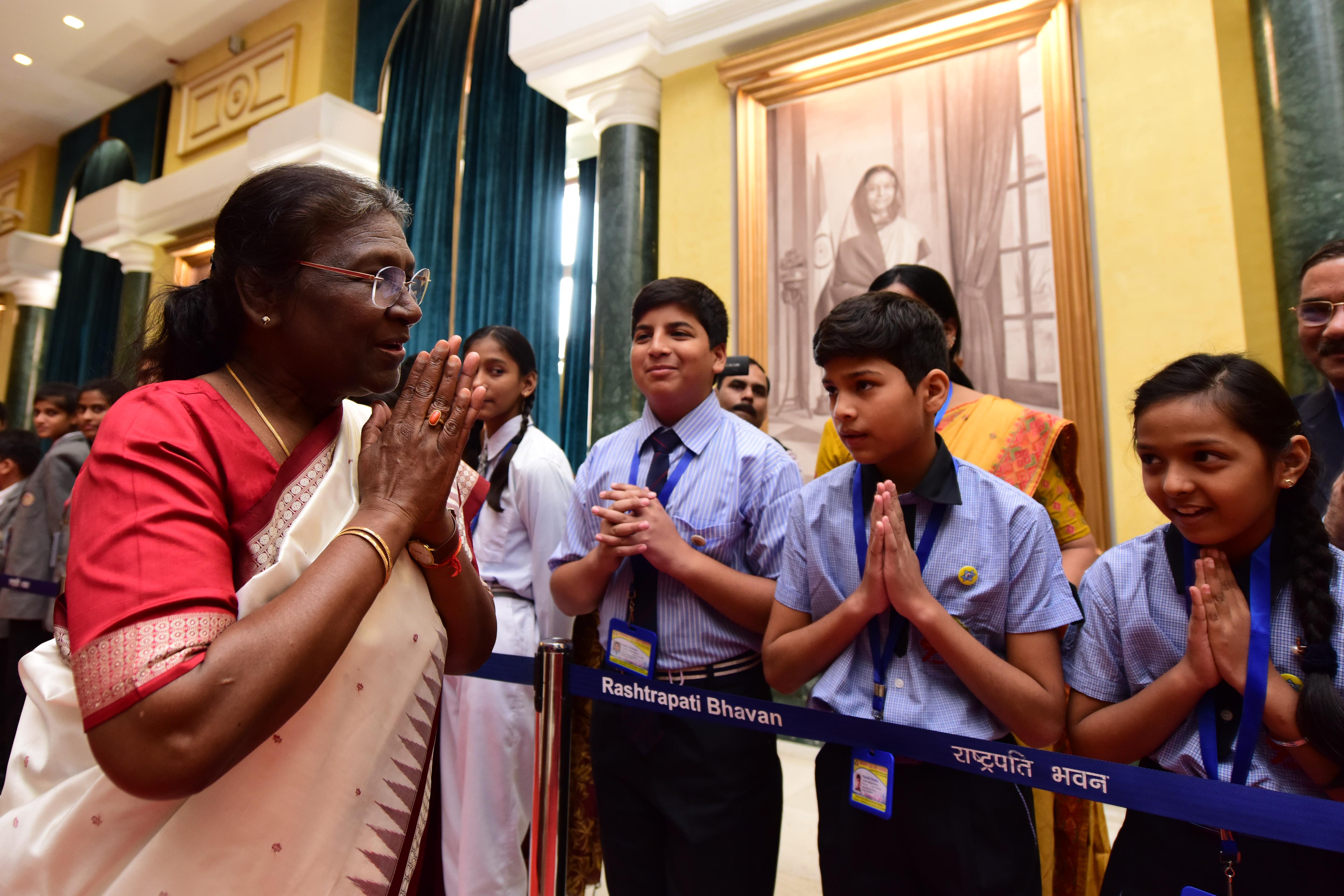 The President of India, Smt. Droupadi Murmu interacting with the students from various schools/organisations at Rashtrapati Bhavan Cultural Centre (RBCC) on November 14, 2022.