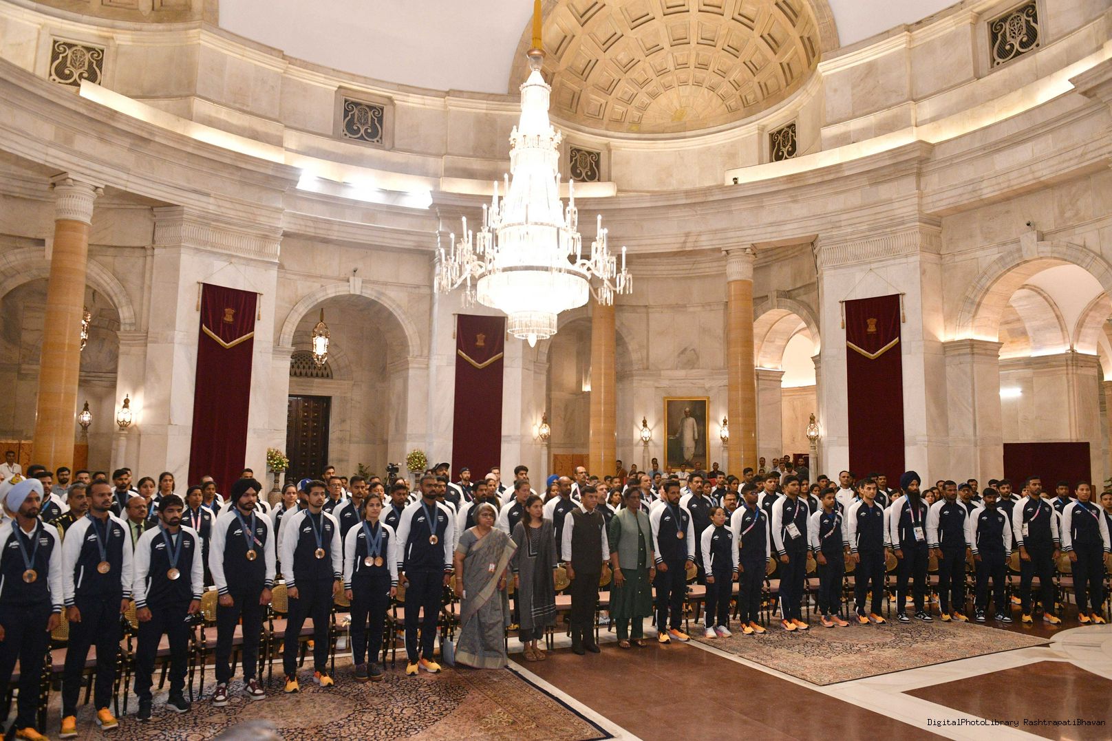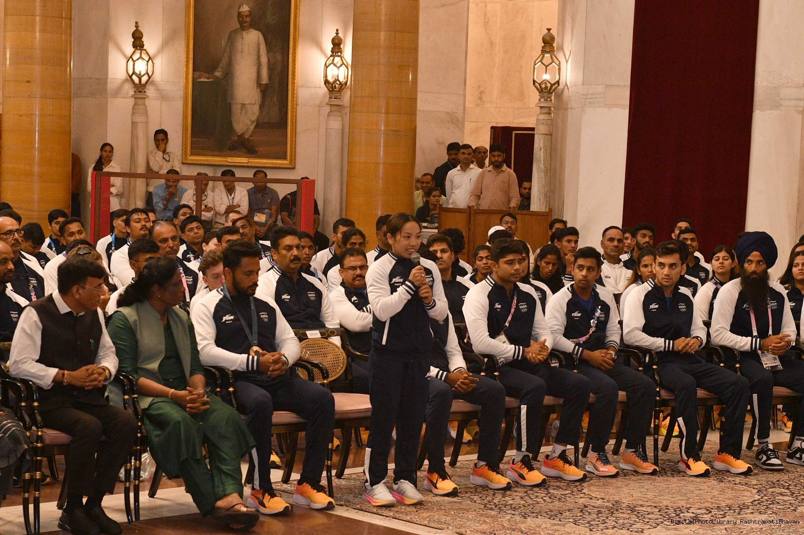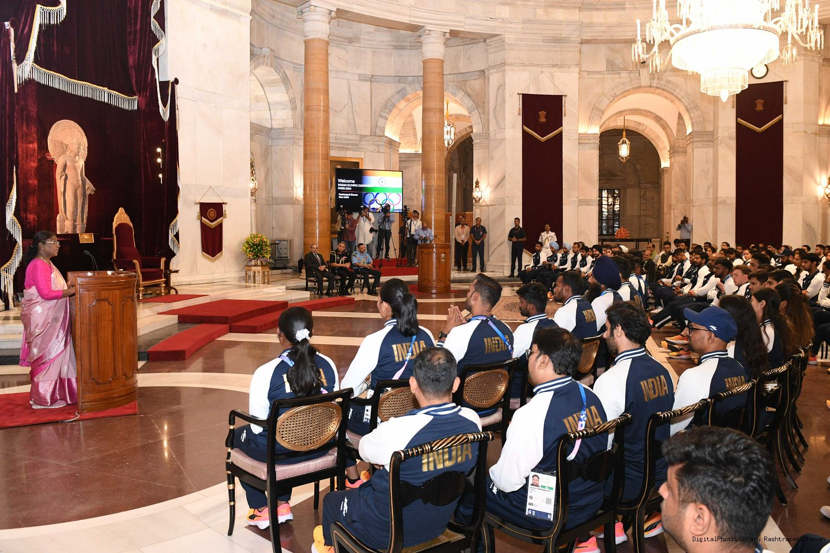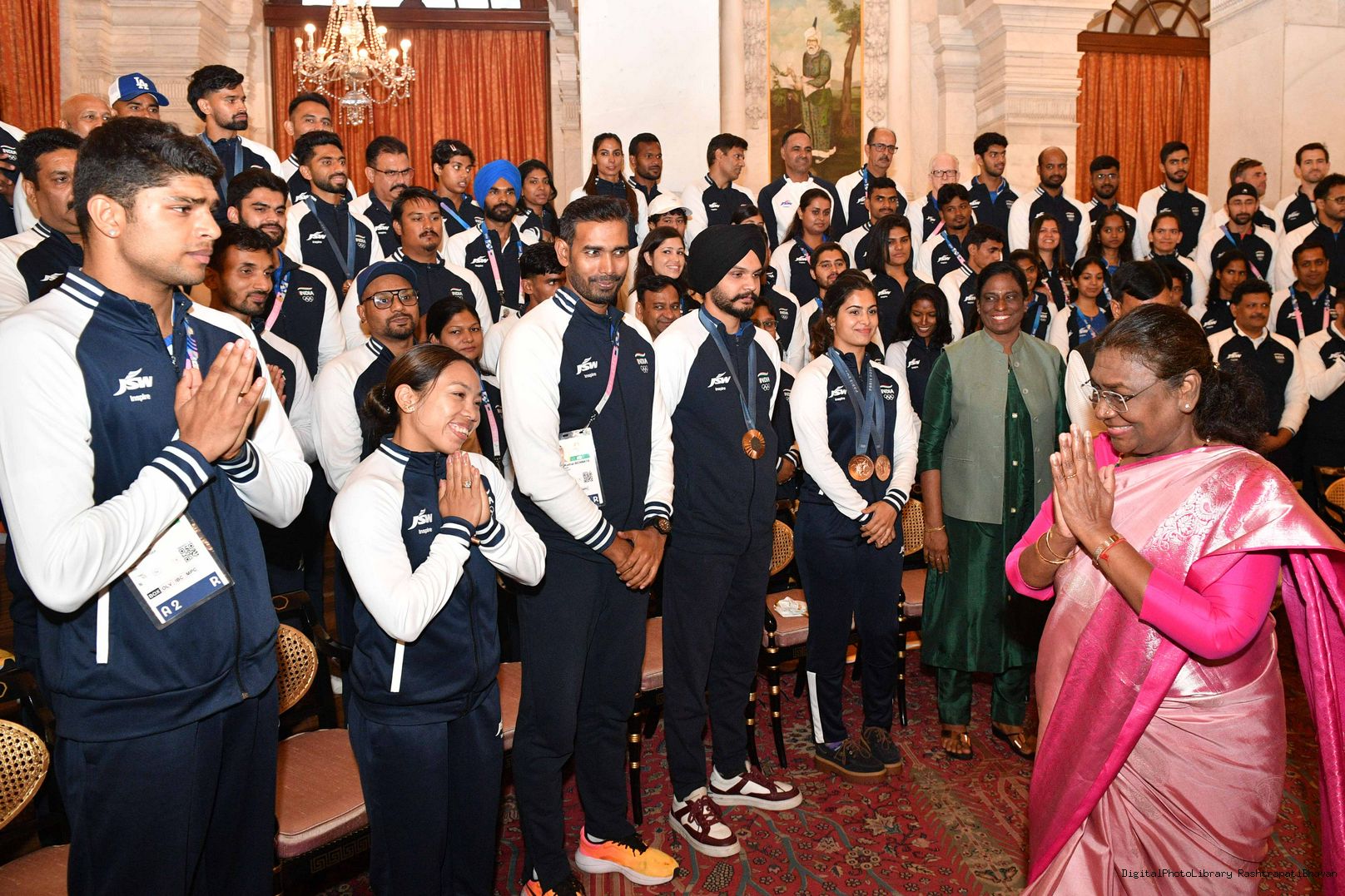 The President of India Smt. Droupadi Murmu met the Indian Contingent of the Paris Olympics 2024 at Ganatantra Mandap, Rashtrapati Bhavan on August 14, 2024.