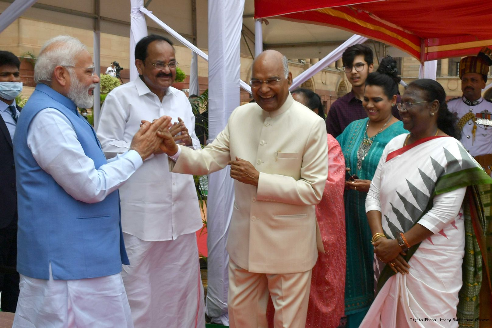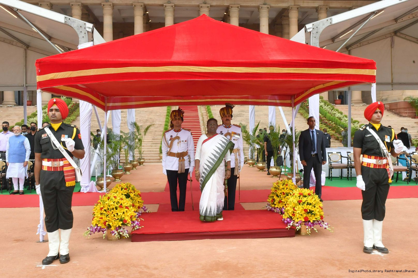 The President of India, Smt. Droupadi Murmu taking the National Salute and inspecting the Tri Services Guard of Honour, at Rashtrapati Bhavan on July 25, 2022.