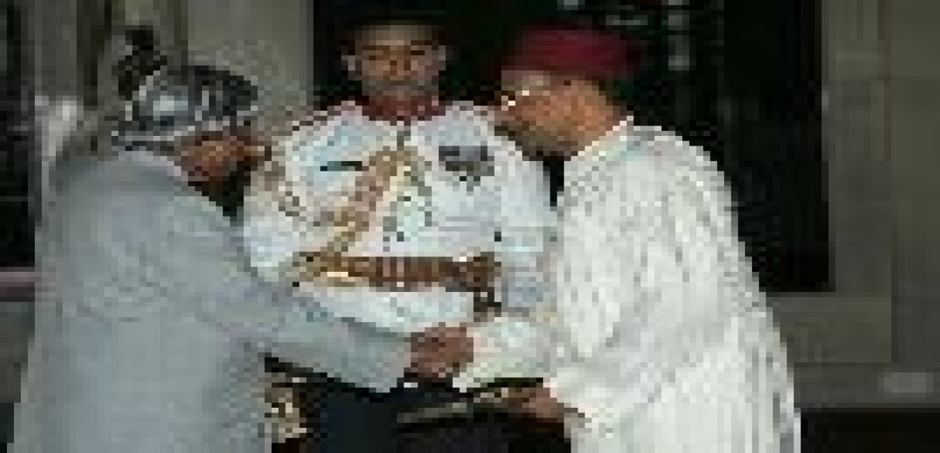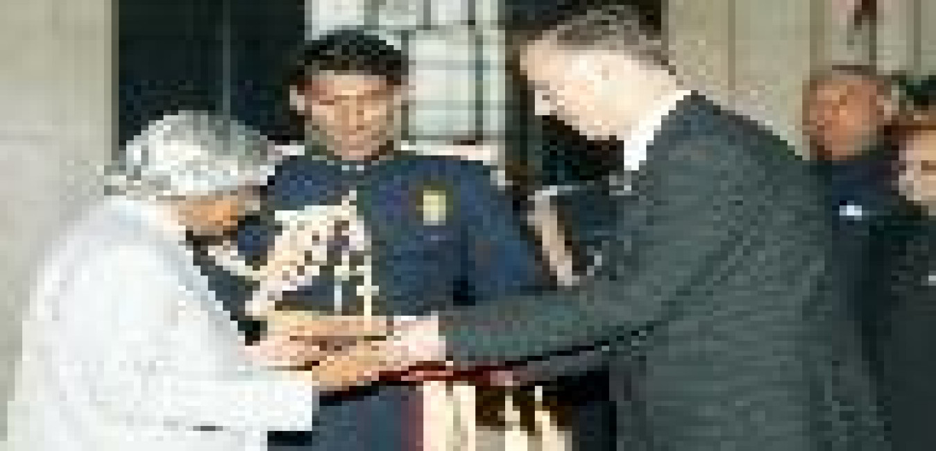 The High Commissioner-Designate of Maldives to India, HE Lt Gen Anbaree Abdul Sattar Adam presenting his credentials to the President of India, Dr A P J Abdul Kalam at the Ashok Hall of Rashtrapati Bhavan in New Delhi on Nov 30, 2004