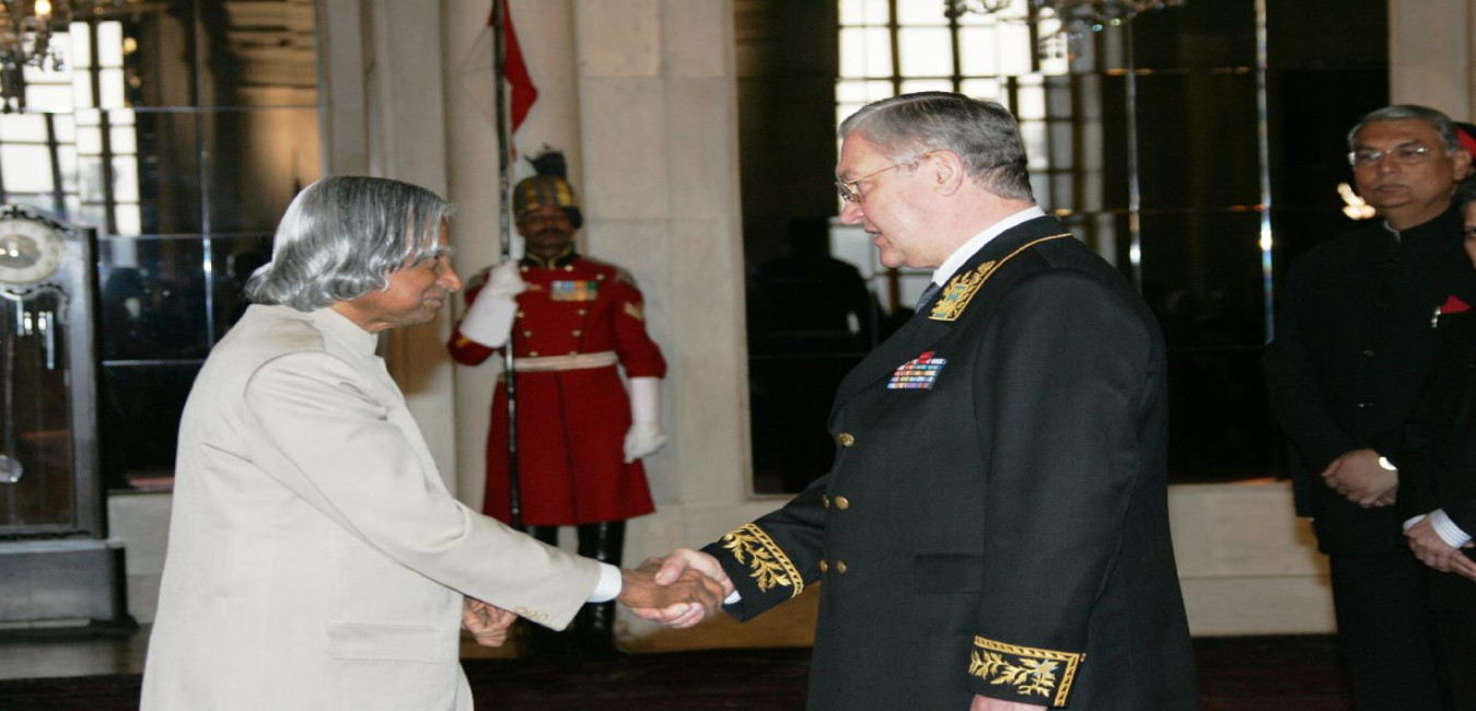 The Ambassador-Designate of Republic of Belarus to India, HE Mr Oleg Laptenok presenting his credentials to the President of India, Dr A P J Abdul Kalam at the Ashok Hall of Rashtrapati Bhavan in New Delhi on April 26, 2005