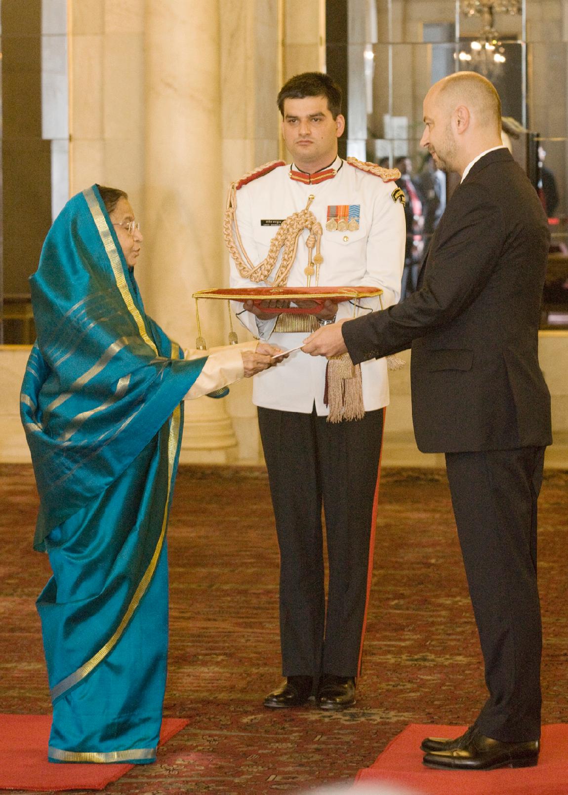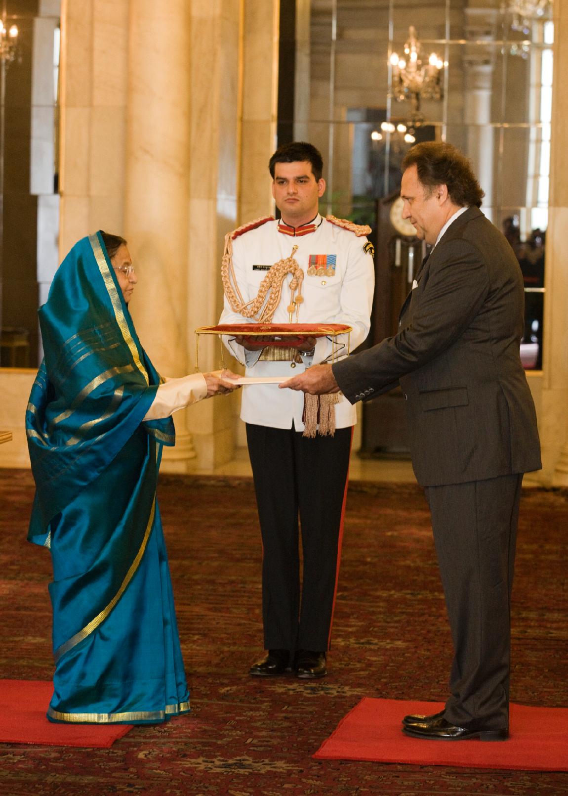 The Ambassador Designate of Israel, HE Mr Alon Ushpiz presenting his credentials to the President of India, Smt Pratibha Devisingh Patil at Rashtrapati Bhavan in New Delhi on Aug 12, 2011