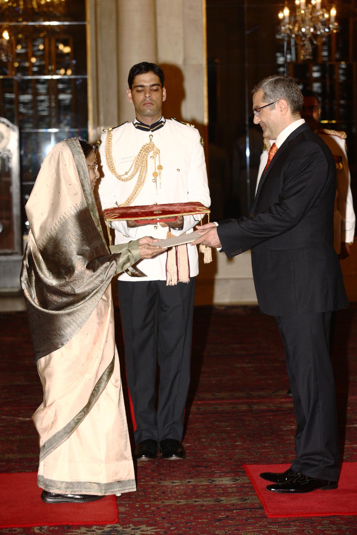 The Ambassador of Azerbaijan, His Excellency Mr Ibrahim Assad Oglu Hajiyev presenting his Credentials to the President of India, Smt Pratibha Devisingh Patil at Rashtrapati Bhavan in New Delhi on Nov 01, 2011