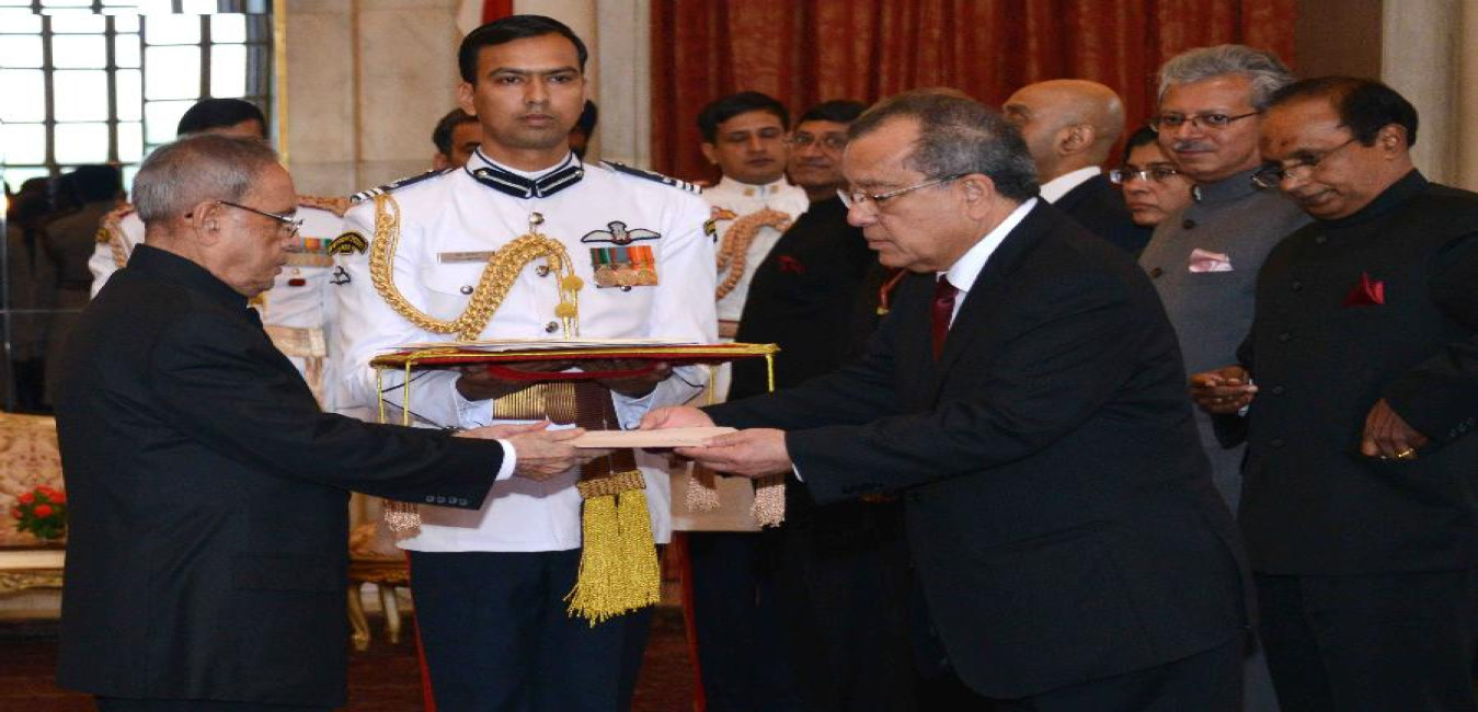 The High Commissioner-Designate of Bangladesh, HE Mr Syed Muazzem Ali presenting his credentials to the President of India, Shri Pranab Mukherjee at Rashtrapati Bhavan in New Delhi on Dec 09, 2014