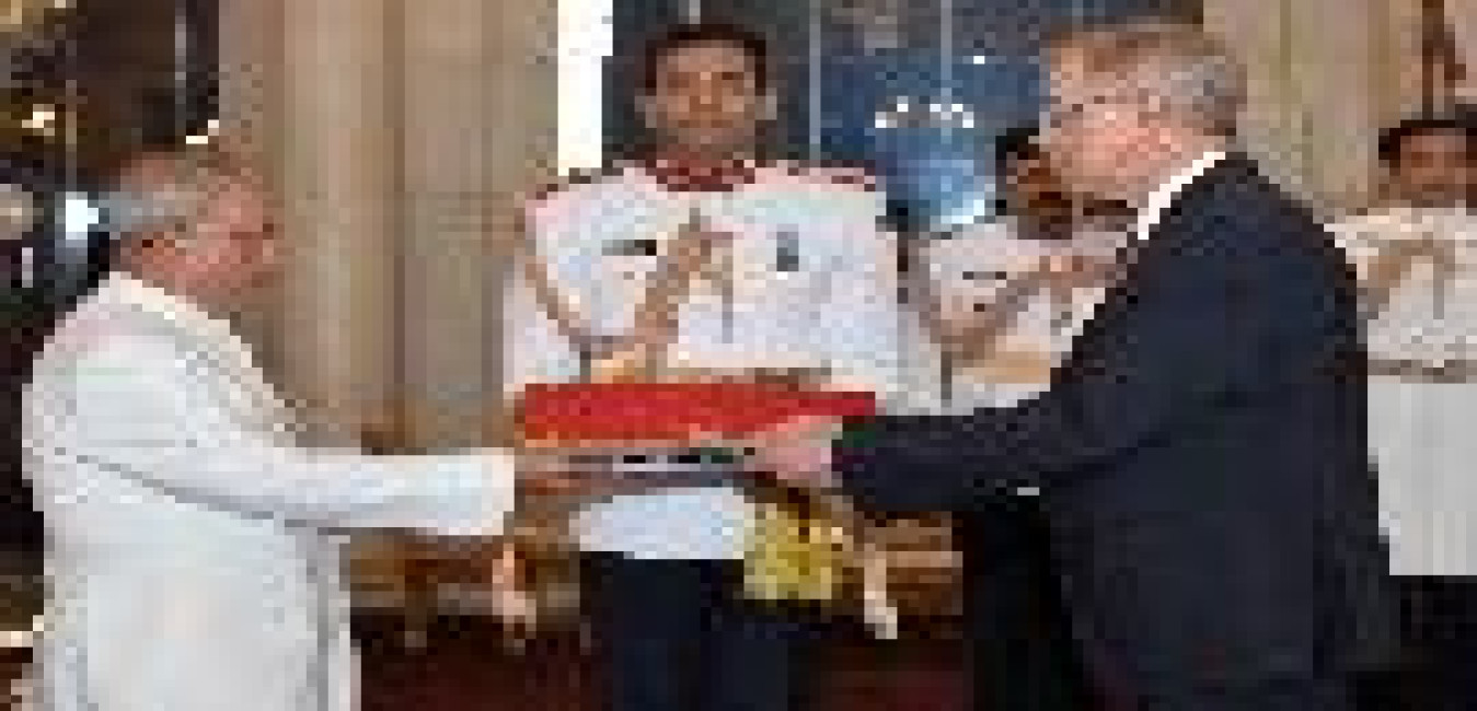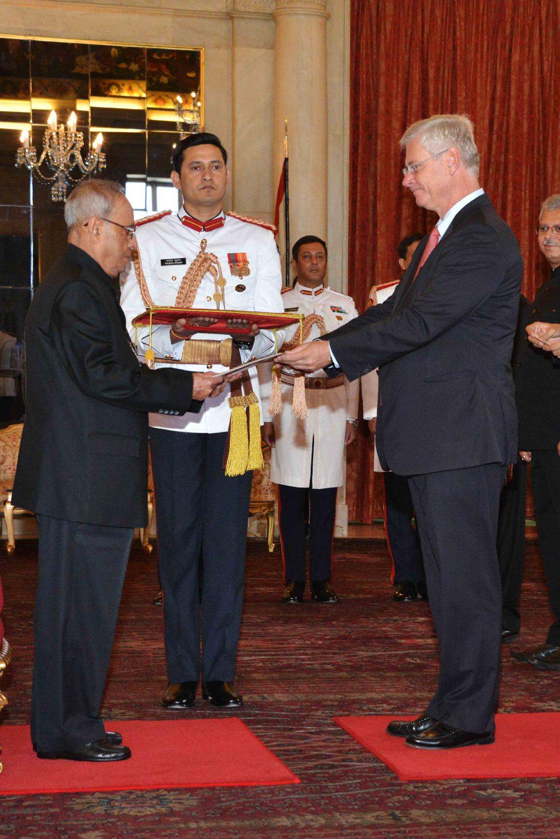 The Ambassador-designate of the Kingdom of Norway, HE Mr. Nils Ragnar Kamsvag presenting his Credentials to the President of India, Shri Pranab Mukherjee, at Rashtrapati Bhavan, in New Delhi on September 28, 2015.