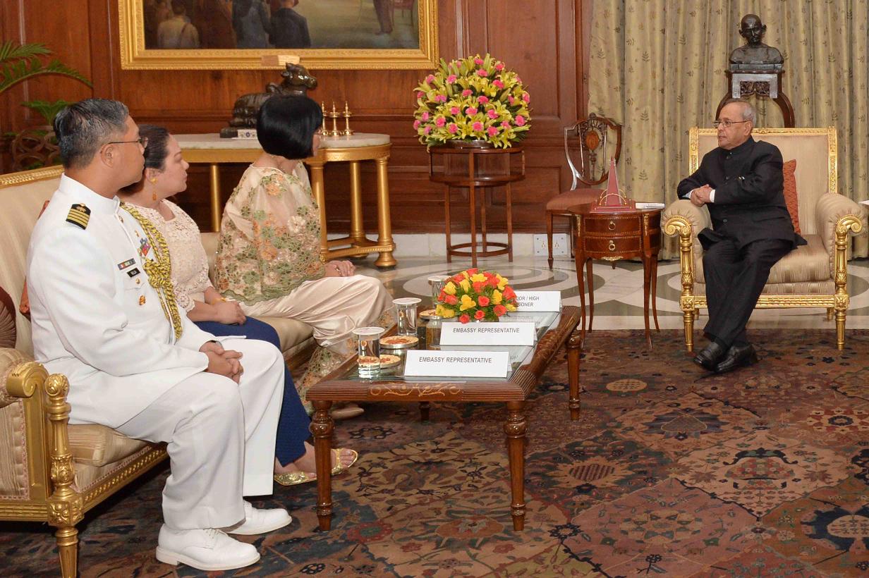 The Ambassador-designate of Republic of Philippines, Her Excellency Mrs. MA Teresita C. Daza presenting her Credentials to the President of India, Shri Pranab Mukherjee, at Rashtrapati Bhavan, in New Delhi on August 28, 2015.
