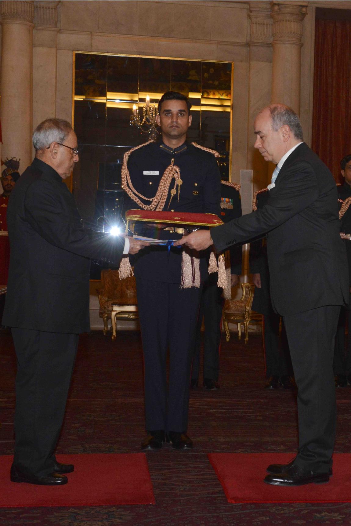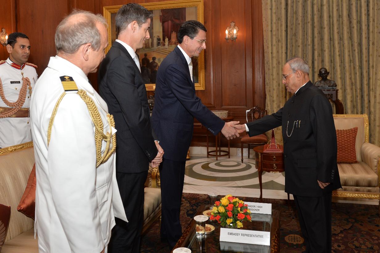 The Ambassador -designate of the Federative Republic of Brazil, HE Mr. Tovar da Silva Nunes presenting his Credentials to the President of India, Shri Pranab Mukherjee, at Rashtrapati Bhavan, in New Delhi on September 02, 2015.