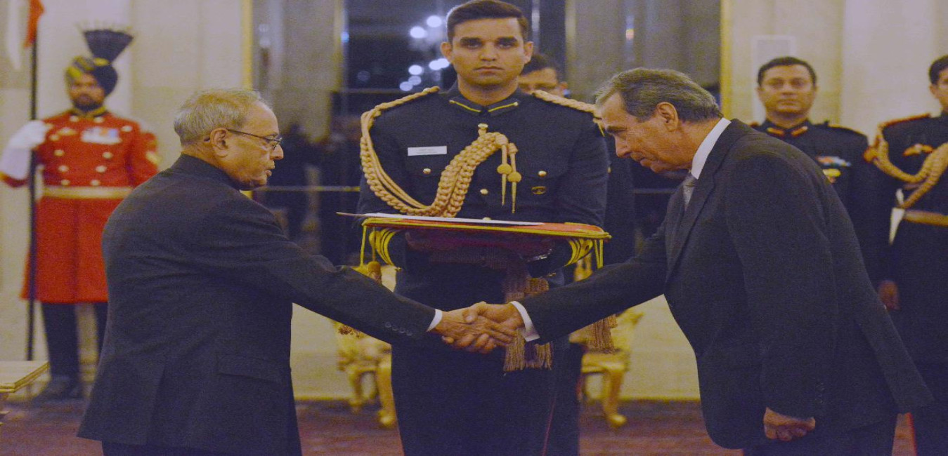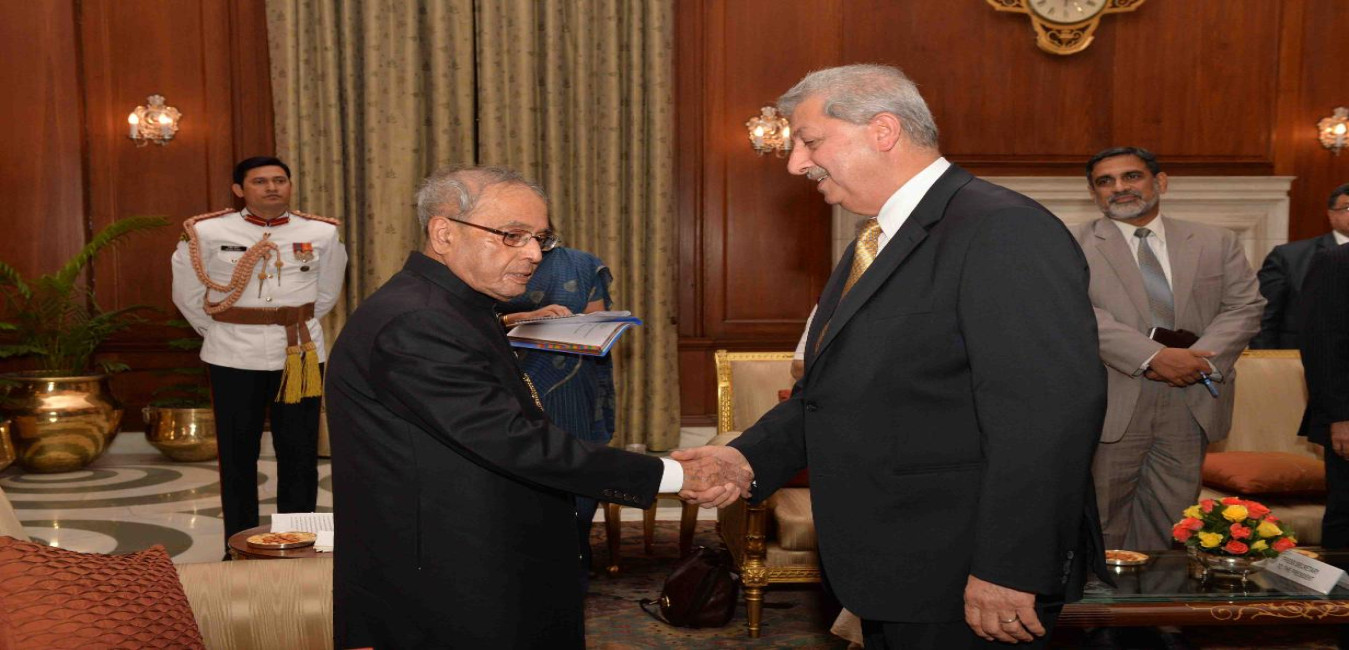 The High Commissioner-Designate of Guyana, H.E. Dr. David Goldwin Pollard presenting his credentials to the President of India, Shri Pranab Mukherjee, at Rashtrapati Bhavan on September 21, 2016.