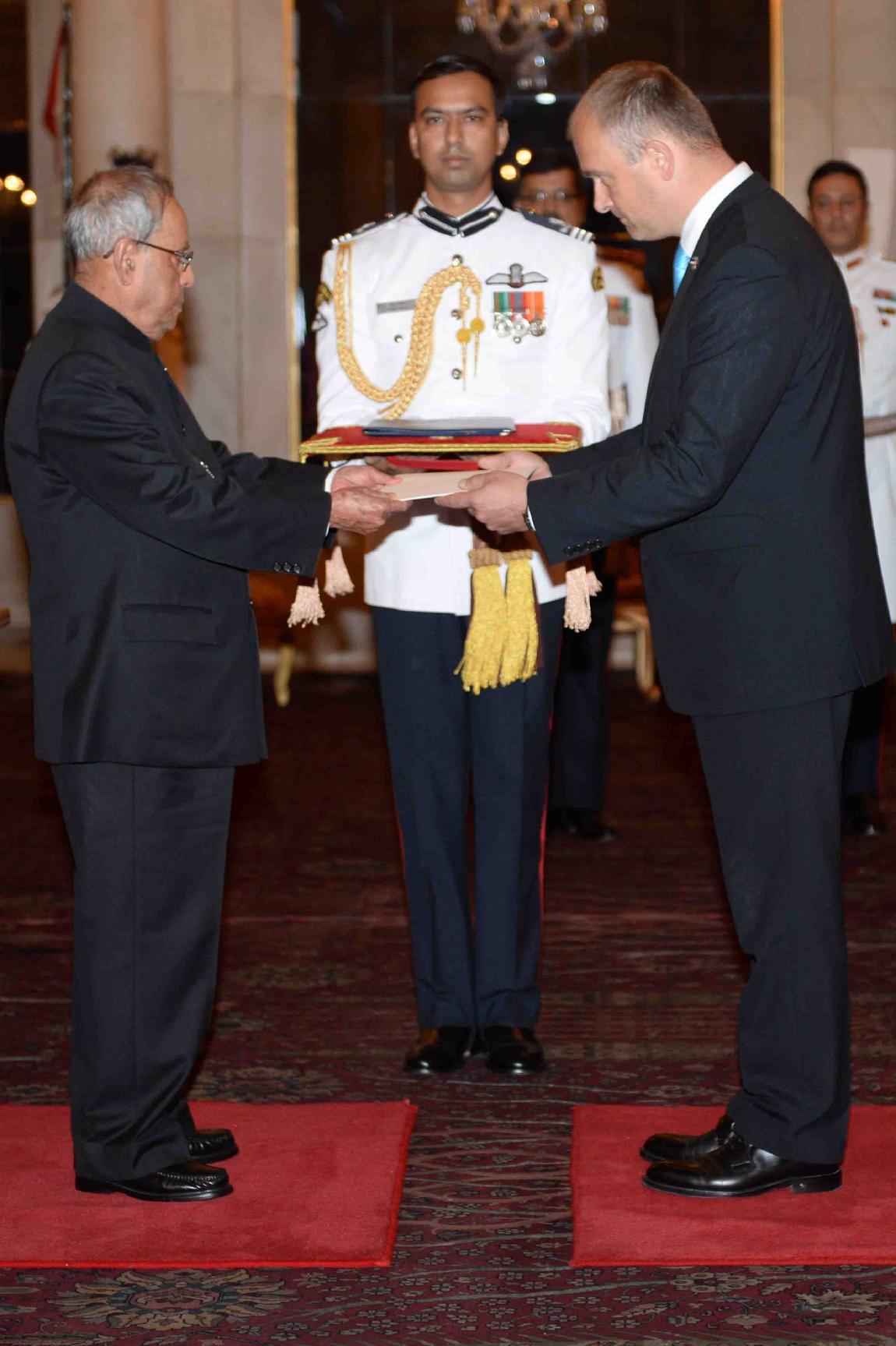 The Ambassador-designate of Ireland, HE Mr. Brian McElduff presenting his Credentials to the President of India, Shri Pranab Mukherjee, at Rashtrapati Bhavan on February 03, 2016.