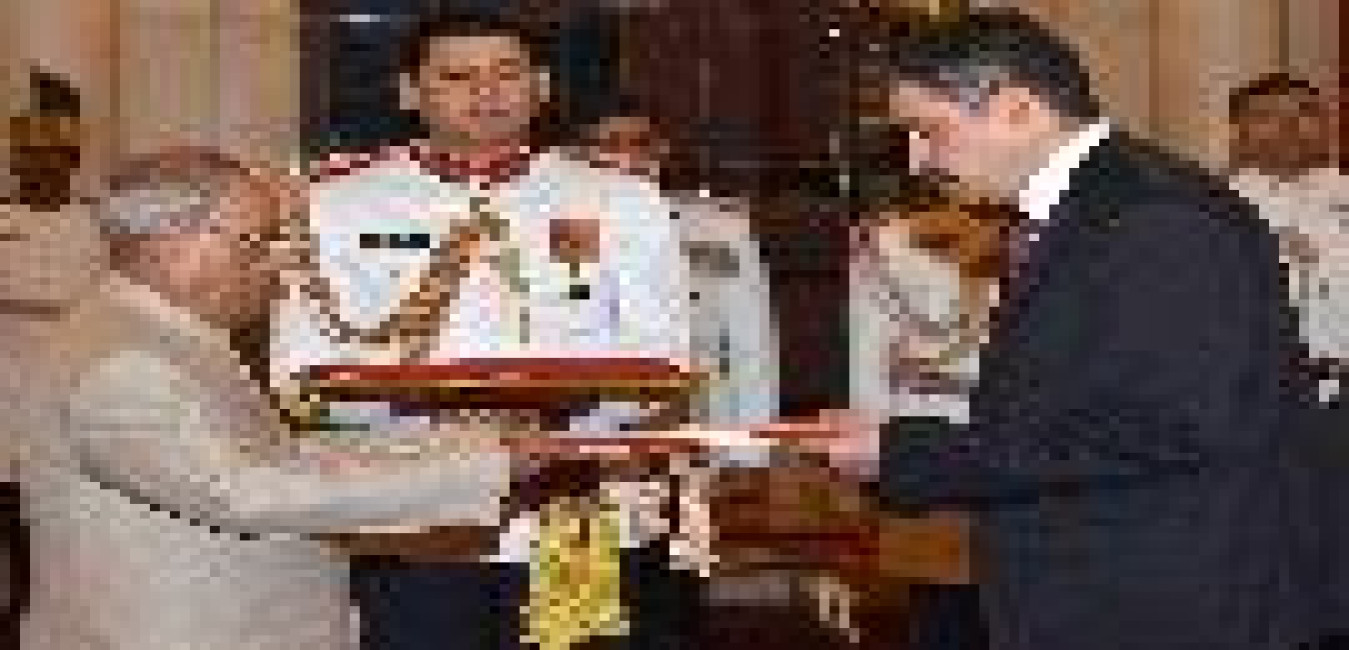 The Ambassador-designate of Nepal, H.E. Mr. Deep Kumar Upadhyay presenting his credentials to the President of India, Shri Pranab Mukherjee, at Rashtrapati Bhavan on November 30, 2016.