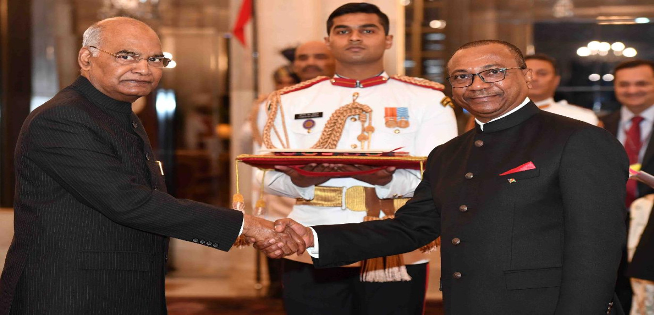 The High Commissioner-designate of the Republic of Seychelles, H.E. Mr. Thomas Selby Pillay presenting his credentials to the President of India, Shri Ram Nath Kovind, at Rashtrapati Bhavan on March 13, 2019.