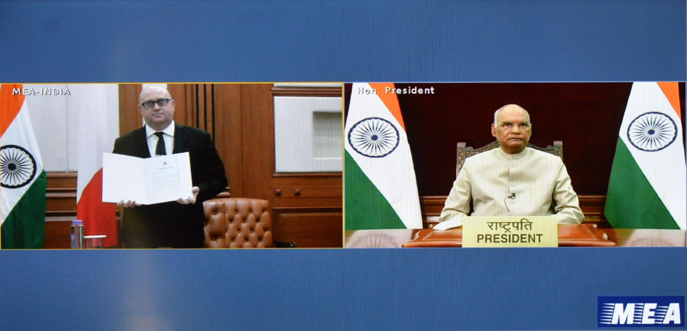 The President of India, Shri Ram Nath Kovind receives credentials from H.E. Mr. Reuben Gauci, High Commissioner-designate of Malta to India, through video conferencing, at Rashtrapati Bhavan on October 14, 2020.