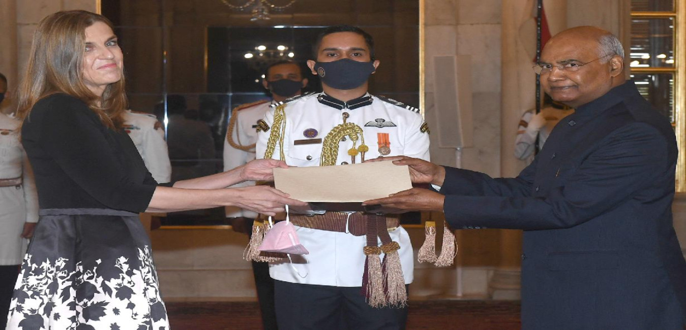 The Ambassador-designate of the Republic of Slovenia, H.E. Ms. Mateja Vodeb Ghosh presenting her credentials to the President of India, Shri Ram Nath Kovind, at Rashtrapati Bhavan on October 26, 2021.