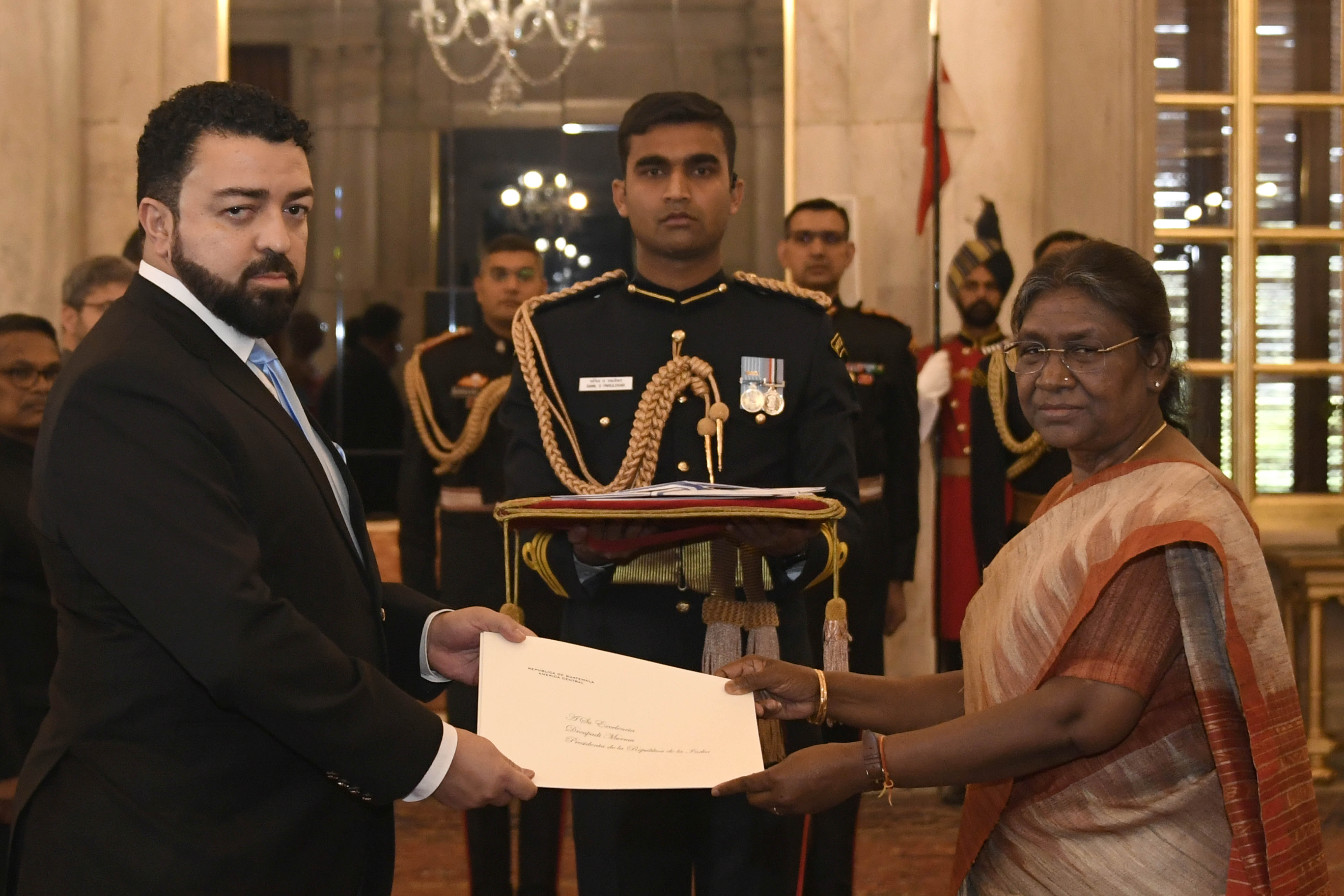 The Ambassador of the Republic of Guatemala, H.E. Mr. Omar Lisandro Castaneda Solares presenting his credentials to the President of India, Smt. Droupadi Murmu, at Rashtrapati Bhavan on February 15, 2023.