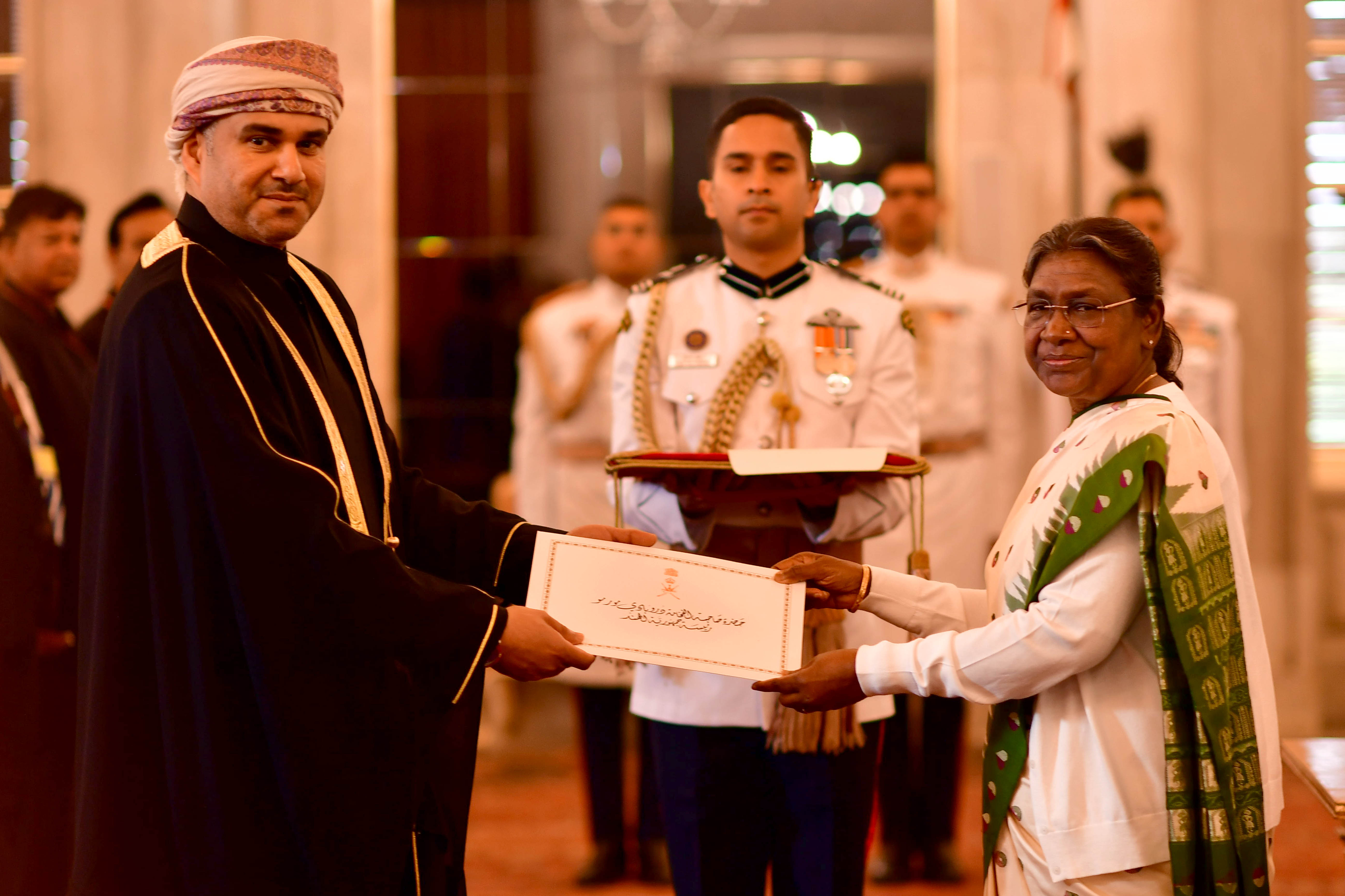 The Ambassador of the Sultanate of Oman, H.E. Mr. Issa Saleh Abdullah Saleh Al Shibani presenting his credentials to the President of India, Smt. Droupadi Murmu, at Rashtrapati Bhavan on February 24, 2023.