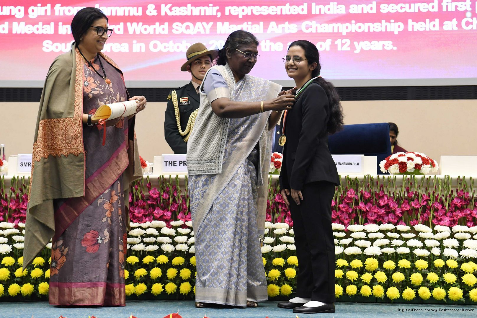Presenting the Pradhan Mantri Rashtriya Bal Puruskar (PMRBP) meeting with the President of India Smt. Droupadi Murmu at Rashtrapati Bhavan on January 23, 2023.