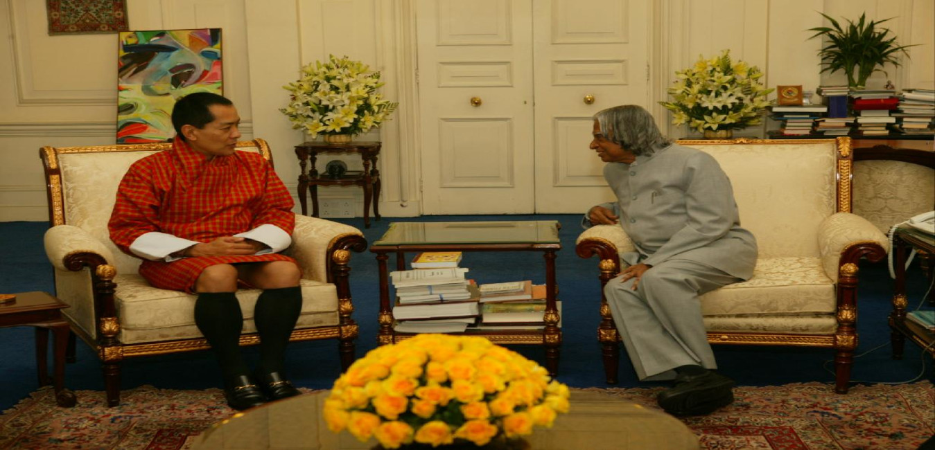 The Crown Prince of Bhutan King of Bhutan HRH Jigme Khesar Namgyel Wangchuck and his wife Majesty Jigme Singye Wangchuck calling on the President of India, Dr A P J Abdul Kalam at the Morning Room of Rashtrapati Bhavan in New Delhi on Nov 25, 2004