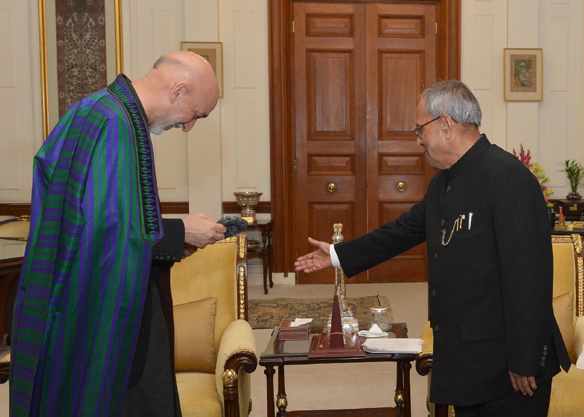 The President of the Islamic Republic of Afghanistan, HE Dr Hamid Karzai calling on the President of India, Shri Pranab Mukherjee at Rashtrapati Bhavan in New Delhi on Dec 13, 2013
