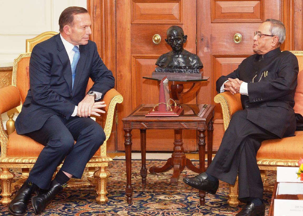 The Prime Minister of Australia, HE Mr Tony Abbott MP calling on the President of India, Shri Pranab Mukherjee at Rashtrapati Bhavan in New Delhi on Sep 05, 2014