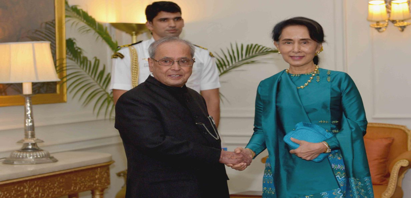 The State Counsellor of the Republic of Union Myanmar, H.E. Daw Aung San Suu Kyi calling on the President of India, Shri Pranab Mukherjee, at Rashtrapati Bhavan on October 18, 2016.